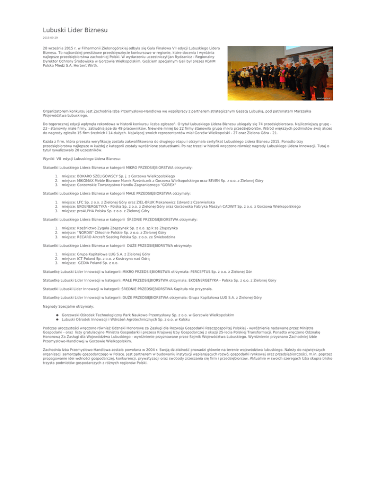 Lubuski Lider Biznesu 2015-09-29 28 września 2015 r. w Filharmonii Zielonogórskiej odbyła się Gala Finałowa VII edycji Lubuskiego Lidera Biznesu. To najbardziej prestiżowe przedsięwzięcie konkursowe w regionie, które docenia i wyróżnia najlepsze przedsiębiorstwa zachodniej Polski. W wydarzeniu uczestniczył Jan Rydzanicz - Regionalny Dyrektor Ochrony Środowiska w Gorzowie Wielkopolskim. Gościem specjalnym Gali był prezes KGHM Polska Miedź S.A. Herbert Wirth. Organizatorem konkursu jest Zachodnia Izba Przemysłowo-Handlowa we współpracy z partnerem strategicznym Gazetą Lubuską, pod patronatem Marszałka Województwa Lubuskiego. Do tegorocznej edycji wpłynęła rekordowa w historii konkursu liczba zgłoszeń. O tytuł Lubuskiego Lidera Biznesu ubiegały się 74 przedsiębiorstwa. Najliczniejszą grupę 23 - stanowiły małe firmy, zatrudniające do 49 pracowników. Niewiele mniej bo 22 firmy stanowiła grupa mikro przedsiębiorstw. Wśród większych podmiotów swój akces do nagrody zgłosiło 15 firm średnich i 14 dużych. Najwięcej swoich reprezentantów miał Gorzów Wielkopolski - 27 oraz Zielona Góra - 21. Każda z firm, która przeszła weryfikację została zakwalifikowana do drugiego etapu i otrzymała certyfikat Lubuskiego Lidera Biznesu 2015. Ponadto trzy przedsiębiorstwa najlepsze w każdej z kategorii zostały wyróżnione statuetkami. Po raz trzeci w historii wręczono również nagrody Lubuskiego Lidera Innowacji. Tutaj o tytuł rywalizowało 20 uczestników. Wyniki VII edycji Lubuskiego Lidera Biznesu: Statuetki Lubuskiego Lidera Biznesu w kategorii MIKRO PRZEDSIĘBIORSTWA otrzymały: 1. miejsce: BOKARO SZELIGOWSCY Sp. j. z Gorzowa Wielkopolskiego 2. miejsce: MIKOMAX Meble Biurowe Marek Rzeżniczek z Gorzowa Wielkopolskiego oraz SEVEN Sp. z o.o. z Zielonej Góry 3. miejsce: Gorzowskie Towarzystwo Handlu Zagranicznego "GOREX" Statuetki Lubuskiego Lidera Biznesu w kategorii MAŁE PRZEDSIĘBIORSTWA otrzymały: 1. miejsce: LFC Sp. z o.o. z Zielonej Góry oraz ZIEL-BRUK Makarewicz Edward z Czerwieńska 2. miejsce: EKOENERGETYKA - Polska Sp. z o.o. z Zielonej Góry oraz Gorzowska Fabryka Maszyn CADWIT Sp. z o.o. z Gorzowa Wielkopolskiego 3. miejsce: proALPHA Polska Sp. z o.o. z Zielonej Góry Statuetki Lubuskiego Lidera Biznesu w kategorii ŚREDNIE PRZEDSIĘBIORSTWA otrzymały: 1. miejsce: Rzeźnictwo Zyguła Zbąszynek Sp. z o.o. sp.k ze Zbąszynka 2. miejsce: "NORDIS" Chłodnie Polskie Sp. z o.o. z Zielonej Góry 3. miejsce: RECARO Aircraft Seating Polska Sp. z o.o. ze Świebodzina Statuetki Lubuskiego Lidera Biznesu w kategorii DUŻE PRZEDSIĘBIORSTWA otrzymały: 1. miejsce: Grupa Kapitałowa LUG S.A. z Zielonej Góry 2. miejsce: ICT Poland Sp. z o.o. z Kostrzyna nad Odrą 3. miejsce: GEDIA Poland Sp. z o.o. Statuetkę Lubuski Lider Innowacji w kategorii: MIKRO PRZEDSIĘBIORSTWA otrzymała: PERCEPTUS Sp. z o.o. z Zielonej Gór Statuetkę Lubuski Lider Innowacji w kategorii: MAŁE PRZEDSIĘBIORSTWA otrzymała: EKOENERGETYKA - Polska Sp. z o.o. z Zielonej Góry Statuetki Lubuski Lider Innowacji w kategorii: ŚREDNIE PRZEDSIĘBIORSTWA Kapituła nie przyznała. Statuetkę Lubuski Lider Innowacji w kategorii: DUŻE PRZEDSIĘBIORSTWA otrzymała: Grupa Kapitałowa LUG S.A. z Zielonej Góry Nagrody Specjalne otrzymały: Gorzowski Ośrodek Technologiczny Park Naukowo Przemysłowy Sp. z o.o. w Gorzowie Wielkopolskim Lubuski Ośrodek Innowacji i Wdrożeń Agrotechnicznych Sp. z o.o. w Kalsku Podczas uroczystości wręczono również Odznaki Honorowe za Zasługi dla Rozwoju Gospodarki Rzeczpospolitej Polskiej - wyróżnienie nadawane przez Ministra Gospodarki - oraz listy gratulacyjne Ministra Gospodarki i prezesa Krajowej Izby Gospodarczej z okazji 25-lecia Polskiej Transformacji. Ponadto wręczono Odznakę Honorową Za Zasługi dla Województwa Lubuskiego - wyróżnienie przyznawane przez Sejmik Województwa Lubuskiego. Wyróżnienie przyznano Zachodniej Izbie Przemysłowo-Handlowej w Gorzowie Wielkopolskim. Zachodnia Izba Przemysłowo-Handlowa została powołana w 2004 r. Swoją działalność prowadzi głównie na terenie województwa lubuskiego. Należy do największych organizacji samorządu gospodarczego w Polsce. Jest partnerem w budowaniu instytucji wspierających rozwój gospodarki rynkowej oraz przedsiębiorczości, m.in. poprzez propagowanie idei wolności gospodarczej, konkurencji, prywatyzacji oraz swobody zrzeszania się firm i przedsiębiorców. Aktualnie w swoich szeregach Izba skupia blisko trzysta podmiotów gospodarczych z różnych regionów Polski.