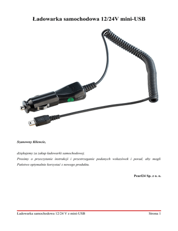 Ładowarka samochodowa 12/24V mini-USB Szanowny Kliencie, dziękujemy za zakup ładowarki samochodowej. Prosimy o przeczytanie instrukcji i przestrzeganie podanych wskazówek i porad, aby mogli Państwo optymalnie korzystać z nowego produktu. Pearl24 Sp. z o. o. Ładowarka samochodowa 12/24 V z mini-USB Strona 1 Bezpieczeństwo • UWAGA! Istnieje ryzyko porażenia prądem elektrycznym! Należy unikać kontaktu z napięciem sieciowym! • UWAGA! Istnieje niebezpieczeństwo zwarcia! Nie należy wkładać przedmiotów do otworów wentylacyjnych oraz gniazd! • Wszelkie modyfikacje produktu obniżają poziom jego bezpieczeństwa. UWAGA! Istnieje ryzyko obrażeń! • Należy korzystać z produktu w sposób do tego przeznaczony. Każde inne użycie może spowodować uszkodzenie produktu lub jego otoczenia. Opis i działanie Adapter USB do ładowania zamienia prąd zmienny 100-240 V na 5 V DC na wyjściu USB i jest przeznaczony dla urządzeń z mini-USB. Za pomocą kabla USB można ładować urządzenia mobilne. Uwaga! Prąd wejściowy (INPUT) urządzenia nie może przekraczać maksymalnego obciążenia (OUTPUT) adaptera do ładowania USB. Ładowarka samochodowa 12/24 V z mini-USB Strona 2 Dane techniczne • Napięcie wejściowe ładowarki USB / ładowarki samochodowej: 100-240 V AC / 12 V DC • Napięcie wyjściowe: 5 V DC • Prąd wyjściowy: na urządzeniu. Ważne wskazówki dotyczące utylizacji Urządzenia elektrycznego nie zalicza się do odpadów gospodarstwa domowego. W celu właściwej utylizacji urządzenia należy skontaktować się z organizacją odpowiedzialną za zbiórkę elektroodpadów w wybranej miejscowości. Deklaracja zgodności Produkt HZ-1708 jest zgodny z dyrektywą 2004/108/EG oraz 2006/95/EG: znak CE oznacza, że produkt spełnia podstawowe wymagania i wytyczne przepisów europejskich. Ładowarka samochodowa 12/24 V z mini-USB Strona 3