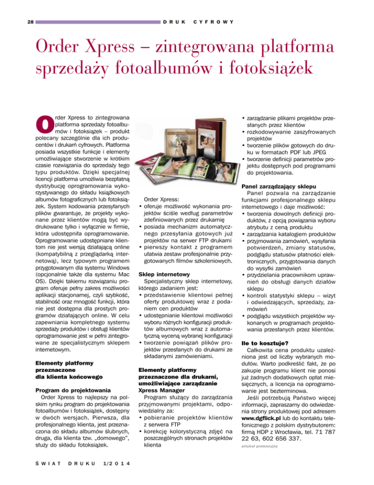 D R U K 28 C Y F R O W Y Order Xpress – zintegrowana platforma sprzedaży fotoalbumów i fotoksiążek O rder Xpress to zintegrowana platforma sprzedaży fotoalbumów i fotoksiążek – produkt polecany szczególnie dla ich producentów i drukarń cyfrowych. Platforma posiada wszystkie funkcje i elementy umożliwiające stworzenie w krótkim czasie rozwiązania do sprzedaży tego typu produktów. Dzięki specjalnej licencji platforma umożliwia bezpłatną dystrybucję oprogramowania wykorzystywanego do składu książkowych albumów fotograficznych lub fotoksiążek. System kodowania przesyłanych plików gwarantuje, że projekty wykonane przez klientów mogą być wydrukowane tylko i wyłącznie w firmie, która udostępniła oprogramowanie. Oprogramowanie udostępniane klientom nie jest wersją działającą online (kompatybilną z przeglądarką internetową), lecz typowym programem przygotowanym dla systemu Windows (opcjonalnie także dla systemu Mac OS). Dzięki takiemu rozwiązaniu program oferuje pełny zakres możliwości aplikacji stacjonarnej, czyli szybkość, stabilność oraz mnogość funkcji, która nie jest dostępna dla prostych programów działających online. W celu zapewniania kompletnego systemu sprzedaży produktów i obsługi klientów oprogramowanie jest w pełni zintegrowane ze specjalistycznym sklepem internetowym. Elementy platformy przeznaczone dla klienta końcowego Program do projektowania Order Xpress to najlepszy na polskim rynku program do projektowania fotoalbumów i fotoksiążek, dostępny w dwóch wersjach. Pierwsza, dla profesjonalnego klienta, jest przeznaczona do składu albumów ślubnych, druga, dla klienta tzw. „domowego”, służy do składu fotoksiążek. ś W I A T D R U K U 1/2 0 1 4 •zarządzanie plikami projektów przesłanych przez klientów •rozkodowywanie zaszyfrowanych projektów •tworzenie plików gotowych do druku w formatach PDF lub JPEG •tworzenie definicji parametrów projektu dostępnych pod programami do projektowania. Order Xpress: •oferuje możliwość wykonania projektów ściśle według parametrów zdefiniowanych przez drukarnię •posiada mechanizm automatycznego przesyłania gotowych już projektów na serwer FTP drukarni •pierwszy kontakt z programem ułatwia zestaw profesjonalnie przygotowanych filmów szkoleniowych. Sklep internetowy Specjalistyczny sklep internetowy, którego zadaniem jest: •przedstawienie klientowi pełnej oferty produktowej wraz z podaniem cen produktów •udostępnianie klientowi możliwości wyboru różnych konfiguracji produktów albumowych wraz z automatyczną wyceną wybranej konfiguracji •tworzenie powiązań plików projektów przesłanych do drukarni ze składanymi zamówieniami. Elementy platformy przeznaczone dla drukarni, umożliwiające zarządzanie Xpress Manager Program służący do zarządzania przyjmowanymi projektami, odpowiedzialny za: •pobieranie projektów klientów z serwera FTP •korekcję kolorystyczną zdjęć na poszczególnych stronach projektów klienta Panel zarządzający sklepu Panel pozwala na zarządzanie funkcjami profesjonalnego sklepu internetowego i daje możliwość: •tworzenia dowolnych definicji produktów, z opcją powiązania wyboru atrybutu z ceną produktu •zarządzania katalogiem produktów •przyjmowania zamówień, wysyłania potwierdzeń, zmiany statusów, podglądu statusów płatności elektronicznych, przygotowania danych do wysyłki zamówień •przydzielania pracownikom uprawnień do obsługi danych działów sklepu •kontroli statystyki sklepu – wizyt i odwiedzających, sprzedaży, zamówień •podglądu wszystkich projektów wykonanych w programach projektowania przesłanych przez klientów. Ile to kosztuje? Całkowita cena produktu uzależniona jest od liczby wybranych modułów. Warto podkreślić fakt, że po zakupie programu klient nie ponosi już żadnych dodatkowych opłat miesięcznych, a licencja na oprogramowanie jest bezterminowa. Jeśli potrzebują Państwo więcej informacji, zapraszamy do odwiedzenia strony produktowej pod adresem www.dgflick.pl lub do kontaktu telefonicznego z polskim dystrybutorem: firmą HDP z Wrocławia, tel. 71 787 22 63, 602 656 337. artykuł promocyjny
