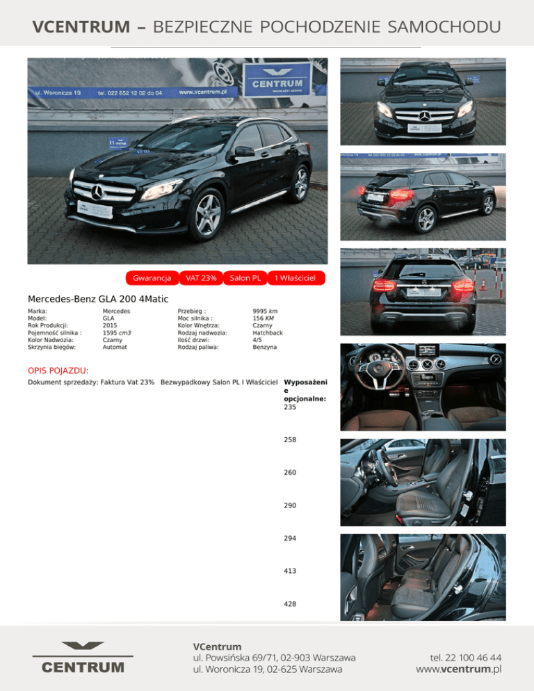 Mercedes-Benz GLA 200 4Matic Marka: Model: Rok Produkcji: Pojemność silnika : Kolor Nadwozia: Skrzynia biegów: Mercedes GLA 2015 1595 cm3 Czarny Automat Przebieg : Moc silnika : Kolor Wnętrza: Rodzaj nadwozia: Ilość drzwi: Rodzaj paliwa: 9995 km 156 KM Czarny Hatchback 4/5 Benzyna OPIS POJAZDU: Dokument sprzedaży: Faktura Vat 23% Bezwypadkowy Salon PL I Właściciel Wyposażeni e opcjonalne: 235 258 260 290 294 413 428 429 440 442 475 508 51U 523 538 580 600 614 682 840 873 890 927 950 B03 B51 D0A D0C D0D K11 P54 R01 U10 U25 U59 U60 U62 Cena katalogowa samochodu z wyposaże niem: Dodatkowe Wyposażenie ✓18-calowe felgi aluminiowe ✓Automatycznie przyciemniane wewnętrzne lusterko wsteczne ✓Elektrycznie sterowany hamulec postojowy ✓Elementy dekoracyjne aluminiowe ✓Kierownica wykończona skórą ✓Klimatyzacja automatyczna sterowana elektronicznie ✓Komputer pokładowy ✓Napęd 4Matic ✓Podgrzewane przednie fotele ✓Reflektory BiXenonowe Aktywne ✓Spryskiwacze ciśnieniowe lamp ✓System Start/Stop ✓Światła do jazdy dziennej LED ✓Tempomat ✓Czujniki parkowania tył i przód ✓Zawieszenie AGILITI CONTROL ✓Czujnik deszczu ✓Sportowe fotele Systemy Bezpieczeństwa ✓Mocowanie fotelików dziecięcych (ISOFIX) ✓Poduszka powietrzna kierowcy i pasażera ✓Poduszki przednie boczne ✓Poduszki tylne boczne Multimedia ✓Gniazdo AUX ✓Gniazdo USB / iPod® ✓Przyciski w kierownicy sterujące zestawem audio ✓Zestaw głośnomówiący Bluetooth FINANSOWANIE I UBEZPIECZENIA: Przykładowa rata miesięczna, wpłata 20%, okres leasingu/kredytu 48 miesięcy, 10% wykupu. Rata leasingu jest wartością netto bez vat. Rata: 2 027 Cena: 137 900 PLN PLN Niniejsza treść nie stanowi oferty w rozumieniu przepisów Kodeksu Cywilnego oraz opisu towaru ani zapewnienia w rozumieniu art. 4 Ustawy z dnia 27 lipca 2002r o szczególnych warunkach sprzedaży konsumenckiej. Powered by TCPDF (www.tcpdf.org)