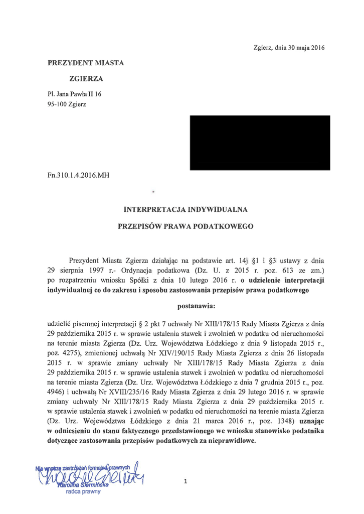 Zgierz, dnia 30 maja 2016 P R E Z Y D E N T MIASTA ZGIERZA PI. Jana Pawła II 16 95-100 Zgierz Fn.310.1.4.2016.MH I N T E R P R E T A C J A INDYWIDUALNA PRZEPISÓW PRAWA P O D A T K O W E G O Prezydent Miasta Zgierza działając na podstawie art. 14j §1 i §3 ustawy z dnia 29 sierpnia 1997 r.- Ordynacja podatkowa (Dz. U . z 2015 r. poz. 613 ze zm.) po rozpatrzeniu wniosku Spółki z dnia 10 lutego 2016 r. o udzielenie interpretacji indywidualnej co do zakresu i sposobu zastosowania przepisów prawa podatkowego postanawia: udzielić pisemnej interpretacji § 2 pkt 7 uchwały Nr XIII/178/15 Rady Miasta Zgierza z dnia 29 października 2015 r. w sprawie ustalenia stawek i zwolnień w podatku od nieruchomości na terenie miasta Zgierza (Dz. Urz. Województwa Łódzkiego z dnia 9 listopada 2015 r., poz. 4275), zmienionej uchwałą Nr XIV/190/15 Rady Miasta Zgierza z dnia 26 listopada 2015 r. w sprawie zmiany uchwały Nr XIII/178/15 Rady Miasta Zgierza z dnia 29 października 2015 r. w sprawie ustalenia stawek i zwolnień w podatku od nieruchomości na terenie miasta Zgierza (Dz. Urz. Województwa Łódzkiego z dnia 7 grudnia 2015 r., poz. 4946) i uchwałą Nr XVIII/235/16 Rady Miasta Zgierza z dnia 29 lutego 2016 r. w sprawie zmiany uchwały Nr XIII/178/15 Rady Miasta Zgierza z dnia 29 października 2015 r. w sprawie ustalenia stawek i zwolnień w podatku od nieruchomości na terenie miasta Zgierza (Dz. Urz. Województwa Łódzkiego z dnia 21 marca 2016 r., poz. 1348) uznając w odniesieniu do stanu faktycznego przedstawionego we wniosku stanowisko podatnika dotyczące zastosowania przepisów podatkowych za nieprawidłowe. 1 radca prawny UZASADNIENIE Zgodnie z art. 14j ustawy Ordynacja podatkowa interpretacje indywidualne co do zakresu i sposobu zastosowania prawa podatkowego stosownie do swojej właściwości wydaje wójt, burmistrz (prezydent miasta), starosta lub marszałek województwa. Interpretacje są wydawane w indywidualnych sprawach podatników, jeżeli elementy stanu faktycznego objęte wnioskiem o wydanie interpretacji w dniu złożenia wniosku nie są przedmiotem toczącego się postępowania podatkowego, kontroli podatkowej, postępowania kontrolnego organu kontroli skarbowej oraz że w tym zakresie sprawa nie została rozstrzygnięta co do jej istoty w decyzji lub postanowieniu organu podatkowego lub organu kontroli skarbowej. Stan faktyczny przedstawiony przez podatnika: jest podmiotem leczniczym w rozumieniu art. 4 ustawy z dnia 15 kwietnia 2011 r. o działalności leczniczej (Dz. U . z 2015 r. poz. 618 ze zm.). Spółka prowadzi działalność leczniczą na gruncie obejmującym działki oznaczone numerami ujawnione w księgach wieczystych stanowiących wyłączną własność , o łącznej powierzchni W dniu 23 lipca 2014 r. przy ulicy dzierżawiła). ustanowił na rzecz użytkowanie nieruchomości położonej w Zgierzu (wcześniej nieruchomość tę Spółka w deklaracjach na podatek od nieruchomości (łącznie z ostatnią złożoną 19 stycznia 2016 r.) jako przedmiot opodatkowania wskazywała: • powierzchnię użytkowanych gruntów z wyłączeniem gruntu znajdującego się po obrysie budynku szpitalnego wraz z łącznikiem - to jest • powierzchnię budynków bez owierzchni budynku szpitalnego wraz z łącznikiem - to jest ; powierzchnię budynków związanych z prowadzeniem działalności gospodarczej przez pięciu podnajemców- • i obliczała podatek od wymienionych powierzchni. Organ podatkowy ustalił, iż w deklaracji na 2016 rok podatnik jako przedmiot opodatkowania wykazał również budowle związane z prowadzeniem działalności gospodarczej. 2 Pytanie podatnika: W związku z przedstawionym stanem faktycznym w Zgierzu stoi na stanowisku, że należy wyjaśnić, jak interpretować użyte w uchwale nr XIII/178/15 Rady Miasta Zgierza z dnia 29 października 2015 r. sformułowania „lecznictwo zamknięte" oraz „grunty zajęte na potrzeby usług w zakresie lecznictwa zamkniętego". Wnioskodawca zwrócił się o potwierdzenie, że: - pojęcie „lecznictwo zamknięte" obecnie nie jest pojęciem ustawowym i nie funkcjonuje w polskim systemie ochrony zdrowia, w związku z czym zapis § 2 pkt. 7 uchwały nr XIII/178/15 należy odnieść do współcześnie funkcjonujących pojęć "świadczenia zdrowotne" i „działalność lecznicza"; - przez grunty zajęte na potrzeby usług w zakresie świadczenia zdrowotnych i działalności leczniczej należy rozumieć całość budynków, budowli i gruntów kompleksowo wykorzystywanych na prowadzenie działalności leczniczej i udzielanie świadczeń zdrowotnych, to jest całą użytkowaną nieruchomość na której zorganizowany jest podmiot leczniczy, a nie tylko części nieruchomości w obrysie fundamentów budynku szpitalnego wraz z łącznikiem. Stanowisko podatnika: Podatnik wskazał we wniosku, iż pojęcie „lecznictwo zamknięte" obecnie nie jest pojęciem ustawowym i nie funkcjonuje w polskim systemie ochrony zdrowia. Termin ten był zdefiniowany w nieobowiązującej już ustawie z dnia 5 lipca 2001 r. o cenach, która określała, że „lecznictwo zamknięte" to „podmioty lecznicze wykonujące działalność leczniczą w rodzaju stacjonarne i całodobowe świadczenia zdrowotne w rozumieniu przepisów 0 działalności leczniczej". Obecnie pojęcie to używane jest tylko potocznie. Według Słownika języka polskiego PWN jest to „ leczenie chorych w szpitalach i sanatoriach." W związku z tym podatnik stwierdził, iż zapis § 2 pkt 7 uchwały nr XIII/178/15 należy odnieść do współcześnie funkcjonujących pojęć "świadczenia zdrowotne" 1 „działalność lecznicza". Zdaniem podatnika podobny sposób wykładni zastosował Wojewódzki Sąd Administracyjny w Szczecinie w wyroku z dnia 4 czerwca 2014 r., sygn. akt I SA/Sz 3/14 dotyczącym interpretacji pojęcia zakładu lecznictwa uzdrowiskowego, w którym Sąd odwołał się do ogólnych pojęć wynikających z ustawy o działalności leczniczej. Zdani
