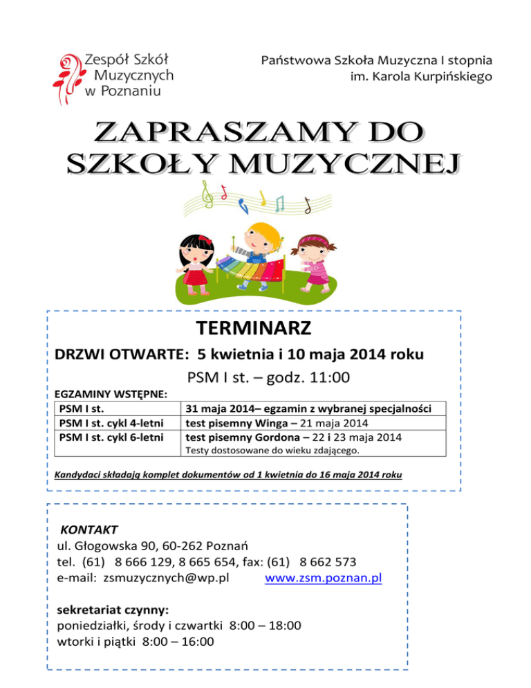 Państwowa Szkoła Muzyczna I stopnia im. Karola Kurpińskiego TERMINARZ DRZWI OTWARTE: 5 kwietnia i 10 maja 2014 roku KONTAKT PSM I st. – godz. 11:00 ul. Głogowska 90, 60-262 Poznań EGZAMINY WSTĘPNE: tel. (61) 8 666 129, 8 665 654, fax: (61) 8 662 573 PSMe-mail: I st. 31 maja 2014– egzamin z wybranej specjalności [email protected] www.zsm.poznan.pl PSMsekretariat I st. cykl 4-letni czynny: test pisemny Winga – 21 maja 2014 PSMponiedziałki, I st. cykl 6-letni test pisemny środy i czwartki 8:00Gordona – 18:00 – 22 i 23 maja 2014 dostosowane do wieku zdającego. wtorki i piątki 8:00 –Testy 16:00 Kandydaci składają komplet dokumentów od 1 kwietnia do 16 maja 2014 roku KONTAKT ul. Głogowska 90, 60-262 Poznań tel. (61) 8 666 129, 8 665 654, fax: (61) 8 662 573 e-mail: [email protected] www.zsm.poznan.pl sekretariat czynny: poniedziałki, środy i czwartki 8:00 – 18:00 wtorki i piątki 8:00 – 16:00 PSM I st. im. K. Kurpińskiego w Zespole Szkół Muzycznych jest JEDYNĄ w Poznaniu szkołą muzyczną rekrutujacą dzieci i młodzież z różnych roczników, co oznacza, że kandydatami do nauki w naszej szkole mogą być uczniowie wszystkich klas szkoły podstawowej i gimnazjum. Zajęcia odbywają się w godzinach popołudniowych i są bezpłatne. 1. O przyjęcie do klasy pierwszej cyklu sześcioletniego (C6) PSM I stopnia w 2014 roku mogą ubiegać się kandydaci, którzy kończą w tym roku 5 lat i mają nie więcej niż 8 lat. Specjalizacje: fortepian, akordeon, skrzypce, wiolonczela, kontrabas, gitara, flet, trąbka, perkusja. 2. O przyjęcie do klasy pierwszej cyklu czteroletniego (C4) PSM I stopnia w 2014 roku mogą ubiegać się kandydaci, którzy kończą w tym roku 9 lat i mają nie więcej niż 16 lat. Specjalizacje: fortepian, akordeon, skrzypce, altówka, wiolonczela, kontrabas, gitara, flet, obój,klarnet, saksofon, fagot, trąbka, róg, puzon, perkusja. 3. Rodzice dziecka ośmioletniego mogą wnioskować o przyjęcie go do cyklu czteroletniego. 4. Zespoły kwalifikacyjne mogą proponować inne przyporządkowanie dziecka ośmioletniego. 5. Zgłoszenie kandydata następuje przez złożenie w sekretariacie kwestionariusza wraz z załącznikami. Szczególnie ważnym załącznikiem jest zaświadczenie lekarskie o braku przeciwwskazań do kształcenia w wybranej specjalności muzycznej. 6. Kwalifikacja kandydatów do PSM I stopnia odbywa się na podstawie badania przydatności, którego celem jest określenie uzdolnień muzycznych, warunków fizycznych i predyspozycji do nauki gry na określonym instrumencie. 7. Badanie przydatności kandydatów obejmuje: Test uzdolnień muzycznych /dla C6 – test Gordona; dla C4 – test Winga/ Sprawdzian ustny uzdolnień muzycznych: zaśpiewanie przygotowanej piosenki, powtarzanie usłyszanych dźwięków, odróżnianie wysokich i niskich dźwięków, słyszenie ilości dźwięków we współbrzmieniach, rozpoznawanie melodii “wesołych” i “smutnych”; powtarzanie głosem krótkich melodii, wyklaskanie lub wystukanie usłyszanego motywu rytmicznego Sprawdzenie warunków fizycznych i predyspozycji do nauki gry na wybranym instrumencie. 8. Kandydaci posiadający przygotowanie muzyczne (umiejętność gry na instrumencie) mogą wykonać przygotowany program w ramach badania przydatności. 9. Zespoły przeprowadzające badania przydatności składają się z nauczycieli ZSM posiadających kwalifikacje odpowiadające przedmiotowi egzaminu. 10. Na podstawie protokołów egzaminów sporządza się listy zbiorcze w kolejności od największej do najmniejszej punktacji. Dyrektor Zespołu przygotowuje listę przyjęć uwzględniającą kolejność na listach zbiorczych i ustalone wcześniej limity przyjęć na poszczególne specjalności. 11. Decyzję o przyjęciu do klasy wyższej niż pierwsza podejmuje się na podstawie ustalenia odpowiedniego poziomu umiejętności i wiedzy kandydata. STOWARZYSZENIE MUZYCZNE VIVIDUS przy Zespole Szkół Muzycznych w Poznaniu Stowarzyszenie działa od 1995 roku. Jego celem jest wspomaganie działalności Zespołu Szkół Muzycznych w Poznaniu, pielęgnowanie tradycji szkół skupionych w Zespole, opieka nad dziećmi i młodzieżą uzdolnioną muzycznie, szerzenie wiedzy muzycznej i umuzykalnianie poprzez organizowanie różnych form usług pedagogicznych. W ramach Stowarzyszenia działają: SZKÓŁKA MUZYCZNA indywidualna nauka gry na instrumentach oraz śpiewu MUZYCZNA KRAINA zajęcia dla dzieci od 3 do 6 lat SZKÓŁKA MUZYCZNA jest placówką edukacyjną kształcącą zarówno uczniów początkujących jak i zaawansowanych w zakresie: gry na instrumentach muzycznych: * fortepian, akordeon, skrzypce, flet, altówka, wiolonczela, kontrabas, obój, gitara, klarnet, fagot, puzon, saksofon, trąbka, róg, perkusja *śpiewu solowego *muzyki rozrywkowej Lekcje odbywają się indywidualnie z nauczycielem we wspólnie uzgodnionym terminie. Gry uczą nauczyciele Zespołu Szkół Muzycznych w Poznaniu, którzy z doskonałym podejściem pedagogicznym potrafią przekazać wiedzę i technikę gry. Nauka w szkółce jest odpłatna i trwa dowolny okres, zależnie od potrzeb i możliwości ucznia. Zapisy trwają przez cały rok szkolny! Stowarzyszenie organizuje KURSY PRZYGOTOWAWCZE do szkół Zespołu, które w tym roku szkolnym odbędą się: 10, 17 i 24 maja. Zajęcia dla kandydatów do PSM I st. poprowadzą p. Małgorzata Karpińska i p. Joanna Piechowiak. MUZYCZNA KRAINA Rytmika i zajęcia z plastyki dla dzieci w wieku od 3 do 6 lat. Muzyczna Kraina jest miejscem szczególnym, bo przez zaproszenie do świata dźwięków korzystnie wpływa na rozwój dziecka. Różnego rodzaju zabawy z udziałem muzyki wspomagają rozwój emocjonalny, fizyczny, estetyczny oraz społeczny dziecka. Dzieci podczas zajęć poznają tajniki rytmu, tempa, dynamiki, rozwijają swój słuch i wrażliwość artystyczną. Ćwiczenia, takie jak śpiewanie piosenek, słuchanie muzyki, gra na instrumentach, ćwiczenia poczucia rytm