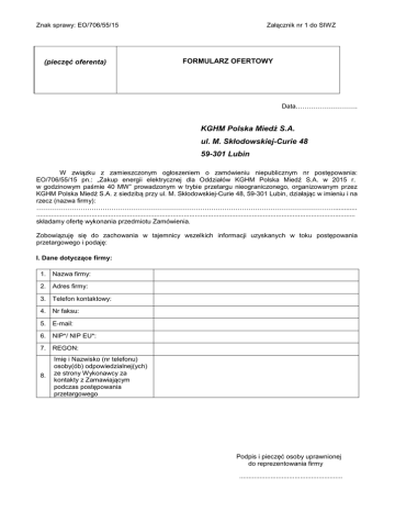 Znak sprawy: EO/706/55/15 (pieczęć oferenta) Załącznik nr 1 do SIWZ FORMULARZ OFERTOWY Data………………………. KGHM Polska Miedź S.A. ul. M. Skłodowskiej-Curie 48 59-301 Lubin W związku z zamieszczonym ogłoszeniem o zamówieniu niepublicznym nr postępowania: EO/706/55/15 pn.: „Zakup energii elektrycznej dla Oddziałów KGHM Polska Miedź S.A. w 2015 r. w godzinowym paśmie 40 MW” prowadzonym w trybie przetargu nieograniczonego, organizowanym przez KGHM Polska Miedź S.A. z siedzibą przy ul. M. Skłodowskiej-Curie 48, 59-301 Lubin, działając w imieniu i na rzecz (nazwa firmy): ………………………………………………………………………………………………………………………............ ............................................................................................................................................................................. składamy ofertę wykonania przedmiotu Zamówienia. Zobowiązuję się do zachowania w tajemnicy wszelkich informacji uzyskanych w toku postępowania przetargowego i podaję: I. Dane dotyczące firmy: 1. Nazwa firmy: 2. Adres firmy: 3. Telefon kontaktowy: 4. Nr faksu: 5. E-mail: 6. NIP*/ NIP EU*: 7. REGON: 8. Imię i Nazwisko (nr telefonu) osoby(ób) odpowiedzialnej(ych) ze strony Wykonawcy za kontakty z Zamawiającym podczas postępowania przetargowego Podpis i pieczęć osoby uprawnionej do reprezentowania firmy ........................................................ Znak sprawy: EO/706/55/15 Załącznik nr 1 do SIWZ II. Warunki handlowe oferty: Wariant I - sprzedaż energii elektrycznej w II kwartale 2015 r. 1. Cena energii elektrycznej przeznaczonej na użytek własny odbiorcy przemysłowego (energia konwencjonalna + świadectwa efektywności energetycznej – tzw. białe certyfikaty); Cena - ..……………………………………zł/MWh Słownie:……………………………………………….. 2. Cena energii elektrycznej przeznaczonej na użytek własny w przypadku nie uzyskania statusu odbiorcy przemysłowego; Cena - ..……………………………………zł/MWh 3. Cena energii elektrycznej przeznaczonej do dalszej odsprzedaży. Cena - ..……………………………………zł/MWh Słownie:……………………………………………….. Słownie:……………………………………………….. Wariant II – sprzedaż energii elektrycznej w III kwartale 2015 r. 1. Cena energii elektrycznej przeznaczonej na użytek własny odbiorcy przemysłowego (energia konwencjonalna + świadectwa efektywności energetycznej – tzw. białe certyfikaty); Cena - ..……………………………………zł/MWh Słownie:……………………………………………….. 2. Cena energii elektrycznej przeznaczonej na użytek własny w przypadku nie uzyskania statusu odbiorcy przemysłowego; Cena - ..……………………………………zł/MWh 3. Cena energii elektrycznej przeznaczonej do dalszej odsprzedaży. Cena - ..……………………………………zł/MWh Słownie:……………………………………………….. Słownie:……………………………………………….. Wariant III – sprzedaż energii elektrycznej w II i III kwartale 2015 r. 1. Cena energii elektrycznej przeznaczonej na użytek własny odbiorcy przemysłowego (energia konwencjonalna + świadectwa efektywności energetycznej – tzw. białe certyfikaty); Cena - ..……………………………………zł/MWh Słownie:……………………………………………….. 2. Cena energii elektrycznej przeznaczonej na użytek własny w przypadku nie uzyskania statusu odbiorcy przemysłowego; Cena - ..……………………………………zł/MWh 3. Cena energii elektrycznej przeznaczonej do dalszej odsprzedaży. Cena - ..……………………………………zł/MWh Słownie:……………………………………………….. Słownie:……………………………………………….. II. Spełnienie wymagań Zamawiającego przez Wykonawcę: Składając ofertę (zgodnie z wymaganiami zawartymi we Wstępnej Specyfikacji Istotnych Warunków Zamówienia) oświadczam, że: 1. Posiadamy uprawnienia do wykonywania określonej działalności i czynności zgodnie z wymogami ustawowymi będących przedmiotem niniejszego zamówienia. 2. Posiadamy niezbędną wiedzę i doświadczenie oraz dysponujemy potencjałem technicznym i osobami Podpis i pieczęć osoby uprawnionej do reprezentowania firmy ........................................................ Znak sprawy: EO/706/55/15 Załącznik nr 1 do SIWZ zdolnymi do wykonywania zamówienia. 3. W stosunku do naszej firmy otwarto/nie otwarto* likwidację/likwidacji* i ogłoszono/nie ogłoszono* upadłość/upadłości* 4. Znajdujemy się w sytuacji ekonomicznej i finansowej zapewniającej wykonanie zamówienia. 5. Nie jesteśmy w sporze sądowym z KGHM Polska Miedź S.A. lub spółką zależną oraz nie zostało wydane żadne orzeczenie, z którego wynika, że KGHM Polska Miedź S.A. lub spółce zależnej przysługują roszczenia odszkodowawcze w stosunku do Wykonawcy. 6. Nie podlegamy wykluczeniu z postępowania o udzielenie zamówienia na podstawie §12 ust. 1 Zasad wyboru wykonawców robót i usług, dostawców wyrobów oraz trybu zawierania umów na rzecz KGHM Polska Miedź S.A. 7. Oferowany przedmiot zamówienia jest wolny od wad prawnych i praw majątkowych osób trzecich. 8. Zapoznaliśmy się ze Specyfikacją Istotnych Warunków Zamówienia, akceptujemy ją i nie wnosimy do niej zastrzeżeń (wraz z ewentualnymi zmianami wynikającymi z aktualizacji SIWZ przez Zamawiającego oraz z odpowiedzi na propozycje kierowane przez Wykonawców do SIWZ). 9. Jesteśmy związani ofertą do dnia 27.02.2015r. do godz. 17.00, a w przypadku wygrania przetargu do czasu zawarcia umowy. 10. Oświadczamy, że zapoznaliśmy się z szablonem umowy, nie wnosimy uwag i zobowiązujemy się w prz