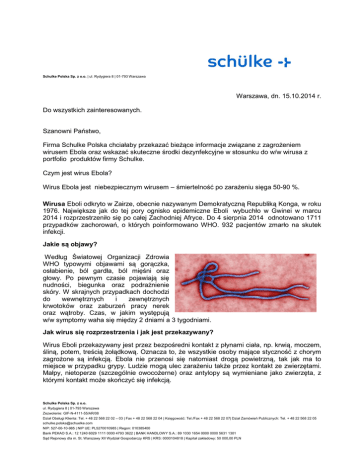 Schulke Polska Sp. z o.o. | ul. Rydygiera 8 | 01-793 Warszawa Warszawa, dn. 15.10.2014 r. Do wszystkich zainteresowanych. Szanowni Państwo, Firma Schulke Polska chciałaby przekazać bieżące informacje związane z zagrożeniem wirusem Ebola oraz wskazać skuteczne środki dezynfekcyjne w stosunku do w/w wirusa z portfolio produktów firmy Schulke. Czym jest wirus Ebola? Wirus Ebola jest niebezpiecznym wirusem – śmiertelność po zarażeniu sięga 50-90 %. Wirusa Eboli odkryto w Zairze, obecnie nazywanym Demokratyczną Republiką Konga, w roku 1976. Największe jak do tej pory ognisko epidemiczne Eboli wybuchło w Gwinei w marcu 2014 i rozprzestrzeniło się po całej Zachodniej Afryce. Do 4 sierpnia 2014 odnotowano 1711 przypadków zachorowań, o których poinformowano WHO. 932 pacjentów zmarło na skutek infekcji. Jakie są objawy? Według Światowej Organizacji Zdrowia WHO typowymi objawami są gorączka, osłabienie, ból gardła, ból mięśni oraz głowy. Po pewnym czasie pojawiają się nudności, biegunka oraz podrażnienie skóry. W skrajnych przypadkach dochodzi do wewnętrznych i zewnętrznych krwotoków oraz zaburzeń pracy nerek oraz wątroby. Czas, w jakim występują w/w symptomy waha się między 2 dniami a 3 tygodniami. Jak wirus się rozprzestrzenia i jak jest przekazywany? Wirus Eboli przekazywany jest przez bezpośredni kontakt z płynami ciała, np. krwią, moczem, śliną, potem, treścią żołądkową. Oznacza to, że wszystkie osoby mające styczność z chorym zagrożone są infekcją. Ebola nie przenosi się natomiast drogą powietrzną, tak jak ma to miejsce w przypadku grypy. Ludzie mogą ulec zarażeniu także przez kontakt ze zwierzętami. Małpy, nietoperze (szczególnie owocożerne) oraz antylopy są wymieniane jako zwierzęta, z którymi kontakt może skończyć się infekcją. Schulke Polska Sp. z o.o. ul. Rydygiera 8 | 01-793 Warszawa Zezwolenie: GIF-N-4111-55/AR/08 Dział Obsługi Klienta: Tel. + 48 22 568 22 02 – 03 | Fax + 48 22 568 22 04 | Księgowość: Tel./Fax + 48 22 568 22 07| Dział Zamówień Publicznych: Tel. + 48 22 568 22 05 [email protected] NIP: 527-00-10-985 | NIP UE: PL5270010985 | Regon: 010385400 Bank PEKAO S.A.: 12 1240 6029 1111 0000 4793 3622 | BANK HANDLOWY S.A.: 89 1030 1654 0000 0000 5631 1301 Sąd Rejonowy dla m. St. Warszawy XII Wydział Gospodarczy KRS | KRS: 0000104818 | Kapitał zakładowy: 50 000,00 PLN Co oznacza, że WHO sklasyfikowała rozprzestrzeniającą się epidemię Eboli jako „zagrożenie dla zdrowia publicznego”? 8 sierpnia 2014, WHO ogłosiło, że obecna epidemia Eboli jest zagrożeniem dla zdrowia publicznego. Takie ogłoszenie miało miejsce jak do tej pory tylko dwukrotnie. Po raz pierwszy w roku 2009 podczas wybuchu epidemii ptasiej grypy Azji oraz w maju 2013, gdy na świecie zanotowano wzrost przypadków zachorowań na polio. Taka klasyfikacja umożliwia WHO podjęcie pakietu działań prawnych oraz wprowadzenia regulacji, które umożliwią zwalczanie wirusa Ebola. Photo Credit: CDC/ Frederick A. Murphy Schulke rekomenduje następujące środki profilaktyczne: Wirus Ebola jest wirusem osłonowym z gatunku Zaire ebolavirus , rodzina Filovidare, który ulega inaktywacji na skutek działania każdego środka dezynfekcyjnego, którego aktywność określona została przynajmniej jako „ograniczona aktywność przeciwwirusowa“, co tak naprawdę oznacza „aktywna względem wirusów otoczkowych“. Zatem wszystkie środki posiadające taką aktywność mogą być stosowane do działań profilaktycznych względem wirusa Ebola. Dezynfekcja Ręce & Skóra: desderman® pure desderman® N sensiva® kodan® tinktur forte Dezynfekcja Powierzchni : terralin® protect terralin® PAA mikrozid® AF liquid/wipes mikrozid sensitive® liquid/ wipes mikrozid® PAA chusteczki perform® Dezynfekcja Narzędzi : gigasept® PAA Marzena Korbecka – Paczkowska Dyrektor Działu Naukowego i Marketingu Schulke Polska