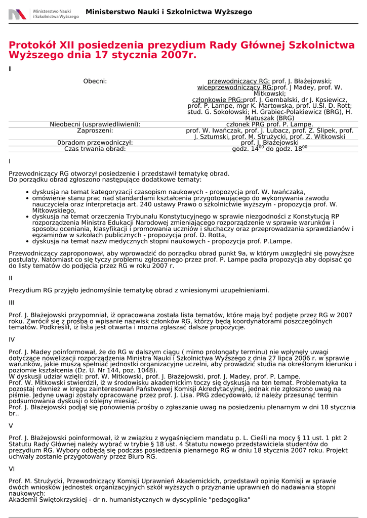 Ministerstwo Nauki i Szkolnictwa Wyższego Protokół XII posiedzenia prezydium Rady Głównej Szkolnictwa Wyższego dnia 17 stycznia 2007r. I Obecni: Nieobecni (usprawiedliwieni): Zaproszeni: 0bradom przewodniczył: Czas trwania obrad: przewodniczący RG: prof. J. Błażejowski; wiceprzewodniczący RG:prof. J Madey, prof. W. Mitkowski; członkowie PRG:prof. J. Gembalski, dr J. Kosiewicz, prof. P. Lampe, mgr K. Martowska, prof. U.Śl. D. Rott; stud. G. Sokołowski; H. Grabiec-Polakiewicz (BRG), H. Matuszak (BRG) członek PRG prof. P. Lampe. prof. W. Iwańczak, prof. J. Lubacz, prof. Z. Ślipek, prof. J. Sztumski, prof. M. Strużycki, prof. Z. Witkowski prof. J. Błażejowski godz. 1400 do godz. 1800 I Przewodniczący RG otworzył posiedzenie i przedstawił tematykę obrad. Do porządku obrad zgłoszono następujące dodatkowe tematy: dyskusja na temat kategoryzacji czasopism naukowych - propozycja prof. W. Iwańczaka, omówienie stanu prac nad standardami kształcenia przygotowującego do wykonywania zawodu nauczyciela oraz interpretacja art. 240 ustawy Prawo o szkolnictwie wyższym - propozycja prof. W. Mitkowskiego, dyskusja na temat orzeczenia Trybunału Konstytucyjnego w sprawie niezgodności z Konstytucją RP rozporządzenia Ministra Edukacji Narodowej zmieniającego rozporządzenie w sprawie warunków i sposobu oceniania, klasyfikacji i promowania uczniów i słuchaczy oraz przeprowadzania sprawdzianów i egzaminów w szkołach publicznych - propozycja prof. D. Rotta, dyskusja na temat nazw medycznych stopni naukowych - propozycja prof. P.Lampe. Przewodniczący zaproponował, aby wprowadzić do porządku obrad punkt 9a, w którym uwzględni się powyższe postulaty. Natomiast co się tyczy problemu zgłoszonego przez prof. P. Lampe padła propozycja aby dopisać go do listy tematów do podjęcia przez RG w roku 2007 r. II Prezydium RG przyjęło jednomyślnie tematykę obrad z wniesionymi uzupełnieniami. III Prof. J. Błażejowski przypomniał, iż opracowana została lista tematów, które mają być podjęte przez RG w 2007 roku. Zwrócił się z prośbą o wpisanie nazwisk członków RG, którzy będą koordynatorami poszczególnych tematów. Podkreślił, iż lista jest otwarta i można zgłaszać dalsze propozycje. IV Prof. J. Madey poinformował, że do RG w dalszym ciągu ( mimo prolongaty terminu) nie wpłynęły uwagi dotyczące nowelizacji rozporządzenia Ministra Nauki i Szkolnictwa Wyższego z dnia 27 lipca 2006 r. w sprawie warunków, jakie muszą spełniać jednostki organizacyjne uczelni, aby prowadzić studia na określonym kierunku i poziomie kształcenia (Dz. U. Nr 144, poz. 1048). W dyskusji udział wzięli: prof. W. Mitkowski, prof. J. Błażejowski, prof. J. Madey, prof. P. Lampe. Prof. W. Mitkowski stwierdził, iż w środowisku akademickim toczy się dyskusja na ten temat. Problematyka ta pozostaj również w kręgu zainteresowań Państwowej Komisji Akredytacyjnej, jednak nie zgłoszono uwag na piśmie. Jedyne uwagi zostały opracowane przez prof. J. Lisa. PRG zdecydowało, iż należy przesunąć termin podsumowania dyskusji o kolejny miesiąc. Prof. J. Błażejowski podjął się ponowienia prośby o zgłaszanie uwag na posiedzeniu plenarnym w dni 18 stycznia br.. V Prof. J. Błażejowski poinformował, iż w związku z wygaśnięciem mandatu p. L. Cieśli na mocy § 11 ust. 1 pkt 2 Statutu Rady Głównej należy wybrać w trybie § 18 ust. 4 Statutu nowego przedstawiciela studentów do prezydium RG. Wybory odbędą się podczas posiedzenia plenarnego RG w dniu 18 stycznia 2007 roku. Projekt uchwały zostanie przygotowany przez Biuro RG. VI Prof. M. Strużycki, Przewodniczący Komisji Uprawnień Akademickich, przedstawił opinię Komisji w sprawie dwóch wniosków jednostek organizacyjnych szkół wyższych o przyznanie uprawnień do nadawania stopni naukowych: Akademii Świętokrzyskiej - dr n. humanistycznych w dyscyplinie "pedagogika" Ministerstwo Nauki i Szkolnictwa Wyższego Politechniki Gdańskiej - dr n. chemicznych w dyscyplinie "biotechnologia". Prof. M. Strużycki poinformował, iż po zapoznaniu się z dokumentacją i przychylną, rzetelną recenzją dotycząca wniosku Politechniki Gdańskiej, KU RG pozytywnie zaopiniowała wniosek i zaproponował, aby PRG zarekomendowało przyjęcie wniosku podczas posiedzenia plenarnego. Natomiast recenzja dotycząca wniosku Akademii Świętokrzyskiej jest niejednoznaczna. W związku z tym KU RG zaproponowała skierowanie wniosku do drugiego recenzenta. PRG przyjęło jednomyślnie propozycje KU RG. VII Prof. Z. Ślipek, w imieniu KE RG, przedstawił opinie w sprawie ośmiu wniosków dotyczących projektów regulaminów stypendialnych: KE RG pozytywnie zaopiniowała następujące regulaminy: Stypendiów doktoranckich w ramach projektu "Budowa potencjału naukowego regionu w obszarach kluczowych dla jego rozwoju" - stypendia dla doktorantów Akademii Rolniczej w Szczecinie przygotowujących prace z zakresu rolnictwa, rybołówstwa, przemysłu rolno-spożywczego, gospodarki opadami. Stypendiów naukowych dla pracowników naukowych i naukowo-dydaktycznych Wyższej Szkoły Menedżerskiej w Warszawie. Stypendiów z funduszy projektu Mechanizm Wspierania Innowacyjnej Działalności Doktorantów WIDDOK (działanie ZPORR 2.6) przez Politechnikę Łódzką; Stypendiów dla doktorantów Uniwersytetu Łódzkiego ze środków wielofunduszowego Zintegrowanego Programu Operacyjnego Rozwoju Regionalnego w ramach "Programu GRRI-D. Grant - stypendium celowe". Stypendiów dla najlepszych słuchaczy studiów doktoranckich Uniwersytetu Opolskiego w ramach projektu "Stypendia dla doktorantów Instytutu Chemii Uniwersytetu Opolskiego"; KE RG zaproponowała wniesienie następującej zmiany do ostatniego regulaminu: w rozdziale "Rozliczenie stypendium i inne obowiązki" (str. 3) w pkt 3 ppkt 3 po wyrazie"wydatki" należy dodać - "z przyznanego dodatku badawczego". KE RG negatywnie zaopiniowała następujące regulaminy: Stypendiów