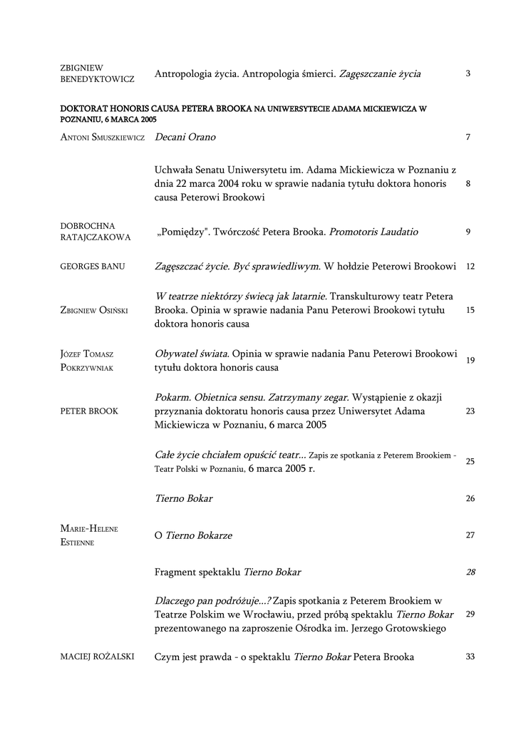 ZBIGNIEW BENEDYKTOWICZ Antropologia życia. Antropologia śmierci. Zagęszczanie życia 3 DOKTORAT HONORIS CAUSA PETERA BROOKA NA UNIWERSYTECIE ADAMA MICKIEWICZA W POZNANIU, 6 MARCA 2005 ANTONI SMUSZKIEWICZ Decani Orano 7 Uchwała Senatu Uniwersytetu im. Adama Mickiewicza w Poznaniu z 8 dnia 22 marca 2004 roku w sprawie nadania tytułu doktora honoris causa Peterowi Brookowi DOBROCHNA RATAJCZAKOWA „Pomiędzy". Twórczość Petera Brooka. Promotoris Laudatio GEORGES BANU Zagęszczać życie. Być sprawiedliwym. W hołdzie Peterowi Brookowi 12 ZBIGNIEW OSIŃSKI W teatrze niektórzy świecą jak latarnie. Transkulturowy teatr Petera Brooka. Opinia w sprawie nadania Panu Peterowi Brookowi tytułu doktora honoris causa JÓZEF TOMASZ POKRZYWNIAK Obywatel świata. Opinia w sprawie nadania Panu Peterowi Brookowi 19 tytułu doktora honoris causa PETER BROOK Pokarm. Obietnica sensu. Zatrzymany zegar. Wystąpienie z okazji przyznania doktoratu honoris causa przez Uniwersytet Adama Mickiewicza w Poznaniu, 6 marca 2005 9 15 23 Całe życie chciałem opuścić teatr... Zapis ze spotkania z Peterem Brookiem 25 Teatr Polski w Poznaniu, 6 marca 2005 r. MARIE-HELENE ESTIENNE MACIEJ ROŻALSKI Tierno Bokar 26 O Tierno Bokarze 27 Fragment spektaklu Tierno Bokar 28 Dlaczego pan podróżuje...? Zapis spotkania z Peterem Brookiem w Teatrze Polskim we Wrocławiu, przed próbą spektaklu Tierno Bokar prezentowanego na zaproszenie Ośrodka im. Jerzego Grotowskiego 29 Czym jest prawda - o spektaklu Tierno Bokar Petera Brooka 33 KRYSTYNA DUNIEC Doświadczenia Petera Brooka 39 FILOLOGIA KLASYCZNA, HISTORIA I ANTROPOLOGIA JAMES REDFIELD Filologia klasyczna i antropologia, przełożyła Katarzyna Przyłuska 42 YANNIS PAPADOPOULOS Potrójny logos mitycznego Sfinksa lub zagadka psychologicznych rozstajów, przełożyła Katarzyna Przyłuska 51 Guzik z historii? Dylematy współczesnej historiografii 58 DARIUSZ CZAJA ANTROPOLOGIA ŚMIERCI. SZTUKA I ŚMIERĆ ALDONA MICKIEWICZ Dwa cynowe naczynia i inne przedmioty 69 NlNA KlRÁLY Ars Poetica Tadeusza Kantora 77 TADEUSZ KANTOR Mówić wtenczas o śmierci było nietaktem. Sztuka jest bliska śmierci 84 JACEK LEOCIAK Spotkanie z trupem: sekcja zwłok Spotkanie z trupem. Aneks 88 KONSTANTIN BIEBL Sekcja zwłok 102 Wierszy zebranych (1912-1920): Mały Aster, Narzeczona Murzyna, Requiem, Piękna młodość, Krążenie 102 GOTTFRIED BENN Z STANISŁAW GROCHOWIAK Lekcja anatomii (Rembrandta), Portretowanie umarłej, Rozbieranie do 103 snu JEAN CLAIR O plugastwie w sztuce dzisiejszej - fragmenty książki De Immundo 105 BOŻENA STOKŁOSA Ciało i sztuka 112 DOM - PORTRET ARTYSTÓW WE WNĘTRZU MAREK JANCZYK, IWONA ŚWIĘCH Dom artysty. Słowa i obrazy 115 WOJCIECH PRAŻMOWSKI Miejsca i duch miejsc - podróż po Polsce śladami Pornografii Witolda Gombrowicza 122 ZBIGNIEW BENEDYKTOWICZ JAN STRZELECKI Polacy, Polacy - antropologia wizualna i portrety wielokrotne Krzysztofa Gierałtowskiego 129 TO nie stało się dzisiaj - Rozmowa z Krzysztofem Gierałtowskim na wystawie Twarz jako znak 135 Z zapisków, listów, notatek. Szwecja 151 CONTENTS ZBIGNIEW BENEDYKTOWICZ Anthropology of life. Anthropology of death. To Condense Life. RESOLUTION ON GRANTING AN HONORARY DOCTORATE, PASSED BY THE SENATE OF THE ADAM MICKIEWICZ UNIVERSITY IN POZNAŃ ON 22 MARCH 2004 ANTONI SMUSZKIEWICZ Decani oratio DOBROCHNA RATAJCZAKOWA "Between". The Oeuvre of Peter Brook, Promotoris Laudatio GEORGES BANU To Condense Life. To Be Just. In Honour of Peter Brook ZBIGNIEW OSIŃSKI In the Theatre Some Shine in the Manner of Lanterns. The Trans-cultural Theatre of Peter Brook. An Opinion on Granting an Honorary Doctorate to Mr. Peter Brook JÓZEF TOMASZ POKRZYWNIAK Citizen of the World. An Opinion on Granting an Honorary Doctorate to Mr. Peter Brook PETER BROOK Nourishment. the Promise of Meaning. The Paused Clock. Speech given Upon the Occasion of Granting an Honorary Doctorate by the Adam Mickiewicz University in Poznań, 6 March 2005 All my life I Yearned to Abandon the Theatre... A Record of a Meeting with Peter Brook, Polski Theatre in Poznań, 6 March 2005 Tierno Bokar MARIE-HELENE ESTIENNE About Tierno Bokar Tierno Bokar (Fragment) Why Do You Travel...? A Record of a Meeting with Peter Brook, Polski Theatre in Wrocław, 9 March 2005, Prior to Rehearsal of Tierno Bokar, Staged upon the Invitation of the Grotowski Centre MACIEJ ROŻALSKI What is Truth - on Tierno Bokar, Directed by Peter Brook KRYSTYNA DUNIEC The Experience of Peter Brook CLASSICAL PHILOLOGY, HISTORY AND ANTHROPOLOGY JAMES REDFIELD Classical Philology and Anthropology YANNIS PAPADOPOULOS The Triple logos of the Mythical Sphinx, or the Puzzle of Psychological Crossroads DARIUSZ CZAJA History is Naught? The Dillemas of Contemporary Historiography ANTHROPOLOGY OF DEATH. ART AND DEATH ALDONA MICKIEWICZ Two Cinnamon Vessels and Other Objects NlNA KlRÁLY Ars Poetica by Tadeusz Kantor TADEUSZ KANTOR To Speak About Death was Tactless. Art is Close to Death JACEK LEOCIAK A Meeting With a Cadaver in Two Acts JEAN CLAIR On Grossness in Contemporary Art. Fragment of the Book De Immundo BOŻENA STOKŁOSA Body and Art - Remarks on Books by Izabela Kowalczyk THE HOME - AN ARTISTS' PORTRAIT IN AN INTERIOR MAREK JANCZYK, IWONA ŚWIĘCH An Artists' House. Words and Images WOJCIECH PRAŻMOWSKI Places and Spiritus Loci - Travelling Across Poland Along the Trails of Pornografia by Witold Gombrowicz ZBIGNIEW BENEDYKTOWICZ Poles, Poles - Visual Anthropology and Multiple Portraits by Krzysztof Gierałtowski It has not began today - Discussion with Krzysztof Gierałtowski at the Exhibition Face as a Sign JAN STRZELECKI From Records, Letters, Notes. Sweden, Norway