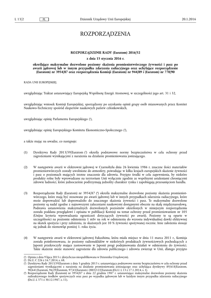 L 13/2 Dziennik Urzędowy Unii Europejskiej PL 20.1.2016 ROZPORZĄDZENIA ROZPORZĄDZENIE RADY (Euratom) 2016/52 z dnia 15 stycznia 2016 r. określające maksymalne dozwolone poziomy skażenia promieniotwórczego żywności i pasz po awarii jądrowej lub w innym przypadku zdarzenia radiacyjnego oraz uchylające rozporządzenie (Euratom) nr 3954/87 oraz rozporządzenia Komisji (Euratom) nr 944/89 i (Euratom) nr 770/90 RADA UNII EUROPEJSKIEJ, uwzględniając Traktat ustanawiający Europejską Wspólnotę Energii Atomowej, w szczególności jego art. 31 i 32, uwzględniając wniosek Komisji Europejskiej, sporządzony po uzyskaniu opinii grupy osób mianowanych przez Komitet Naukowo-Techniczny spośród ekspertów naukowych państw członkowskich, uwzględniając opinię Parlamentu Europejskiego (1), uwzględniając opinię Europejskiego Komitetu Ekonomiczno-Społecznego (2), a także mając na uwadze, co następuje: (1) Dyrektywa Rady 2013/59/Euratom (3) określa podstawowe normy bezpieczeństwa w celu ochrony przed zagrożeniami wynikającymi z narażenia na działanie promieniowania jonizującego. (2) W następstwie awarii w elektrowni jądrowej w Czarnobylu dnia 26 kwietnia 1986 r. znaczne ilości materiałów promieniotwórczych zostały uwolnione do atmosfery, powodując w kilku krajach europejskich skażenie żywności i pasz o poziomach mających istotne znaczenie dla zdrowia. Przyjęto środki w celu zapewnienia, by niektóre produkty rolne były wprowadzane na terytorium Unii wyłącznie zgodnie ze wspólnymi ustaleniami chroniącymi zdrowie ludności, które jednocześnie podtrzymują jednolity charakter rynku i zapobiegają przesunięciom handlu. (3) Rozporządzenie Rady (Euratom) nr 3954/87 (4) określa maksymalne dozwolone poziomy skażenia promieniot wórczego, które mają być stosowane po awarii jądrowej lub w innych przypadkach zdarzenia radiacyjnego, które może doprowadzić lub doprowadziło do znacznego skażenia żywności i pasz. Te maksymalne dozwolone poziomy są nadal zgodne z najnowszymi zaleceniami naukowymi dostępnymi obecnie na skalę międzynarodową. Podstawa ustanowienia maksymalnych dozwolonych poziomów określonych w niniejszym rozporządzeniu została poddana przeglądowi i opisana w publikacji Komisji na temat ochrony przed promieniowaniem nr 105 (Unijne kryteria wprowadzania ograniczeń dotyczących żywności po awarii). Poziomy te są oparte w szczególności na poziomie odniesienia 1 mSv na rok w odniesieniu do wzrostu indywidualnej dawki efektywnej na skutek spożycia i przy założeniu, że skażonych jest 10 % żywności spożywanej rocznie. Inne założenia stosuje się jednak do niemowląt poniżej 1. roku życia. (4) W następstwie awarii w elektrowni jądrowej Fukushima, która miała miejsce w dniu 11 marca 2011 r., Komisja została poinformowana, że poziomy radionuklidów w niektórych produktach żywnościowych pochodzących z Japonii przekroczyły mające zastosowanie w Japonii progi podejmowania działań w odniesieniu do żywności. Takie skażenie może stanowić zagrożenie dla zdrowia publicznego i zdrowia zwierząt w Unii, dlatego przyjęto (1) Opinia z dnia 9 lipca 2015 r. (dotychczas nieopublikowana w Dzienniku Urzędowym). (2) Dz.U. C 226 z 16.7.2014, s. 68. (3) Dyrektywa Rady 2013/59/Euratom z dnia 5 grudnia 2013 r. ustanawiająca podstawowe normy bezpieczeństwa w celu ochrony przed zagrożeniami wynikającymi z narażenia na działanie promieniowania jonizującego oraz uchylająca dyrektywy 89/618/Euratom, 90/641/Euratom, 96/29/Euratom, 97/43/Euratom i 2003/122/Euratom (Dz.U. L 13 z 17.1.2014, s. 1). 4 ( ) Rozporządzenie Rady (Euratom) nr 3954/87 z dnia 22 grudnia 1987 r. ustanawiające maksymalne dozwolone poziomy skażenia radioaktywnego środków spożywczych oraz pasz po wypadku jądrowym lub w każdym innym przypadku zdarzenia radiacyjnego (Dz.U. L 371 z 30.12.1987, s. 11). 20.1.2016 PL Dziennik Urzędowy Unii Europejskiej L 13/3 środki polegające na wprowadzeniu specjalnych warunków regulujących przywóz żywności i paszy pochodzących lub wysyłanych z Japonii, zgodne z opinią Stałego Komitetu ds. Łańcucha Żywnościowego i Zdrowia Zwierząt ustanowionego rozporządzeniem (WE) nr 178/2002 Parlamentu Europejskiego i Rady (1). (5) Istnieje potrzeba stworzenia systemu umożliwiającego Wspólnocie w razie awarii jądrowej lub w innym przypadku zdarzenia radiacyjnego, które może doprowadzić lub doprowadziło do znacznego skażenia promie niotwórczego żywności i pasz, określenie, w celu ochrony ludności, maksymalnych dozwolonych poziomów skażenia promieniotwórczego w odniesieniu do produktów, które mają być wprowadzone do obrotu. (6) Podobnie jak inne rodzaje żywności woda pitna jest spożywana bezpośrednio lub pośrednio, a zatem jest istotna dla ogólnego narażenia konsumenta na działanie substancji promieniotwórczych. W odniesieniu do substancji promieniotwórczych kontrola jakości wody przeznaczonej do spożycia przez ludzi jest już przewidziana w dyrektywie Rady 2013/51/Euratom (2), z wyjątkiem wód mineralnych i wód, które są produktami leczniczymi. Niniejsze rozporządzenie powinno mieć zastosowanie do żywności, żywności o mniejszym znaczeniu i pasz, które mogą być wprowadzone do obrotu po awarii jądrowej lub w innym przypadku zdarzenia radiacyjnego i nie mieć zastosowania do wody przeznaczonej do spożycia przez ludzi, do której zastosowanie ma dyrektywa 2013/51/Euratom. W przypadku zdarzenia radiacyjnego państwa członkowskie mogą jednak zdecydować, że będą się odnosić do maksymalnych poziomów dla żywności w postaci płynnej określonych w niniejszym rozporządzeniu w celu kontroli wykorzystywania wody przeznaczonej do spożycia przez ludzi. (7) Maksymalne dozwolone poziomy skażenia promieniotwórczego powinny mieć zastosowanie do żywności i pasz pochodzących z Unii lub przywożonych z państw trzecich w zależności od miejsca i okoliczności awarii