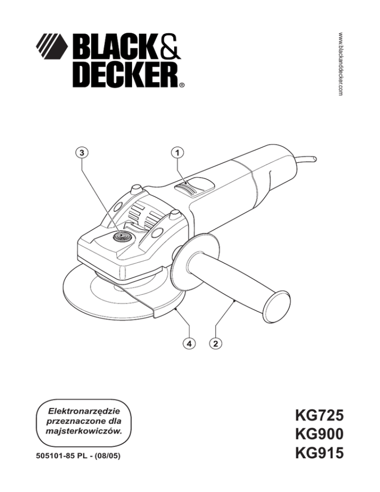 www.blackanddecker.com Elektronarzędzie przeznaczone dla majsterkowiczów. 505101-85 PL - (08/05) KG725 KG900 KG915 9 9 9 9 8 8 4 4 5 6 7 7 B A 13 11 5 10 11 13 12 10 5 C D 2 5 10 11 13 13 16 14 13 15 11 10 5 F E 3 POLSKI Zastosowanie zgodne z przeznaczeniem Używaj urządzeń do odsysania pyłu! Jeżeli producent przewidział urządzenia do odsysania lub gromadzenia pyłu, sprawdź, czy są one przyłączone i prawidłowo zamontowane. Nie pozostawiaj wetkniętych kluczy do mocowania narzędzi roboczych! Przed załączeniem szlifierki sprawdź, czy zostały wyjęte klucze i przyrządy nastawcze. Przedłużacz Przed użyciem sprawdź przedłużacz i wymień go w razie wykrycia uszkodzenia. Przy pracy na wolnym powietrzu stosuj tylko przeznaczone do tego celu przedłużacze. Przedłużacz Black & Decker długości do 30 m nie powoduje zauważalnego spadku mocy. Używaj odpowiednich narzędzi roboczych! W niniejszej instrukcji opisano zastosowanie szlifierki zgodne z przeznaczeniem. Do ciężkich prac nie używaj zbyt słabych narzędzi roboczych ani akcesoriów. Najlepszą jakość i osobiste bezpieczeństwo osiągniesz, tylko stosując właściwe narzędzia. Nie przeciążaj szlifierki. Nie wykorzystuj elektronarzędzi do celów innych, niż przewidziane przez producenta, np. ręcznej pilarki tarczowej do ścinania pni drzew i gałęzi. Ostrzeżenie! Używanie innych nasadek i wyposażenia dodatkowego, niż zalecane w tej instrukcji, lub wykonywanie prac niezgodnych z przeznaczeniem produktu może doprowadzić do wypadku. Kontroluj szlifierkę pod względem uszkodzeń! Przed użyciem sprawdź szlifierkę i kabel, czy są całkowicie sprawne. Nie zapomnij przy tym o ruchomych elementach. By zapewnić nienaganną pracę narzędzia, wszystkie części muszą być właściwie zamontowane. Uszkodzone elementy, urządzenia zabezpieczające i wyłączniki powinny być prawidłowo naprawione lub wymienione przez jeden z naszych warsztatów serwisowych. Nie używaj szlifierki, gdy jakaś jej część jest niesprawna. Nie próbuj samemu jej naprawiać. Wyjmuj wtyczkę kabla z gniazda sieciowego! W razie nieużywania szlifierki, przed rozpoczęciem wykonywania prac konserwacyjnych, czy też przy wymianie narzędzia roboczego lub jakiegoś innego elementu, zawsze wyjmuj wtyczkę kabla zasilającego z gniazda sieciowego. Uważaj, by nie doszło do niezamierzonego załączenia! Nie przenoś szlifierki z palcem opartym na wyłączniku. Przy przyłączaniu elektronarzędzia do sieci najpierw sprawdź, czy jest ono wyłączone. Ostrożnie obchodź się z kablem! Nie przenoś szlifierki za kabel ani nie używaj kabla do wyjmowania wtyczki z gniazda sieciowego. Chroń kabel przed wysoką temperaturą, olejem i ostrymi krawędziami. Bezpiecznie przechowuj swoje narzędzia! Nieużywane elektronarzędzia powinny być przechowywane w suchym, niedostępnym dla dzieci miejscu. Starannie konserwuj swoje narzędzia! Ostrz i utrzymuj w czystości swoje narzędzia robocze, gdyż jest to warunkiem bezpieczeństwa pracy. Stosuj się do instrukcji konserwacji i wymiany narzędzi. Wszystkie rękojeści i wyłączniki powinny być suche, czyste, niezabrudzone olejem ani smarem. Szlifierka kątowa firmy Black & Decker jest przeznaczona do cięcia oraz szlifowania metali i muru przy użyciu odpowiedniej tarczy tnącej bądź szlifierskiej. Szlifierka ta nie nadaje się do zastosowań przemysłowych. Wskazówki dotyczące bezpieczeństwa • • • • Ostrzeżenie! Przy korzystaniu z elektronarzędzi dokładnie przestrzegaj wskazówek zawartych w tej instrukcji i podstawowych przepisów bhp, by zminimalizować ryzyko porażenia prądem elektrycznym, pożaru, doznania urazu ciała i szkód rzeczowych. Przed użyciem narzędzia dokładnie przeczytaj niniejszą instrukcję. Przechowuj instrukcję na wypadek, gdyby znów była kiedyś potrzebna. Przed rozpoczęciem wykonywania prac nastawczych i konserwacyjnych zawsze wyjmuj wtyczkę kabla zasilającego z gniazda sieciowego. Utrzymuj porządek w miejscu pracy! Nieporządek w miejscu pracy grozi wypadkiem. Uwzględniaj wpływy otoczenia! Nie wystawiaj szlifierki na działanie deszczu. Nie używaj jej też w wilgotnym ani mokrym otoczeniu. Zadbaj o dobre oświetlenie miejsca pracy. Nie załączaj narzędzia w miejscach, gdzie występuje niebezpieczeństwo pożaru bądź wybuchu, na przykład w pobliżu palnych cieczy lub gazów. Nie dopuszczaj dzieci do miejsca pracy! Nie dopuszczaj dzieci, osób postronnych ani zwierząt do miejsca pracy i pilnuj, by nie dotykały szlifierki. Zakładaj odpowiednią odzież ochronną! Nie noś luźnej odzieży ani biżuterii, gdyż mogą one zostać pochwycone przez ruchome części szlifierki. Przy pracy na wolnym powietrzu godne polecenia są rękawice ochronne i obuwie na szorstkiej podeszwie. Na długie włosy zakładaj specjalną siatkę. Ochrona osobista! Zawsze zakładaj okulary ochronne i maskę przeciwpyłową, jeżeli podczas pracy w powietrze jest wzbijany pył lub drobiny obrabianego materiału. Zakładaj specjalne słuchawki ochronne. Ochrona przed porażeniem prądem elektrycznym: Unikaj dotykania uziemionych elementów, jak na przykład rury, grzejniki, piece i chłodziarki. Bezpieczeństwo elektryczne można zwiększyć przez użycie wyłącznika ochronnego różnicowo-prądowego (30 mA/30 mS). Zachowuj stabilną podstawę! Zachowuj stabilną postawę, by nie stracić równowagi w jakiejś pozycji roboczej. Zawsze zachowuj uwagę! Koncentruj się na swojej pracy. Postępuj rozsądnie. Nie używaj szlifierki, gdy jesteś zmęczony. Zabezpiecz obrabiany przedmiot! Używaj przyrządów mocujących lub imadła do przytrzymywania przedmiotu obrabianego. Gdy przedmiot ten jest dobrze zamocowany, możesz obsługiwać narzędzie obiema rękami. 4 Naprawy: Szlifierka ta jest zgodna z obowiązującymi przepisami bezpieczeństwa i higieny pracy. Naprawy mogą być wykonywane wyłącznie przez uprawnionych do tego specjalistów przy użyciu