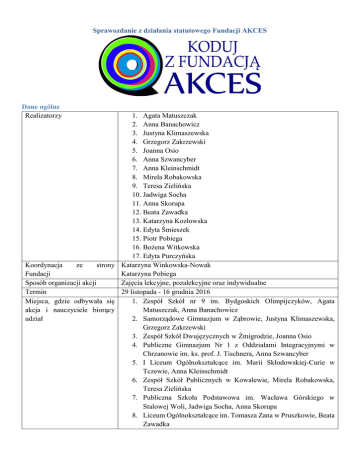 Sprawozdanie z działania statutowego Fundacji AKCES Dane ogólne Realizatorzy 1. Agata Matuszczak 2. Anna Banachowicz 3. Justyna Klimaszewska 4. Grzegorz Zakrzewski 5. Joanna Osio 6. Anna Szwancyber 7. Anna Kleinschmidt 8. Mirela Robakowska 9. Teresa Zielińska 10. Jadwiga Socha 11. Anna Skorupa 12. Beata Zawadka 13. Katarzyna Kozłowska 14. Edyta Śmieszek 15. Piotr Pobiega 16. Bożena Witkowska 17. Edyta Purczyńska Koordynacja ze strony Katarzyna Winkowska-Nowak Fundacji Katarzyna Pobiega Sposób organizacji akcji Zajęcia lekcyjne, pozalekcyjne oraz indywidualne Termin 29 listopada - 16 grudnia 2016 Miejsca, gdzie odbywała się 1. Zespół Szkół nr 9 im. Bydgoskich Olimpijczyków, Agata akcja i nauczyciele biorący Matuszczak, Anna Banachowicz udział 2. Samorządowe Gimnazjum w Ząbrowie, Justyna Klimaszewska, Grzegorz Zakrzewski 3. Zespół Szkół Dwujęzycznych w Żmigrodzie, Joanna Osio 4. Publiczne Gimnazjum Nr 1 z Oddziałami Integracyjnymi w Chrzanowie im. ks. prof. J. Tischnera, Anna Szwancyber 5. I Liceum Ogólnokształcące im. Marii Skłodowskiej-Curie w Tczewie, Anna Kleinschmidt 6. Zespół Szkół Publicznych w Kowalewie, Mirela Robakowska, Teresa Zielińska 7. Publiczna Szkoła Podstawowa im. Wacława Górskiego w Stalowej Woli, Jadwiga Socha, Anna Skorupa 8. Liceum Ogólnokształcące im. Tomasza Zana w Pruszkowie, Beata Zawadka 9. Gimnazjum nr 1 im. Jana Pawła II w Sochaczewie, Katarzyna Kozłowska 10. Zespół Szkół im. KEN w Tymbarku, Edyta Śmieszek 11. LO Nr II im. J. Chreptowicza w Ostrowcu Świętokrzyskim, Piotr Pobiega 12. Zespół Szkół Ponadgimnazjalnych nr 2 im. Stanisława Staszica w Tomaszowie Mazowieckim, Bożena Witkowska 13. Publiczne Gimnazjum nr 1 im. 750 lecia Miasta Żnina w Żninie, Edyta Purczyńska Adresaci (wiek uczniów) 10-18 Liczba uczniów objętych akcją 15+15+66+117+31+28+119+201+12+123+25+29+24+72+86+45+30= 1038 uczniów Link do strony z informacją o 1. informacja akcji (jeżeli była utworzona) 2. http://www.gimzabrowo.pl/ 3. Link 4. http://www.sklodowska.szkola.tczew.pl/index.php/14ogoszenia/913-programowanie-to-wspolne-dzialanie-godzinakodowania-w-i-lo-w-tczewie 5. https://sites.google.com/zspkowalew.pl/programowanie/godzinakodowania 6. https://sites.google.com/a/zspkowalew.pl/scikowalew/aktualnosci 7. https://zan.edupage.org/ 8. WWW.gim1soch.pl 9. http://zstymbark.pl/index.php/644-godzina-kodowania 10. Link Cel: Popularyzacja wiedzy o programowaniu, pokazanie, że każdy może nauczyć się programować oraz doskonalenie umiejętności programowania. Program: zapoznanie z założeniami akcji zapoznanie z zasadami Obejrzenie filmu promującego akcję (w niektórych placówkach) Kodowanie Ankieta ewaluacyjna (w niektórych placówkach) rozdanie certyfikatów (w niektórych placówkach) Wybrane opis realizatorów „W mojej części akcji (nie jest to całość akcji szkolnej) wzięło udział 88% wszystkich uczniów klas 3 i 36 % uczniów z wszystkich klas pierwszych. W całej szkole rozwiesiliśmy plakaty, rozmawialiśmy na ten temat z uczniami. Ponieważ mieli oni niewiele styczności z kodowaniem do tej pory, zależało nam, żeby zadania były niezbyt trudne. Uczniowie z zainteresowaniem obejrzeli filmik promujący akcję (był to ten, który umieszczono również na stronie SWPS). Klasom trzecim rozdałam kody i oni logowali się na stronie code.org za pomocą loginów (bloczki, pomimo ustawienia na język polski wyświetlały się po angielsku, co troszeczkę utrudniało, ale też uatrakcyjniało zadanie). Klasy pierwsze brały udział w zajęciach bez logowania (wtedy wszystko było po polsku i było łatwiej). Uczniowie w większości prawie bez problemów wykonywali polecenia, chociaż nie wszyscy doszli do końca. Wielu jednak kodowało również w domu. Z ankiety którą wypełnili po zajęciach wynikało, że przed zajęciami prawie wszyscy uważali, że programowanie jest bardzo trudne. Po zajęciach stwierdzili, że każdy jest w stanie się tego nauczyć. Uczniowie są zainteresowani udziałem w akcji w przyszłości, jak również chcą kodować na informatyce. Niektórzy zamierzają sami uczyć się również programowania z dostępnych samouczków. Akcję uważamy za udaną !” (Justyna Klimaszewska) „W godzinie kodowania wzięło udział 96% wszystkich uczniów klas 3 i 97% uczniów z wszystkich klas drugich.” (Grzegorz Zakrzewski) „Akcja przebiegła zgodnie z założeniami. Na początku uczniowie zostali zaznajomieni z jej celami, stroną projektu (https://hourofcode.com/pl) oraz materiałami zamieszczonymi na tej stronie. W kolejnym kroku zostali poinstruowani jak pracować z zadaniami. Dalsza część zajęć to samodzielna praca uczniów. Mogli oni sami decydować o tym, które zadanie wykonają. Podczas zajęć dodatkowych wykorzystaliśmy platformę KhanAcademy. Zajęcia przebiegały sprawnie, a uczniowie pracowali z dużym zaangażowaniem.” (Joanna Osio) „Uczniowie I LO w Tczewie uczestniczyli w projekcie „Godzina Kodowania” podczas lekcji informatyki lub matematyki. Na początku każdych zajęć uczniowie zostali zapoznani z celami i zasadami udziału w akcji. Zajęcia odbywały się w pracowni komputerowej. Tylko jedne zajęcia odbyły się poza pracownią komputerową, wówczas uczniowie pracowali z aplikacją LightBot przy pomocy tabletów, smartfonów, tablicy interaktywnej. Wszyscy uczestnicy wykonywali z dużym zaangażowaniem zadania zaproponowane przez code.org i Khan Academy. Większość z nich ukończyła dany kurs podczas lekcji.” (Anna Kleinschmidt) „Godzina Kodowania została w naszej szkole przeprowadzona pod hasłem “Rysowanie i animacje”. Akcja miała miejsce podczas zajęć komputerowych w klasach 4 - 6 szkoły podstawowej, informatyki w klasach I II gimnazjum oraz podczas zajęć dodatkowych. Uczniowie klas IV tworzyli w aplikacji Scratch animowaną choinkę. Uczniowie klas V i VI kodowali z Anną i Elsą, tworząc figury geometryczne i ilustracje z figur