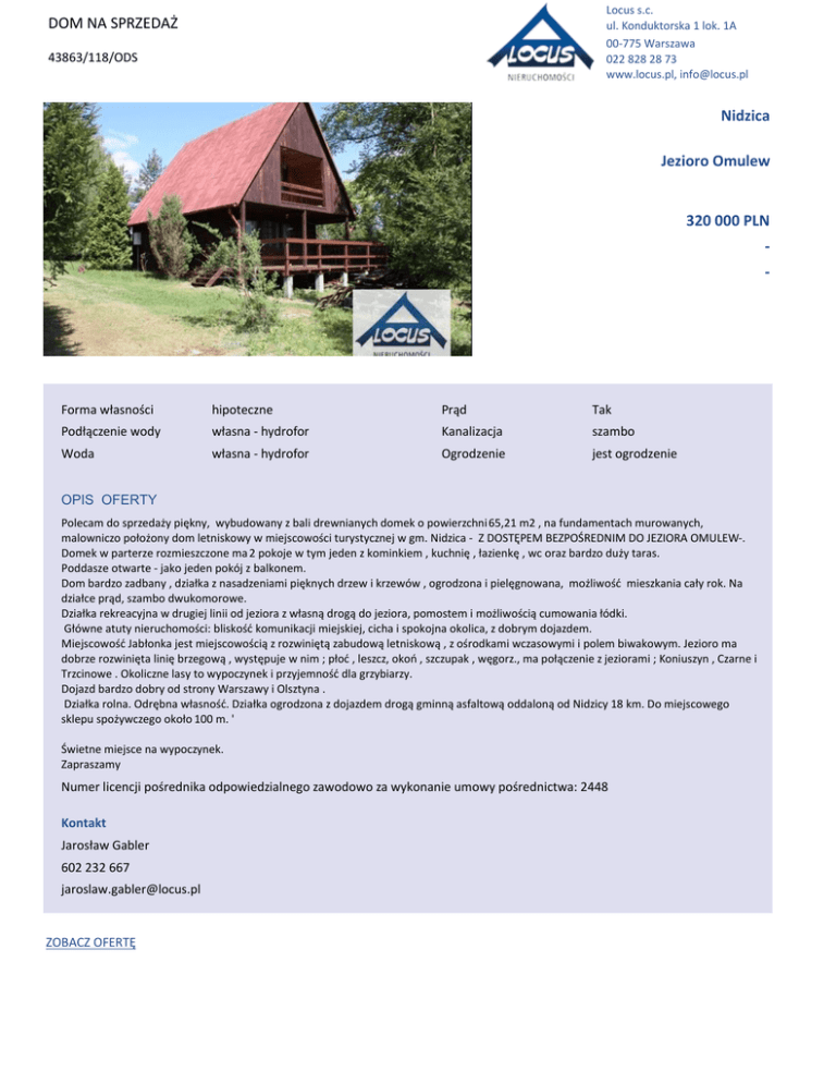 Locus s.c. ul. Konduktorska 1 lok. 1A 00-775 Warszawa 022 828 28 73 www.locus.pl, [email protected] KDE^WZ 43863/118/ODS Nidzica Jezioro Omulew 320 000 PLN - &ŽƌŵĂǁųĂƐŶŽƑĐŝ hipoteczne WƌČĚ Tak WŽĚųČĐnjĞŶŝĞǁŽĚLJ ǁųĂƐŶĂͲŚLJĚƌŽĨŽƌ Kanalizacja szambo Woda ǁųĂƐŶĂͲŚLJĚƌŽĨŽƌ Ogrodzenie jest ogrodzenie OPIS OFERTY WŽůĞĐĂŵĚŽƐƉƌnjĞĚĂǏLJƉŝħŬŶLJ͕ǁLJďƵĚŽǁĂŶLJnjďĂůŝĚƌĞǁŶŝĂŶLJĐŚĚŽŵĞŬŽƉŽǁŝĞƌnjĐŚŶŝ65,21 m2 , na fundamentach murowanych, ŵĂůŽǁŶŝĐnjŽƉŽųŽǏŽŶLJĚŽŵůĞƚŶŝƐŬŽǁLJǁŵŝĞũƐĐŽǁŽƑĐŝƚƵƌLJƐƚLJĐnjŶĞũǁŐŵ͘EŝĚnjŝĐĂͲK^d%WDWK_ZE/DK:/KZKDh>tͲ͘ Domek w parterze rozmieszczone ma 2ƉŽŬŽũĞǁƚLJŵũĞĚĞŶnjŬŽŵŝŶŬŝĞŵ͕ŬƵĐŚŶŝħ͕ųĂnjŝĞŶŬħ͕ǁĐŽƌĂnjďĂƌĚnjŽĚƵǏLJƚĂƌĂƐ͘ Poddasze otwarte - jako jeden pokój z balkonem. ŽŵďĂƌĚnjŽnjĂĚďĂŶLJ͕ĚnjŝĂųŬĂnjŶĂƐĂĚnjĞŶŝĂŵŝƉŝħŬŶLJĐŚĚƌnjĞǁŝŬƌnjĞǁſǁ͕ŽŐƌŽĚnjŽŶĂŝƉŝĞůħŐŶŽǁĂŶĂ͕ŵŽǏůŝǁŽƑđŵŝĞƐnjŬĂŶŝĂĐĂųLJƌŽŬ͘EĂ ĚnjŝĂųĐĞƉƌČĚ͕ƐnjĂŵďŽĚǁƵŬŽŵŽƌŽǁĞ͘ njŝĂųŬĂƌĞŬƌĞĂĐLJũŶĂǁĚƌƵŐŝĞũůŝŶŝŝŽĚũĞnjŝŽƌĂnjǁųĂƐŶČĚƌŽŐČĚŽũĞnjŝŽƌĂ͕ƉŽŵŽƐƚĞŵŝŵŽǏůŝǁŽƑĐŝČĐƵŵŽǁĂŶŝĂųſĚŬŝ͘ 'ųſǁŶĞĂƚƵƚLJŶŝĞƌƵĐŚŽŵŽƑĐŝ͗ďůŝƐŬŽƑđŬŽŵƵŶŝŬĂĐũŝŵŝĞũƐŬŝĞũ͕ĐŝĐŚĂŝƐƉŽŬŽũŶĂŽŬŽůŝĐĂ͕njĚŽďƌLJŵĚŽũĂnjĚĞŵ͘ DŝĞũƐĐŽǁŽƑđ:ĂďųŽŶŬĂũĞƐƚŵŝĞũƐĐŽǁŽƑĐŝČnjƌŽnjǁŝŶŝħƚČnjĂďƵĚŽǁČůĞƚŶŝƐŬŽǁČ͕njŽƑƌŽĚŬĂŵŝǁĐnjĂƐŽǁLJŵŝŝƉŽůĞŵďŝǁĂŬŽǁLJŵ͘:ĞnjŝŽƌŽŵĂ ĚŽďƌnjĞƌŽnjǁŝŶŝħƚĂůŝŶŝħďƌnjĞŐŽǁČ͕ǁLJƐƚħƉƵũĞǁŶŝŵ͖ƉųŽđ͕ůĞƐnjĐnj͕ŽŬŽŷ͕ƐnjĐnjƵƉĂŬ͕ǁħŐŽƌnj͕͘ŵĂƉŽųČĐnjĞŶŝĞnjũĞnjŝŽƌĂŵŝ͖<ŽŶŝƵƐnjLJŶ͕njĂƌŶĞŝ dƌnjĐŝŶŽǁĞ͘KŬŽůŝĐnjŶĞůĂƐLJƚŽǁLJƉŽĐnjLJŶĞŬŝƉƌnjLJũĞŵŶŽƑđĚůĂŐƌnjLJďŝĂƌnjLJ͘ Dojazd bardzo dobry od strony Warszawy i Olsztyna . njŝĂųŬĂƌŽůŶĂ͘KĚƌħďŶĂǁųĂƐŶŽƑđ͘njŝĂųŬĂŽŐƌŽĚnjŽŶĂnjĚŽũĂnjĚĞŵĚƌŽŐČŐŵŝŶŶČĂƐĨĂůƚŽǁČŽĚĚĂůŽŶČŽĚEŝĚnjŝĐLJ18 km. Do miejscowego ƐŬůĞƉƵƐƉŽǏLJǁĐnjĞŐŽŽŬŽųŽ100 m. ' _ǁŝĞƚŶĞŵŝĞũƐĐĞŶĂǁLJƉŽĐnjLJŶĞŬ͘ Zapraszamy EƵŵĞƌůŝĐĞŶĐũŝƉŽƑƌĞĚŶŝŬĂŽĚƉŽǁŝĞĚnjŝĂůŶĞŐŽnjĂǁŽĚŽǁŽnjĂǁLJŬŽŶĂŶŝĞƵŵŽǁLJƉŽƑƌĞĚŶŝĐƚǁĂ͗Ϯϰϰϴ Kontakt :ĂƌŽƐųĂǁ'ĂďůĞƌ 602 232 667 [email protected] KK&Zd%