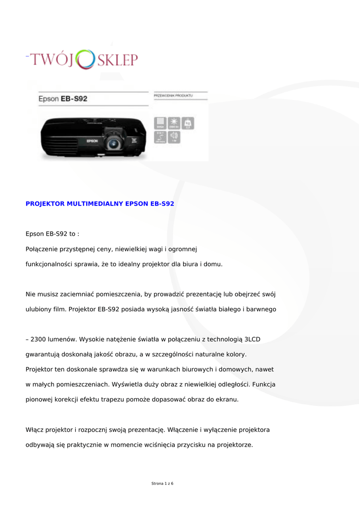 PROJEKTOR MULTIMEDIALNY EPSON EB-S92 Epson EB-S92 to : Połączenie przystępnej ceny, niewielkiej wagi i ogromnej funkcjonalności sprawia, że to idealny projektor dla biura i domu. Nie musisz zaciemniać pomieszczenia, by prowadzić prezentację lub obejrzeć swój ulubiony film. Projektor EB-S92 posiada wysoką jasność światła białego i barwnego – 2300 lumenów. Wysokie natężenie światła w połączeniu z technologią 3LCD gwarantują doskonałą jakość obrazu, a w szczególności naturalne kolory. Projektor ten doskonale sprawdza się w warunkach biurowych i domowych, nawet w małych pomieszczeniach. Wyświetla duży obraz z niewielkiej odległości. Funkcja pionowej korekcji efektu trapezu pomoże dopasować obraz do ekranu. Włącz projektor i rozpocznj swoją prezentację. Włączenie i wyłączenie projektora odbywają się praktycznie w momencie wciśnięcia przycisku na projektorze. Strona 1 z 6 Koszty eksploatacji pozwoli obniżyć lampa E-TORL, która może pracować do 5000 godzin, a ochronę przed kradzieżą zapewnia wiele różnych funkcji bezpieczeństwa, w tym blokada Kensington. WEjścIE/WyjścIE S-Video Złącze USB typu B Composite video Komputer/Component video NAJWAŻNIEJSZE CECHY • Łatwe prezentowanie dzięki wyświetlaniu za pomocą złącza USB • Funkcje szybkiego uruchomienia oraz natychmiastowego wyłączenia • Pionowa korekcja trapezu • Lampa E-TORL o długiej żywotności – 5000 godzin Wejście audio Wyjście audio Epson EB-S92 DANE TECHNICZNE PRODUKTU TECHNOLOGIA PROJEKCJI Technologia 3LCD 0,55 cala z MLA Strona 2 z 6 • Przewód zasilający 1,8 m • Kabel komputerowy 1,8 m ROZDZIELCZOŚĆ SVGA – 800 x 600 (format obrazu 4:3) • Pilot z bateriami Do 1080i NATĘŻENIE ŚWIATŁA BIAŁEGO* Tryb zwykły/oszczędzania energii 2300/2040 lumenów • Torba • Naklejka ochrony hasłem • Instrukcje obsługi NATĘŻENIE ŚWIATŁA BARWNEGO* Tryb zwykły/oszczędzania energii 2300/2040 lumenów KONTRAST 2000:1 AKCESORIA OPCJONALNE WIELKOŚĆ OBRAZU od 23 cali do 350 cali 60-calowy ekran: z odległości 1,8 – 2,4 m WSPÓŁCZYNNIK POWIĘKSZENIA Powiększenie cyfrowe 1 – 1,35 • 80-calowy przenośny ekran 16:9 TYP OBIEKTYWU • 80-calowy składany ekran 16:10 Przysłona 1.44 Ogniskowa 16,6mm (ELPSC24) Przesunięcie 8:1 • Ekran z możliwością zmiany proporcji Strona 3 z 6 WSPÓŁCZYNNIK RZUTU 1.45 – 1.96:1 • Zapasowa lampa (ELPL58) • Zestaw filtrów powietrza (ELPAF25) KOREKCJA EFEKTU TRAPEZU Ręczna, pionowa ±30° (ELPSC21) LAMPA Żywotność (tryb normalny/ekonomiczny) Rodzaj 4000/5000 godzin 175 W UHE E-TORL (ELPLP58) 65/74/80 cali (ELPSC26) • Epson USB Wizualizer (ELPDC06) WEJŚCIE OBRAZU Komputer Wideo 1 x D-sub 15-stykowe, 1 x USB 2.0 typu B 1 x RCA, 1 x S-Video, 1 x Component (D-sub 15-stykowe) • Mocowanie sufitowe (ELPMB23) • Rurka sufitowa 450 mm (ELPFP13) WYJŚCIE AUDIO Komputer 1 x Stereo mini-jack WEJŚCIE DŹWIĘKU Komputer/Wideo 1 x Stereo mini-jack • Rurka sufitowa 700 mm (ELPFP14) • Torba transportowa (opcja) FUNKCJE ZAAWANSOWANE Zabezpieczenia Obsługa Strona 4 z 6 Ekran Otwór na kłódkę i kabel zabezpieczający, otwór na blokadę Kensington, ochrona hasłem, logo użytkownika Bezpośrednie włączanie zasilania, natychmiastowe wyłączenie, szybkie włączanie, wyszukiwanie źródła, wyświetlanie za pomocą złącza USB 2 w 1 (Windows i Mac), łatwa wymiana lampy i filtra powietrza 8 trybów wyświetlania kolorów, elektroniczne powiększenie, wyłączenie obrazu/ dźwięku, zatrzymanie obrazu, funkcja pomocy JĘZYKI angielski/francuski/niemiecki/włoski/hiszpański/holenderski/portugalski/rosyjski/ szwedzki/norweski/fiński/duński/bułgarski/polski/węgierski/czeski/słowacki/rumuński/ chorwacki/słoweński/ ukraiński/kataloński/grecki/turecki/arabski/hebrajski/hindi/ japoński/uproszczony chiński/tradycyjny chiński/koreański/tajski/indonezyjski/ malajski/wietnamski POZIOM HAŁASU Tryb zwykły/oszczędzania energii 37 dB/28 dB DŹWIĘK 1x1W MASA 2,3 kg WYMIARY 228 x 295 x 77 mm POBÓR MOCY Tryb zwykły/oszczędzania energii Stan gotowości 265 W/220 W Strona 5 z 6 0,4 W PRZEPISY DOT. BEZPIECZEŃSTWA IEC 60950-1 wydanie 1 (znak CE) Dyrektywa zgodności elektromagnetycznej (EMC) 89/336/EEC Przepisy dotyczące recyklingu GWARANCJA 3 lata na projektor, 1 rok na lampę * Miara oparta na normie ISO 21118 Rozsądna cena 1135 zł brutto Strona 6 z 6
