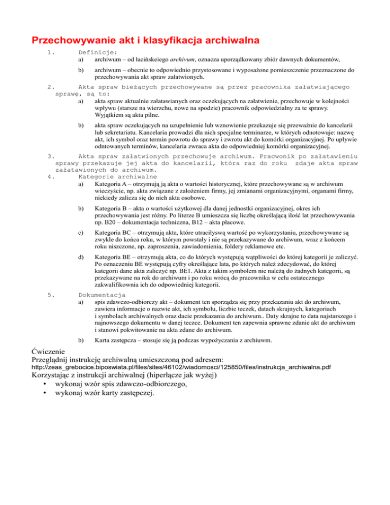 Przechowywanie akt i klasyfikacja archiwalna 1. Definicje: a) archiwum – od łacińskeiego archivum, oznacza uporządkowany zbiór dawnych dokumentów, b) archiwum – obecnie to odpowiednio przystosowane i wyposażone pomieszczenie przeznaczone do przechowywania akt spraw załatwionych. 2. Akta spraw bieżących przechowywane są przez pracownika załatwiającego sprawę, są to: a) akta spraw aktualnie załatawianych oraz oczekujących na załatwienie, przechowuje w kolejności wpływu (starsze na wierzchu, nowe na spodzie) pracownik odpowiedzialny za te sprawy. Wyjątkiem są akta pilne. b) akta spraw oczekujących na uzupełnienie lub wznowienie przekazuje się przeważnie do kancelarii lub sekretariatu. Kancelaria prowadzi dla nich specjalne terminarze, w których odnotowuje: nazwę akt, ich symbol oraz termin powrotu do sprawy i zwrotu akt do komórki organizacyjnej. Po upływie odntowanych terminów, kancelaria zwraca akta do odpowiedniej komórki organizacyjnej. 3. Akta spraw załatwionych przechowuje archiwum. Pracwonik po załatawieniu sprawy przekazuje jej akta do kancelarii, która raz do roku zdaje akta spraw załatawionych do archiwum. 4. Kategorie archiwalne a) Kategoria A – otrzymują ją akta o wartości historycznej, które przechowywane są w archiwum wieczyście, np. akta związane z założeniem firmy, jej zmianami organizacyjnymi, organami firmy, niekiedy zalicza się do nich akta osobowe. 5. b) Kategoria B – akta o wartości użytkowej dla danej jednostki organizacyjnej, okres ich przechowywania jest różny. Po literze B umieszcza się liczbę określającą ilość lat przechowywania np. B20 – dokumentacja techniczna, B12 – akta płacowe. c) Kategoria BC – otrzymują akta, które utraciłyswą wartość po wykorzystaniu, przechowywane są zwykle do końca roku, w którym powstały i nie są przekazywane do archiwum, wraz z końcem roku niszczone, np. zaproszenia, zawiadomienia, foldery reklamowe etc. d) Kategoria BE – otrzymują akta, co do których występują wątpliwości do której kategorii je zaliczyć. Po oznaczeniu BE występują cyfry określające lata, po których należ zdecydować, do której kategorii dane akta zaliczyć np. BE1. Akta z takim symbolem nie należą do żadnych kategorii, są przekazywane na rok do archiwum i po roku wrócą do pracownika w celu ostatecznego zakwalifikownia ich do odpowiedniej kategorii. Dokumentacja a) spis zdawczo-odbiorczy akt – dokument ten sporządza się przy przekazaniu akt do archiwum, zawiera informacje o nazwie akt, ich symbolu, liczbie teczek, datach skrajnych, kategoriach i symbolach archiwalnych oraz dacie przekazania do archiwum.. Daty skrajne to data najstarszego i najnowszego dokumentu w danej teczce. Dokument ten zapewnia sprawne zdanie akt do archiwum i stanowi pokwitowanie na akta zdane do archiwum. b) Karta zastępcza – stosuje się ją podczas wypożyczania z archiuwm. Ćwiczenie Przeglądnij instrukcję archiwalną umieszczoną pod adresem: http://zeas_grebocice.biposwiata.pl/files/sites/46102/wiadomosci/125850/files/instrukcja_archiwalna.pdf Korzystając z instrukcji archiwalnej (hiperłącze jak wyżej) • wykonaj wzór spis zdawczo-odbiorczego, • wykonaj wzór karty zastępczej.