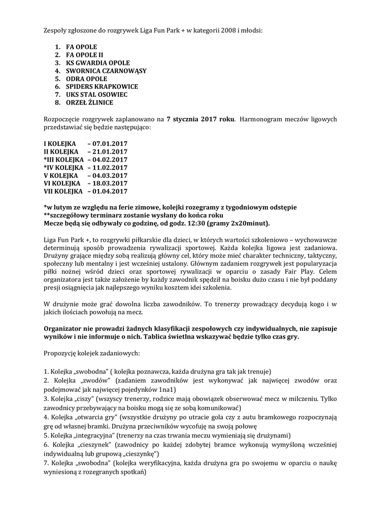Zespoły zgłoszone do rozgrywek Liga Fun Park + w kategorii 2008 i młodsi: 1. 2. 3. 4. 5. 6. 7. 8. FA OPOLE FA OPOLE II KS GWARDIA OPOLE SWORNICA CZARNOWĄSY ODRA OPOLE SPIDERS KRAPKOWICE UKS STAL OSOWIEC ORZEŁ ŹLINICE Rozpoczęcie rozgrywek zaplanowano na 7 stycznia 2017 roku. Harmonogram meczów ligowych przedstawiać się będzie następująco: I KOLEJKA II KOLEJKA *III KOLEJKA *IV KOLEJKA V KOLEJKA VI KOLEJKA VII KOLEJKA – 07.01.2017 – 21.01.2017 – 04.02.2017 – 11.02.2017 – 04.03.2017 – 18.03.2017 – 01.04.2017 *w lutym ze względu na ferie zimowe, kolejki rozegramy z tygodniowym odstępie **szczegółowy terminarz zostanie wysłany do końca roku Mecze będą się odbywały co godzinę, od godz. 12:30 (gramy 2x20minut). Liga Fun Park +, to rozgrywki piłkarskie dla dzieci, w których wartości szkoleniowo – wychowawcze determinują sposób prowadzenia rywalizacji sportowej. Każda kolejka ligowa jest zadaniowa. Drużyny grające między sobą realizują główny cel, który może mieć charakter techniczny, taktyczny, społeczny lub mentalny i jest wcześniej ustalony. Głównym zadaniem rozgrywek jest popularyzacja piłki nożnej wśród dzieci oraz sportowej rywalizacji w oparciu o zasady Fair Play. Celem organizatora jest także założenie by każdy zawodnik spędził na boisku dużo czasu i nie był poddany presji osiągnięcia jak najlepszego wyniku kosztem idei szkolenia. W drużynie może grać dowolna liczba zawodników. To trenerzy prowadzący decydują kogo i w jakich ilościach powołują na mecz. Organizator nie prowadzi żadnych klasyfikacji zespołowych czy indywidualnych, nie zapisuje wyników i nie informuje o nich. Tablica świetlna wskazywać będzie tylko czas gry. Propozycję kolejek zadaniowych: 1. Kolejka „swobodna” ( kolejka poznawcza, każda drużyna gra tak jak trenuje) 2. Kolejka „zwodów” (zadaniem zawodników jest wykonywać jak najwięcej zwodów oraz podejmować jak najwięcej pojedynków 1na1) 3. Kolejka „ciszy” (wszyscy trenerzy, rodzice mają obowiązek obserwować mecz w milczeniu. Tylko zawodnicy przebywający na boisku mogą się ze sobą komunikować) 4. Kolejka „otwarcia gry” (wszystkie drużyny po utracie gola czy z autu bramkowego rozpoczynają grę od własnej bramki. Drużyna przeciwników wycofuję na swoją połowę 5. Kolejka „integracyjna” (trenerzy na czas trwania meczu wymieniają się drużynami) 6. Kolejka „cieszynek” (zawodnicy po każdej zdobytej bramce wykonują wymyśloną wcześniej indywidualną lub grupową „cieszynkę”) 7. Kolejka „swobodna” (kolejka weryfikacyjna, każda drużyna gra po swojemu w oparciu o naukę wyniesioną z rozegranych spotkań)