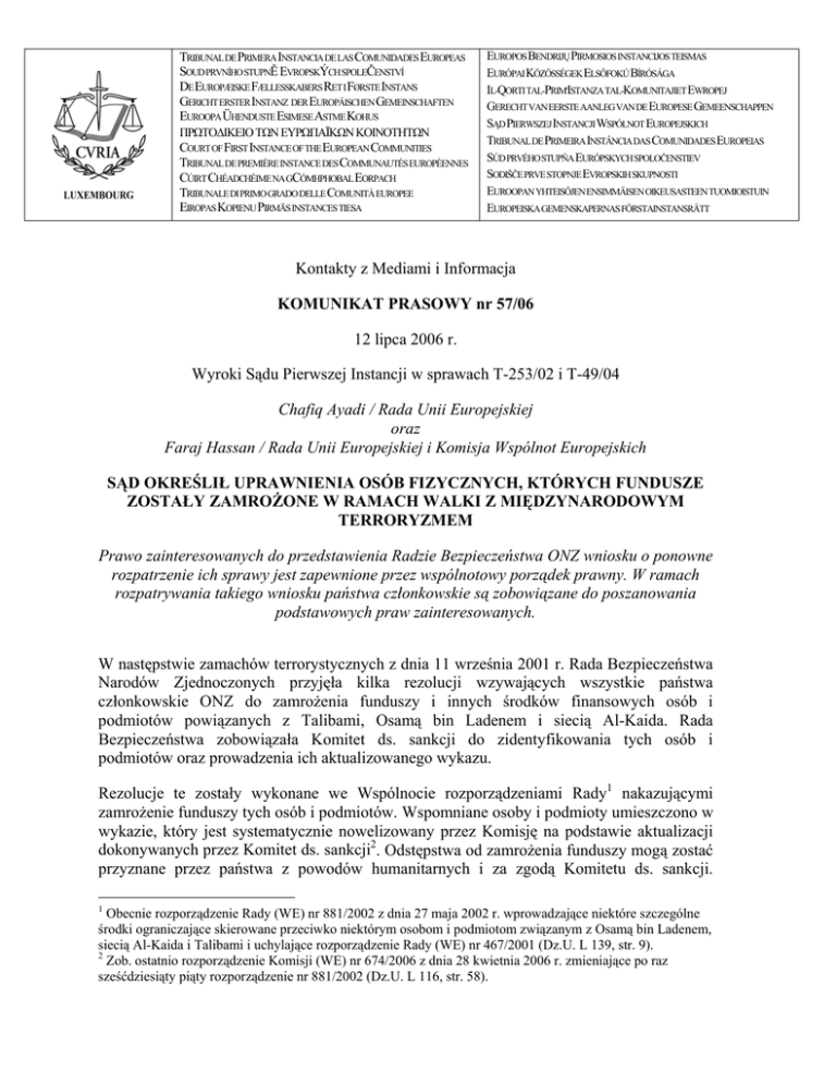 TRIBUNAL DE PRIMERA INSTANCIA DE LAS COMUNIDADES EUROPEAS SOUD PRVNÍHO STUPNĚ EVROPSKÝCH SPOLEČENSTVÍ DE EUROPÆISKE FÆLLESSKABERS RET I FØRSTE INSTANS GERICHT ERSTER INSTANZ DER EUROPÄISCHEN GEMEINSCHAFTEN EUROOPA ÜHENDUSTE ESIMESE ASTME KOHUS ΠΡΩΤΟ∆ΙΚΕΙΟ ΤΩΝ ΕΥΡΩΠΑΪΚΩΝ ΚΟΙΝΟΤΗΤΩΝ COURT OF FIRST INSTANCE OF THE EUROPEAN COMMUNITIES TRIBUNAL DE PREMIÈRE INSTANCE DES COMMUNAUTÉS EUROPÉENNES CÚIRT CHÉADCHÉIME NA GCÓMHPHOBAL EORPACH TRIBUNALE DI PRIMO GRADO DELLE COMUNITÀ EUROPEE EIROPAS KOPIENU PIRMĀS INSTANCES TIESA EUROPOS BENDRIJŲ PIRMOSIOS INSTANCIJOS TEISMAS EURÓPAI KÖZÖSSÉGEK ELSŐFOKÚ BÍRÓSÁGA IL-QORTI TAL-PRIM'ISTANZA TAL-KOMUNITAJIET EWROPEJ GERECHT VAN EERSTE AANLEG VAN DE EUROPESE GEMEENSCHAPPEN SĄD PIERWSZEJ INSTANCJI WSPÓLNOT EUROPEJSKICH TRIBUNAL DE PRIMEIRA INSTÂNCIA DAS COMUNIDADES EUROPEIAS SÚD PRVÉHO STUPŇA EURÓPSKYCH SPOLOČENSTIEV SODIŠČE PRVE STOPNJE EVROPSKIH SKUPNOSTI EUROOPAN YHTEISÖJEN ENSIMMÄISEN OIKEUSASTEEN TUOMIOISTUIN EUROPEISKA GEMENSKAPERNAS FÖRSTAINSTANSRÄTT Kontakty z Mediami i Informacja KOMUNIKAT PRASOWY nr 57/06 12 lipca 2006 r. Wyroki Sądu Pierwszej Instancji w sprawach T-253/02 i T-49/04 Chafiq Ayadi / Rada Unii Europejskiej oraz Faraj Hassan / Rada Unii Europejskiej i Komisja Wspólnot Europejskich SĄD OKREŚLIŁ UPRAWNIENIA OSÓB FIZYCZNYCH, KTÓRYCH FUNDUSZE ZOSTAŁY ZAMROŻONE W RAMACH WALKI Z MIĘDZYNARODOWYM TERRORYZMEM Prawo zainteresowanych do przedstawienia Radzie Bezpieczeństwa ONZ wniosku o ponowne rozpatrzenie ich sprawy jest zapewnione przez wspólnotowy porządek prawny. W ramach rozpatrywania takiego wniosku państwa członkowskie są zobowiązane do poszanowania podstawowych praw zainteresowanych. W następstwie zamachów terrorystycznych z dnia 11 września 2001 r. Rada Bezpieczeństwa Narodów Zjednoczonych przyjęła kilka rezolucji wzywających wszystkie państwa członkowskie ONZ do zamrożenia funduszy i innych środków finansowych osób i podmiotów powiązanych z Talibami, Osamą bin Ladenem i siecią Al-Kaida. Rada Bezpieczeństwa zobowiązała Komitet ds. sankcji do zidentyfikowania tych osób i podmiotów oraz prowadzenia ich aktualizowanego wykazu. Rezolucje te zostały wykonane we Wspólnocie rozporządzeniami Rady1 nakazującymi zamrożenie funduszy tych osób i podmiotów. Wspomniane osoby i podmioty umieszczono w wykazie, który jest systematycznie nowelizowany przez Komisję na podstawie aktualizacji dokonywanych przez Komitet ds. sankcji2. Odstępstwa od zamrożenia funduszy mogą zostać przyznane przez państwa z powodów humanitarnych i za zgodą Komitetu ds. sankcji. 1 Obecnie rozporządzenie Rady (WE) nr 881/2002 z dnia 27 maja 2002 r. wprowadzające niektóre szczególne środki ograniczające skierowane przeciwko niektórym osobom i podmiotom związanym z Osamą bin Ladenem, siecią Al-Kaida i Talibami i uchylające rozporządzenie Rady (WE) nr 467/2001 (Dz.U. L 139, str. 9). 2 Zob. ostatnio rozporządzenie Komisji (WE) nr 674/2006 z dnia 28 kwietnia 2006 r. zmieniające po raz sześćdziesiąty piąty rozporządzenie nr 881/2002 (Dz.U. L 116, str. 58). Zgodnie z właściwą procedurą, wniosek o skreślenie z wykazu może zostać przedstawiony Komitetowi ds. sankcji za pośrednictwem państwa, w którym dana osoba ma miejsce zamieszkania bądź którego jest obywatelem. W dniu 19 października 2001 r. Chafiq Ayadi, obywatel tunezyjski zamieszkujący w Dublinie, Irlandia, a w dniu 20 listopada 2003 r. Faraj Hassan, obywatel libijski, przebywający w areszcie w Brixton, Zjednoczone Królestwo, w oczekiwaniu na zakończenie procedury ekstradycji wszczętej na wniosek władz włoskich, zostali wpisani do spornego wykazu wspólnotowego. Osoby te wniosły do Sądu Pierwszej Instancji skargi o stwierdzenie nieważności tego środka. W pierwszej kolejności Sąd potwierdził, że – jak orzekł już w wyrokach w sprawie Yusuf oraz w sprawie Kadi3 – Wspólnota Europejska ma kompetencje do zarządzenia zamrożenia funduszy osób fizycznych w ramach walki z międzynarodowym terroryzmem. Środek taki nie narusza powszechnie uznanych podstawowych praw człowieka (ius cogens). W wyroku w sprawie Ayadi Sąd przyznał następnie, że zamrożenie funduszy stanowi środek szczególnie dotkliwy, lecz dodał, iż środek ten nie uniemożliwia objętym nim osobom fizycznym prowadzenia satysfakcjonującego życia osobistego, rodzinnego i społecznego, biorąc pod uwagę okoliczności. Nie zakazuje się im w szczególności wykonywania działalności zawodowej, chociaż oczywiście pobieranie dochodów z tej działalności podlega regulacji. Udzielenie licencji na wykonywanie przewozu taksówką oraz wynajęcie przez C. Ayadiego pojazdu mogą więc być w zasadzie przedmiotem odstępstwa od zamrożenia jego funduszy. Do władz krajowych należy jednak ustalenie, czy odstępstwo może zostać przyznane oraz czuwanie nad jego kontrolą i wykonaniem, w uzgodnieniu z Komitetem ds. sankcji. Wreszcie, w odniesieniu do procedury skreślenia z wykazu Sąd stwierdził, że wytyczne Komitetu ds. sankcji oraz zaskarżone rozporządzenie Rady przewidują prawo osoby fizycznej do przedstawienia wniosku o ponowne rozpatrzenie jej sprawy Komitetowi ds. sankcji za pośrednictwem rządu państwa, w którym ma ona miejsce zamieszkania bądź którego jest obywatelem. Prawo to jest więc również zapewnione przez wspólnotowy porządek prawny. W ramach rozpatrywania takiego wniosku państwa członkowskie są zobowiązane do poszanowania podstawowych praw zainteresowanych. Państwa członkowskie w szczególności: 3 • są zobowiązane do czuwania w jak największym stopniu nad tym, by zainteresowani mieli możliwość należytego przedstawienia ich stanowiska właściwym władzom krajowym; • nie mogą odmówić wszczęcia procedury ponownego rozpatrzenia wyłącznie z powodu tego, że zainteresowana osoba fizyczna nie jest w stanie przedstawić dokładnych i stosown