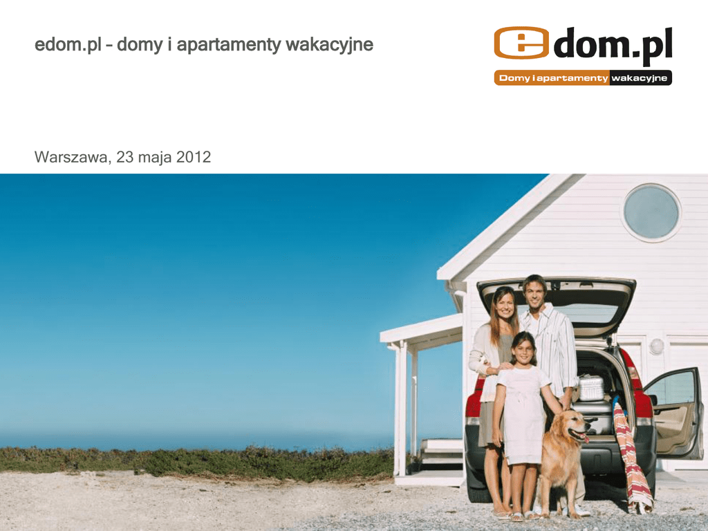 edom.pl – domy i apartamenty wakacyjne Warszawa, 23 maja 2012 Grupa E-domizil Do grupy E-domizil należą 3 liderujące w swoich segmentach rynku portale: www.e-domizil.de, www.e-domizil.ch, www.e-domizil.es, www.edom.pl Premiera w 2000r., spółka założona przez 10 prywatnych inwestorów Przeszło 250.000 domów i apartamentów wakacyjnych w ponad 80 krajach Ponad 4.000 partnerów sprzedażowych (m.in. T-Online, lastminute.com, meinestadt.de, zeit.de) Certyfikat TÜV SÜD s@fer-shopping Wielokrotny zwycięzca konkursów internetowych (Magazyn Tomorrow, Urlaub Perfekt itp.) Lider rynku w Szwajcarii www.e-hoi.de, www.e-hoi.ch Premiera w 2003r. 23.400 rejsów wycieczkowych na ponad 400 statkach (wszyscy armatorzy i touroperatorzy) Wielu partnerów takich jak: Dertour, Expedia.de, l‘tur, T-Online INSIDIAN – własna marka rejsów wakacyjnych Jakość i bezpieczeństwo potwierdzone certyfikatem TÜV „Najlepszy portal rejsów wycieczkowych“ według Geo Saison 10/2008 www.e-kolumbus.de Premiera w listopadzie 2007 Obszerna oferta wycieczek objazdowych, edukacyjnych i przygodowych oraz ekspedycji i wyjazdów trekkingowych (w chwili obecnej ponad 3.000 ofert) Sprzedaż przez znanych partnerów takich jak: ThomasCook.de, start.de, Plus Reisen, Abenteuer & Reisen... Jakość i bezpieczeństwo potwierdzone certyfikatem TÜV Portal bazujący na innowacyjnej technologii internetowej Strona 2 Portale grupy E-domizil Produkt: Domy i apartamenty wakacyjne Produkt: Rejsy wycieczkowe Produkt: Wycieczki objazdowe Strona 3 Korzyści dla klientów Oferta Łatwość obsługi i przejrzystość Kompetencja / Bezpieczeństwo ponad 250.000 Obiektów (od standardowych po luksusowe) – stan bazy na www.e-domizil.de 400 statków 23.400 rejsów od 1 do 5 gwiazdek INSIDIAN – własna marka wycieczki objazdowe wycieczki edukacyjne wycieczki przygodowe wyprawy trekingowe ekspedycje Łatwe wyszukiwanie własnych obiektów/wycieczek oraz produktów wszystkich touroperatorów Wyczerpujące i precyzyjne opisy produktów/wycieczek Dostępność w jednym miejscu ofert wszystkich znanych touroperatorów Niezależne platformy internetowe Profesjonalne infolinie obsługiwane przez doświadczonych doradców z branży turystycznej Dostępność 7 dni w tygodniu Bezpieczeństwo – certyfikat TÜV SÜD s@fer-shopping Strona 4 www.edom.pl www.e-domizil.de / edom.pl Premiera w 2000r., wersja polska w 2012r. Przeszło 250.000 domów i apartamentów wakacyjnych w ponad 80 krajach (stan bazy danych na www.e-domizil.de) Ponad 4.000 partnerów sprzedażowych w internecie Certyfikat bezpieczeństwa TÜV SÜD s@fershopping Wielokrotny zwycięzca konkursów internetowych (m.in. magazynTomorrow) Lider rynku w Szwajcarii (www.e-domizil.ch) Strona 6 Fakty, liczby... największy internetowy touroperator/pośrednik w segmencie wynajmu Domów i apartamentów wakacyjnych ponad 250.000 obiektów w więcej niż 80 krajach (stan bazy danych na www.e-domizil.de) bogata oferta – domy i apartamenty wakacyjne, ekskluzywne ville, domki letniskowe chatki góralskie w ponad 600 atrakcyjnych turystycznie regionach 60.000 obiektów akceptujących zwierzęta domowe Obsługa klienta i doradztwo na najwyższym poziomie już ponad 40.000 pozytywnych opinii o wynajmowanych obiektach dzięki ponad 400.000 więcej niż unikalnych użytkowników miesięcznie, ponad newslettera rozbudowana sieć sprzedaży z wieloma znaczącymi partnerami intuicyjnie prosta wyszukiwarka 110.000 abonentów obiektów Strona 7 Baza obiektów ponad 250.000 obiektów - ok. 8.000 obiektów w Europie - ok. 13.000 obiektów - głównie Benelux i Francja - ok. 20.000 obiektów - głównie Europa Południowa Francja, Włochy, Hiszpania) oraz kraje alpejskie - ok. 27.000 - ok. 35.000 obiektów obiektów w całej - głównie Europie Europa Północna - Prywatne domy i - włącznie z apartamenty CUENDET wakacyjne - ok. 6.000 obiektów w Skandynawii oraz Niemczech - ok. 8.000 obiektów - głównie Europa Północna - ok. 45.000 obiektów - głównie Francja - ok. 5.500 obiektów - głównie Chorwacja - ok. 8.500 obiektów - głównie Europa Południowa oraz Dania - ok. 10.000 obiektów - głównie Chorwacja, Węgry, Czechy - ok. 6300 objektów - głównie Holandia - ok. 11.000 obiektów - głównie Europa Środkowa oraz wiele własnych wyszukanych obiektów Strona 8 Opcje wyszukiwania „Szybkie wyszukiwanie“ „Wyszukiwanie tekstowe “ Strona 9 Opcje wyszukiwania „Google Maps“ „Kraje“ Strona 10 Prezentacja objektów „Szczegółowy opis” „Opinie klientów” „Mapa i okolica“ Strona 11 Prezentacja objektów „Ceny “ „Dostępność “ Strona 12 Znani partnerzy edom.pl edom.pl – nasi partnerzy... Strona 14 edom.pl – nasi partnerzy... Strona 15 edom.pl – nasi partnerzy... Strona 16 Jak działa system? Touroperatorzy Właściciele obiektów Właściciele obiektów noclegowych wynajmują je przez nasz system. System dystrybucyjny edom.pl Strony grupy e-domizil Strona gminy/regionu turystycznego edom.pl troszczy się o sprawny przebieg rezerwacji/płatności Międzynarodowa sieć partnerów …oraz prezentuje obiekty na własnych i partnerskich stronach internetowych Strona 17 Kontakt Kamil Krzyżanowski E-Mail: [email protected] Tel.: + 48 (0) 518 – 150 - 379 Edom Sp. z o.o., ul. Odolańska 14/4, PL-02-560 Warszawa Adres do korespondencji: ul. Uzdrowiskowa 9, PL-72-600 Świnoujście