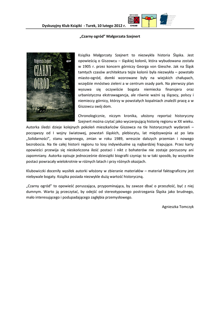 Dyskusyjny Klub Książki - Turek, 10 lutego 2012 r. „Czarny ogród” Małgorzata Szejnert Książka Małgorzaty Szejnert to niezwykła historia Śląska. Jest opowieścią o Giszowcu – śląskiej kolonii, która wybudowana została w 1905 r. przez koncern górniczy Georga von Giesche. Jak na Śląsk tamtych czasów architektura tejże kolonii była niezwykła – powstało miasto-ogród, domki wzorowane były na wiejskich chałupach, wszędzie mnóstwo zieleni a w centrum osady park. Na pierwszy plan wysuwa się oczywiście bogata niemiecka finansjera oraz urbanistyczna ekstrawagancja, ale równie ważni są ślązacy, polscy i niemieccy górnicy, którzy w powstałych kopalniach znaleźli pracę a w Giszowcu swój dom. Chronologicznie, niczym kronika, ułożony reportaż historyczny Szejnert można czytać jako wyczerpującą historię regionu w XX wieku. Autorka śledzi dzieje kolejnych pokoleń mieszkańców Giszowca na tle historycznych wydarzeń – począwszy od I wojny światowej, powstań śląskich, plebiscytu, lat międzywojnia aż po lata „Solidarności”, stanu wojennego, zmian w roku 1989, wreszcie dalszych przemian i nowego bezrobocia. Na tle całej historii regionu to losy indywidualne są najbardziej frapujące. Przez karty opowieści przewija się nieskończona ilość postaci i nikt z bohaterów nie zostaje porzucony ani zapomniany. Autorka opisuje jednocześnie dziesiątki biografii czyniąc to w taki sposób, by wszystkie postaci powracały wielokrotnie w różnych latach i przy różnych okazjach. Klubowiczki doceniły wysiłek autorki włożony w zbieranie materiałów – materiał faktograficzny jest niebywale bogaty. Książka posiada niezwykle dużą wartość historyczną. „Czarny ogród” to opowieść poruszająca, przypominająca, by zawsze dbać o przeszłość, być z niej dumnym. Warto ją przeczytać, by odejść od stereotypowego postrzegania Śląska jako brudnego, mało interesującego i podupadającego zagłębia przemysłowego. Agnieszka Tomczyk