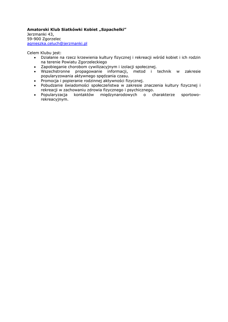 Amatorski Klub Siatkówki Kobiet „Szpachelki” Jerzmanki 43, 59-900 Zgorzelec [email protected] Celem Klubu jest: Działanie na rzecz krzewienia kultury fizycznej i rekreacji wśród kobiet i ich rodzin na terenie Powiatu Zgorzeleckiego Zapobieganie chorobom cywilizacyjnym i izolacji społecznej. Wszechstronne propagowanie informacji, metod i technik w zakresie popularyzowania aktywnego spędzania czasu. Promocja i popieranie rodzinnej aktywności fizycznej. Pobudzanie świadomości społeczeństwa w zakresie znaczenia kultury fizycznej i rekreacji w zachowaniu zdrowia fizycznego i psychicznego. Popularyzacja kontaktów międzynarodowych o charakterze sportoworekreacyjnym.