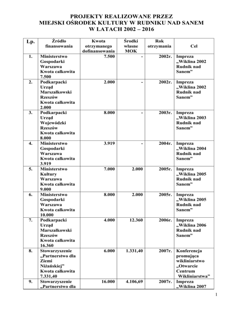 PROJEKTY REALIZOWANE PRZEZ MIEJSKI OŚRODEK KULTURY W RUDNIKU NAD SANEM W LATACH 2002 – 2016 Lp. 1. 2. 3. 4. 5. 6. 7. 8. 9. Źródło finansowania Ministerstwo Gospodarki Warszawa Kwota całkowita 7.500 Podkarpacki Urząd Marszałkowski Rzeszów Kwota całkowita 2.000 Podkarpacki Urząd Wojewódzki Rzeszów Kwota całkowita 8.000 Ministerstwo Gospodarki Warszawa Kwota całkowita 3.919 Ministerstwo Kultury Warszawa Kwota całkowita 9.000 Ministerstwo Gospodarki Warszawa Kwota całkowita 10.000 Podkarpacki Urząd Marszałkowski Rzeszów Kwota całkowita 16.360 Stowarzyszenie „Partnerstwo dla Ziemi Niżańskiej” Kwota całkowita 7.331,40 Stowarzyszenie „Partnerstwo dla Kwota otrzymanego dofinansowania 7.500 Środki własne MOK Rok otrzymania Cel - 2002r. Impreza „Wiklina 2002 Rudnik nad Sanem” 2.000 - 2002r. Impreza „Wiklina 2002 Rudnik nad Sanem” 8.000 - 2003r. Impreza „Wiklina 2003 Rudnik nad Sanem” 3.919 - 2004r. Impreza „Wiklina 2004 Rudnik nad Sanem” 7.000 2.000 2005r. Impreza „Wiklina 2005 Rudnik nad Sanem” 8.000 2.000 2005r. Impreza „Wiklina 2005 Rudnik nad Sanem” 4.000 12.360 2006r. Impreza „Wiklina 2006 Rudnik nad Sanem” 6.000 1.331,40 16.000 4.106,69 2007r. Konferencja promująca wikliniarstwo „Otwarcie Centrum Wikliniarstwa” 2007r. Impreza „Wiklina 2007 1 10. 11. 12. 13. 14. 15. 16. 17. 18. Ziemi Niżańskiej” Kwota całkowita 20.106,69 Stowarzyszenie „Partnerstwo dla Ziemi Niżańskiej” Kwota całkowita 6.591,54 Stowarzyszenie „Partnerstwo dla Ziemi Niżańskiej” Kwota całkowita 11.251,62 Stowarzyszenie „Partnerstwo dla Ziemi Niżańskiej” Kwota całkowita 9.753,53 Stowarzyszenie „Partnerstwo dla Ziemi Niżańskiej” Kwota całkowita 4.300 Stowarzyszenie „Partnerstwo dla Ziemi Niżańskiej” Kwota całkowita 560 Podkarpacki Urząd Marszałkowski Rzeszów Kwota całkowita 3.107,60 Podkarpacki Urząd Marszałkowski Rzeszów Kwota całkowita 10.000 Podkarpacki Urząd Marszałkowski Rzeszów Kwota całkowita 4.000 Stowarzyszenie „Partnerstwo dla Rudnik nad Sanem” 5.000 1.591,54 2007r. Wybory Miss Nastolatek Ziemi Niżańskiej 2007 11.220 31,62 2007r. Warsztaty wikliniarskie w Centrum Wikliniarstwa 9.750 3,53 2007r. Warsztaty artystyczne w Centrum Wikliniarstwa 4.300 - 2007r. Warsztaty – szkolenie trenerów w Centrum Wikliniarstwa 560 - 2007r. Konferencja Nawiązanie Partnerstw Wiklinowych w Domu Kultury 2.000 1.107,60 5.000 5.000 2007r. Impreza „Wiklina 2007 Rudnik nad Sanem” 4.000 - 2008r. Impreza „Wiklina 2008 Rudnik nad Sanem” 1.000 - 2008r. „ Aktywność mieszkańców 2007r. VIII Letnie Koncerty Organowe w rudnickim Kościele 2 19. 20. Ziemi Niżańskiej” Kwota całkowita 1.000 Lokalna Grupa Działania Nisko Kwota całkowita 5.000 Podkarpacki Urząd Marszałkowski Kwota całkowita 34.685 - szansą rozwoju powiatu niżańskiego” 5.000 - 22.750 4 435 MOK 7 500 UGiM 21. Podkarpacki Urząd Marszałkowski Kwota całkowita 32.201,70 22.027,13 6.126,57 wkł. finansowy 4.048 wkł. niefinanso wy 22. Krajowa Sieć Obszarów Wiejskich MOK Kwota całkowita 43.900 19.000 24.900 23. PZU SA Kwota całkowita 3.200,34 1.200 2.000,34 24. Krajowa Sieć Obszarów Wiejskich MOK Kwota całkowita 10.000 10.000 2010r. Impreza „Wiklina 2010 Rudnik nad Sanem” - 2012 „Organizacja Międzynarodow ego Pleneru wikliny Artystycznej w Rudniku nad Sanem” 2014 „Organizacja wystawy produktów lokalnych oraz opracowanie i wydanie publikacji promującej Powiat Niżański” 2014 „Ogólnopolskie Warsztaty Innowacyjnego Wikliniarstwa – Wiklina – Siła tradycji i nowoczesności” 2014 Dożynki Powiatu Niżańskiego 31.08.2014r. „Tradycyjne jadło na wiklinowej 2015 zastawie” – podczas imprezy „Wiklina 2015 Rudnik nad Sanem” ŚRODKI FINANSOWE OTRZYMANE - 185 226,13 ZŁ ŚRODKI WŁASNE MOK - 78 542,29ZŁ RAZEM: 263.768,42 ZŁ 3 Biblioteka MOK Źródło finansowania 1. 2. 3. 4. 5. 6. 7. 8. 9. 10. 11. 12. Ministerstwo Kultury Warszawa Ministerstwo Kultury Warszawa Ministerstwo Kultury Warszawa MKiDN Biblioteka Narodowa Warszawa MKiDN Biblioteka Narodowa Warszawa MKiDN Biblioteka Narodowa Warszawa MKiDN Biblioteka Narodowa Warszawa MKiDN Biblioteka Narodowa Warszawa Dotacja w programie „Akademia Orange dla bibliotek” MKiDN Biblioteka Narodowa Warszawa Dotacja w programie „Akademia Orange dla bibliotek” MKiDN Biblioteka Narodowa Warszawa Kwota otrzymanego dofinansowania 2.500,00 Środki własne - Rok otrzymania dotacji 2004r. 10.250,00 - 2005r. Zakup księgozbioru 8.800,00 - 2006r. Zakup księgozbioru 8.000,00 - 2007r. Zakup księgozbioru 8.000,00 - 2008r. Zakup księgozbioru 2.600,00 - 2009r. Zakup księgozbioru 3.000,00 - 2010r. Zakup księgozbioru 4.410,00 - 2011r. Zakup księgozbioru 330,61 - 2011r. Dostęp do Internetu 4.300,00 - 2012r. Zakup księgozbioru 474,26 - 2012r. Dostęp do Internetu 4.300,00 - 2013r. Zakup księgozbioru Cel Zakup księgozbioru 4 13. 14. 15. 16. 17. 18. Dotacja w programie „Akademia Orange dla bibliotek” MKiDN Biblioteka Narodowa Warszawa Dotacja w programie „Akademia Orange dla bibliotek” MKiDN Biblioteka Narodowa Warszawa Dotacja w programie „Akademia Orange dla bibliotek” MKiDN Biblioteka Narodowa Warszawa 1107,91 - 2013r. Dostęp do Internetu 7.900,00 1200,00 2014r. Zakup księgozbioru 1143,48 - 2014r. Dostęp do Internetu 5.400,00 - 2015r. Zakup księgozbioru 686,99 - 2015r. Dostęp do Internetu 5.400,00 - 2016r. Zakup księgozbioru RAZEM ŚRODKI FINANSOWE OTRZYMANE: 78.603,25 ZŁ ŚRODKI WŁASNE BIBLIOTEKI: 1.200 ZŁ RAZEM: 79.803,25 ZŁ 5 PROJEKTY REALIZOWANE PRZEZ TOWARZYSTWO MIŁOŚNIKÓW ZIEMI RUDNICKIEJ W LATACH 2003 – 2016 Lp . Źródło finansowania Kwota otrzymana 1. Podkarpacki Urząd Marszałkowski Rzeszów Kwota całkowita 2.000 Podkarpacki Urząd Marszałkowski Rzeszów Kwota całkowita 2.000 Podkarpacki Urząd Marszałkowski Rzeszów Kwota całkowita 4.000 Podkarpacki Urząd Marszałkowski Rzeszów Kwota całkowita 3.500 Lokalna Grupa Działania 