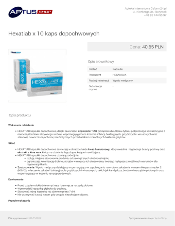 Apteka Internetowa Cefarm24.pl ul. Kleeberga 34, Białystok +48 85 744 55 97 Hexatiab x 10 kaps dopochwowych Cena: 40,65 PLN Opis słownikowy Postać Kapsułki Producent HEXANOVA Rodzaj rejestracji Wyrób medyczny Substancja czynna - Opis produktu Wskazania i działanie HEXATIAB kapsułki dopochwowe, dzięki zawartości cząsteczki TIAB (kompleks dwutlenku tytanu połączonego kowalencyjnie z nanocząsteczkami aktywnego srebra), wspomagają proces leczenia infekcji bakteryjnych, grzybiczych i wirusowych oraz stanowią nowoczesną ochronę stref intymnych przed atakiem szkodliwych bakterii i grzybów. Skład HEXATIAB kapsułki dopochwowe zawierają w składzie także kwas hialuronowy, który uwadnia i regeneruje ściany pochwy oraz ekstrakt z Aloe vera, który ma działanie łagodzące, kojące i nawilżające. HEXATIAB kapsułki dopochwowe działają podwójnie: izolują miejsce stosowania produktu od zewnętrznych drobnoustrojów; ograniczają kolonizację drobnoustrojów w miejscu ich stosowania, tworząc najlepsze z możliwych warunków dla regeneracji tkanki. Zastosowanie: Wyrób medyczny działający wspomagająco w zapobieganiu nawrotom zakażenia wirusem Herpes simplex 2 (HSV-2), w leczeniu zakażeń bakteryjnych, grzybiczych i wirusowych, takich jak kandydoza, brodawki narządów płciowych oraz wspomagająco w leczeniu ran poporodowych. Dawkowanie Przed użyciem dokładnie umyć ręce i zewnętrze narządy płciowe. Wprowadzić kapsułkę głęboko do pochwy. Stosować jedną kapsułkę raz dziennie przez 7 dni. Nie przerywać kuracji nawet gdy ustąpią niepokojące objawy. Przeciwwskazania Plik wygenerowano: 02-03-2017 Oprogramowanie sklepu: AptusShop Apteka Internetowa Cefarm24.pl ul. Kleeberga 34, Białystok +48 85 744 55 97 Nadwrażliwość na którykolwiek ze składników preparatu. Plik wygenerowano: 02-03-2017 Powered by TCPDF (www.tcpdf.org) Oprogramowanie sklepu: AptusShop