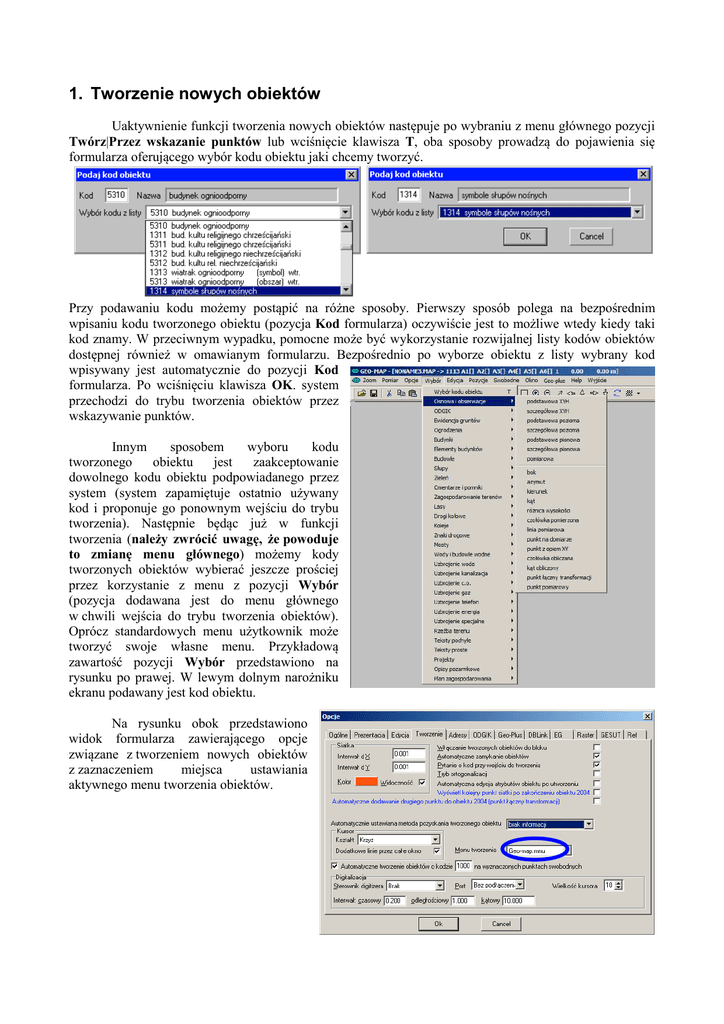 1. Tworzenie nowych obiektów Uaktywnienie funkcji tworzenia nowych obiektów następuje po wybraniu z menu głównego pozycji Twórz|Przez wskazanie punktów lub wciśnięcie klawisza T, oba sposoby prowadzą do pojawienia się formularza oferującego wybór kodu obiektu jaki chcemy tworzyć. Przy podawaniu kodu możemy postąpić na różne sposoby. Pierwszy sposób polega na bezpośrednim wpisaniu kodu tworzonego obiektu (pozycja Kod formularza) oczywiście jest to możliwe wtedy kiedy taki kod znamy. W przeciwnym wypadku, pomocne może być wykorzystanie rozwijalnej listy kodów obiektów dostępnej również w omawianym formularzu. Bezpośrednio po wyborze obiektu z listy wybrany kod wpisywany jest automatycznie do pozycji Kod formularza. Po wciśnięciu klawisza OK. system przechodzi do trybu tworzenia obiektów przez wskazywanie punktów. Innym sposobem wyboru kodu tworzonego obiektu jest zaakceptowanie dowolnego kodu obiektu podpowiadanego przez system (system zapamiętuje ostatnio używany kod i proponuje go ponownym wejściu do trybu tworzenia). Następnie będąc już w funkcji tworzenia (należy zwrócić uwagę, że powoduje to zmianę menu głównego) możemy kody tworzonych obiektów wybierać jeszcze prościej przez korzystanie z menu z pozycji Wybór (pozycja dodawana jest do menu głównego w chwili wejścia do trybu tworzenia obiektów). Oprócz standardowych menu użytkownik może tworzyć swoje własne menu. Przykładową zawartość pozycji Wybór przedstawiono na rysunku po prawej. W lewym dolnym narożniku ekranu podawany jest kod obiektu. Na rysunku obok przedstawiono widok formularza zawierającego opcje związane z tworzeniem nowych obiektów z zaznaczeniem miejsca ustawiania aktywnego menu tworzenia obiektów. Po wyborze tworzonego obiektu możemy przystąpić do wskazywania jego punktów oparcia (charakterystycznych). W trakcie wskazywania tych punktów obowiązują następujące zasady: • wciśnięcie prawego klawisza myszy powoduje dodanie do obiekty punktu w miejscu wynikającym z aktualnej pozycji kursora, • wciśnięcie lewego klawisza myszy powoduje dodanie do obiektu punktu już istniejącego w bazie danych (znajdującego się najbliżej aktualnej pozycji kursora), • wciśnięcie lewego klawisza myszy z wciśniętym klawiszem CTRL klawiatury powoduje oznaczenie nowego obiektu aktywnego, • wciśnięcie klawisza Esc powoduje skasowanie ostatniego wprowadzonego punktu. Dodatkowo możliwe są inne metody wprowadzania punktów (w oparciu o różne relacje geometryczne), o których będzie mowa w dalszej części opracowania. Generalnie służą temu dwie nowe pozycje menu głównego (Swobodne i Pozycje) jakie dodawane są do menu w chwili wejścia do tworzenia obiektów oraz dodatkowe kombinacje klawiszy klawiatury i myszy wykorzystywane w trakcie tworzenia obiektów. Zawsze po utworzeniu nowego obiektu staje się on automatycznie “obiektem aktywnym” i jest standardowo prezentowany w kolorze żółtym. Do aktywnego obiektu odnoszą się wszystkie funkcje zgromadzone w pozycji Edycja menu głównego.. Zmiana aktywnego obiektu następuje automatycznie po utworzeniu nowego obiektu lub po wskazaniu już istniejącego przez równoczesne wciśnięciu lewego klawisza myszy oraz klawisza Ctrl klawiatury 1.1 Wpisywanie atrybutów opisowych i zasady opisu atrybutami Po wprowadzeniu danych związanych z geometrią obiektu (punktów charakterystycznych) należy przystąpić do wprowadzenia atrybutów opisowych charakteryzujących dany obiekt. Jako przykład wykorzystamy przewód wodociągowy, którego obraz po wskazaniu punktów charakterystycznych przedstawiono na rysunku po prawej. Czynności tej dokonujemy przez uaktywnienie funkcji z menu głównego Edycja| Parametry aktywnego obiektu, z menu kontekstowego lub wciskając klawisz klawiatury E. W formularzu jaki pojawi się w wyniku tych działań podajemy informacje dotyczące utworzonego obiektu. Po wpisaniu podanej na poprzedniej stronie wartości obraz obiektu na ekranie będzie zbliżony do zaprezentowanego na rysunku obok. Domyślnie w środku obiektu zostanie on opisany atrybutem o nazwie Opis przewodu. System pozwala na wielokrotny opis tym samym atrybutem (tworzenie wielu etykiet). Możliwość ta jest szczególnie istotna przy długich przewodach, które powinny być opisane w wielu miejscach. Dostęp do funkcji związanych z przesuwaniem, tworzeniem nowych, usuwaniem i edycja istniejących etykiet znajdziemy w menu głównym w pozycji Edycja\operacje na punktach opisu. Przykładowy przewód z 3 etykietami przedstawiono obok. Zmiana atrybutu Opis przewodu na wartość w150 spowoduje zmianę wszystkich etykiet jak przedstawiono poniżej. 1.2 Opcje związane z tworzeniem obiektów Na proces tworzenia obiektów ma wpływ szereg opcji udostępnionych użytkownikowi w menu Opcje|Ustawienia zakładka Tworzenie. Typowe ustawienie tych opcji przedstawiono na rysunku poniżej. Siatka Parametry związane z prostokątną siatką możliwą do wykorzystania w trakcie tworzenia obiektów. Wśród parametrów mamy interwały siatki dx i dy oraz jej kolor i ewentualnie parametr decydujący o jej widoczności lub ukryciu. Domyślnym ustawieniem jest interwał 1mm, który jest również wartością minimalną. Włączanie tworzonych obiektów do bloku Włączenie opcji powoduje, że każdy utworzony obiekt jest automatycznie dodawany do bloku. Automatyczne zamykanie obiektów Włączenie opcji powoduje, że jeśli w trakcie tworzenia obiektu powtórzymy dodanie do niego punktu, który jest punktem początkowym to następuje jego automatyczne zamknięcie (zakończenie tworzenia). Pytanie o kod przy wejściu do tworzenia Włączenie opcji powoduje, że przy wejściu do tworzenia pojawia się pytanie o kod tworzonego obiektu w przeciwnym wypadku system proponuje tworzenie obiektów o ostatnio wykorzystywanym kodzie. Tryb ortogonalizacji Włączenie opcji powoduje, że kolejny punkt będzie dodawany do obiektu w taki