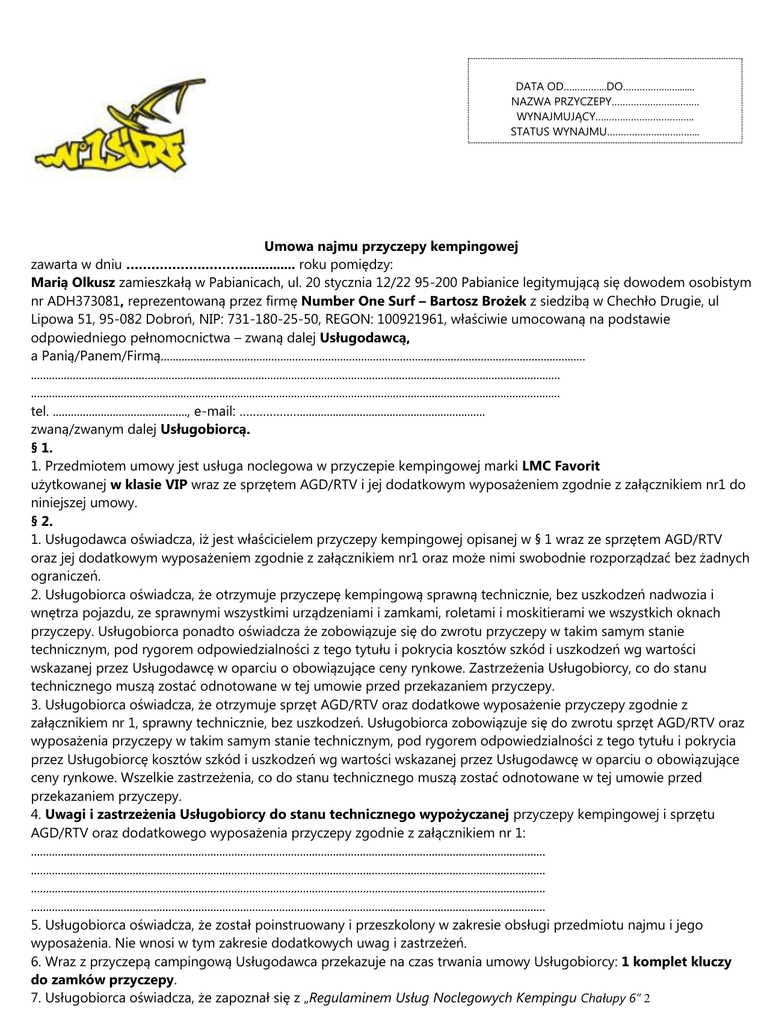 DATA OD….………...DO……………..…....... NAZWA PRZYCZEPY………………….………. WYNAJMUJĄCY….………………………….. STATUS WYNAJMU………………….………... Umowa najmu przyczepy kempingowej zawarta w dniu ……………….……….............. roku pomiędzy: Marią Olkusz zamieszkałą w Pabianicach, ul. 20 stycznia 12/22 95-200 Pabianice legitymującą się dowodem osobistym nr ADH373081, reprezentowaną przez firmę Number One Surf – Bartosz Brożek z siedzibą w Chechło Drugie, ul Lipowa 51, 95-082 Dobroń, NIP: 731-180-25-50, REGON: 100921961, właściwie umocowaną na podstawie odpowiedniego pełnomocnictwa – zwaną dalej Usługodawcą, a Panią/Panem/Firmą.............................................................................................................................................. ................................................................................................................................................................................. ................................................................................................................................................................................. tel. ............................................., e-mail: ……………….............................................................. zwaną/zwanym dalej Usługobiorcą. § 1. 1. Przedmiotem umowy jest usługa noclegowa w przyczepie kempingowej marki LMC Favorit użytkowanej w klasie VIP wraz ze sprzętem AGD/RTV i jej dodatkowym wyposażeniem zgodnie z załącznikiem nr1 do niniejszej umowy. § 2. 1. Usługodawca oświadcza, iż jest właścicielem przyczepy kempingowej opisanej w § 1 wraz ze sprzętem AGD/RTV oraz jej dodatkowym wyposażeniem zgodnie z załącznikiem nr1 oraz może nimi swobodnie rozporządzać bez żadnych ograniczeń. 2. Usługobiorca oświadcza, że otrzymuje przyczepę kempingową sprawną technicznie, bez uszkodzeń nadwozia i wnętrza pojazdu, ze sprawnymi wszystkimi urządzeniami i zamkami, roletami i moskitierami we wszystkich oknach przyczepy. Usługobiorca ponadto oświadcza że zobowiązuje się do zwrotu przyczepy w takim samym stanie technicznym, pod rygorem odpowiedzialności z tego tytułu i pokrycia kosztów szkód i uszkodzeń wg wartości wskazanej przez Usługodawcę w oparciu o obowiązujące ceny rynkowe. Zastrzeżenia Usługobiorcy, co do stanu technicznego muszą zostać odnotowane w tej umowie przed przekazaniem przyczepy. 3. Usługobiorca oświadcza, że otrzymuje sprzęt AGD/RTV oraz dodatkowe wyposażenie przyczepy zgodnie z załącznikiem nr 1, sprawny technicznie, bez uszkodzeń. Usługobiorca zobowiązuje się do zwrotu sprzęt AGD/RTV oraz wyposażenia przyczepy w takim samym stanie technicznym, pod rygorem odpowiedzialności z tego tytułu i pokrycia przez Usługobiorcę kosztów szkód i uszkodzeń wg wartości wskazanej przez Usługodawcę w oparciu o obowiązujące ceny rynkowe. Wszelkie zastrzeżenia, co do stanu technicznego muszą zostać odnotowane w tej umowie przed przekazaniem przyczepy. 4. Uwagi i zastrzeżenia Usługobiorcy do stanu technicznego wypożyczanej przyczepy kempingowej i sprzętu AGD/RTV oraz dodatkowego wyposażenia przyczepy zgodnie z załącznikiem nr 1: ............................................................................................................................................................................ ............................................................................................................................................................................ ............................................................................................................................................................................ ............................................................................................................................................................................ 5. Usługobiorca oświadcza, że został poinstruowany i przeszkolony w zakresie obsługi przedmiotu najmu i jego wyposażenia. Nie wnosi w tym zakresie dodatkowych uwag i zastrzeżeń. 6. Wraz z przyczepą campingową Usługodawca przekazuje na czas trwania umowy Usługobiorcy: 1 komplet kluczy do zamków przyczepy. 7. Usługobiorca oświadcza, że zapoznał się z „Regulaminem Usług Noclegowych Kempingu Chałupy 6” 2 § 3. 1. Usługobiorca zobowiązuje się korzystać z przyczepy kempingowej, ze sprzętu AGD/RTV, dodatkowego wyposażenia przyczepy zgodnie z ich przeznaczeniem i właściwościami oraz przestrzegać instrukcji ich użytkowania. 2. Usługobiorca nie może dokonywać w przyczepie kempingowej oraz jej wyposażeniu żadnych zmian i przeróbek, jak również samodzielnych napraw. § 4. 1. Przyczepę kempingową wraz ze sprzętem AGD/RTV oraz dodatkowym wyposażeniem przyczepy, o których mowa powyżej, przekazuje się Usługobiorcy od dnia ............./................./2015 roku do dnia ............/................./2015 roku godzina zwrotu 11.00. Usługobiorca zobowiązuje się do zwrotu przyczepy do upływu tego terminu, pod rygorem kary umownej w wysokości opłaty dobowej za każdą rozpoczętą godzinę spóźnienia). 2. Miejscem wydania i odbioru przyczepy jest Kemping Chałupy 6. 3. Osoba wyznaczona do kontaktu na miejscu po stronie Usługodawcy: Olga - tel. 501 217482, Osoba odpowiedzialna za przyczepę (biuro n1surf) Bartek tel. 503 968 190, 4. Usługobiorca nie ma możliwości przedłużenia terminu usługi noclegowej bez wyraźnej zgody Usługodawcy wyrażonej w formie aneksu do niniejszej Umowy. § 5. 1. Strony ustalają, że całkowite wynagrodzenie Usługodawcy wynosi: ................................zł (słownie:........................................................................................................ złotych) 2. Usługobiorca zobowiązany jest wpłacić 1 000,00 zł (słownie: jeden tysiąc złotych ) tytułem kaucji, na zab