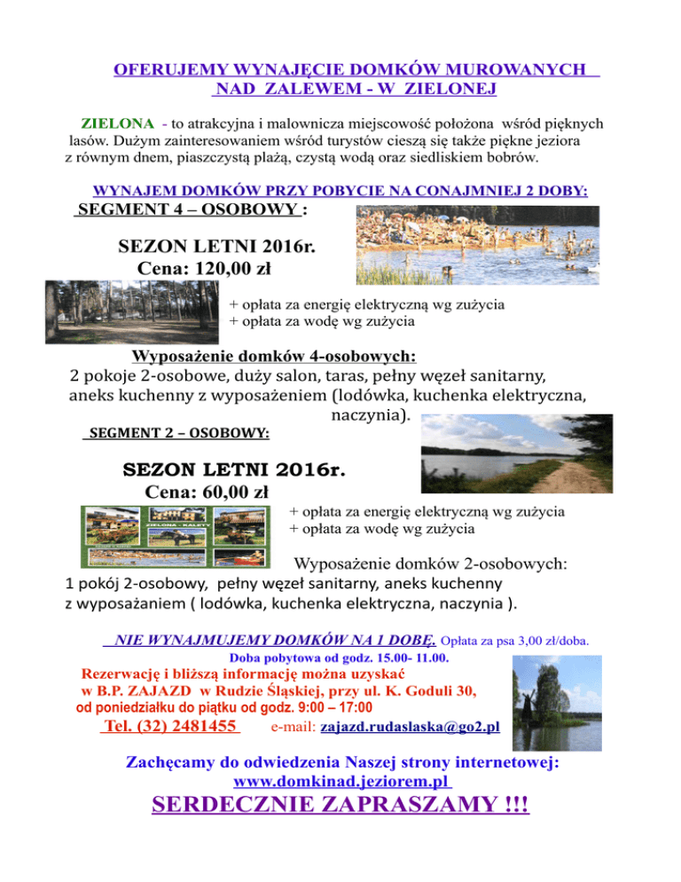 OFERUJEMY WYNAJĘCIE DOMKÓW MUROWANYCH NAD ZALEWEM - W ZIELONEJ ZIELONA - to atrakcyjna i malownicza miejscowość położona wśród pięknych lasów. Dużym zainteresowaniem wśród turystów cieszą się także piękne jeziora z równym dnem, piaszczystą plażą, czystą wodą oraz siedliskiem bobrów. WYNAJEM DOMKÓW PRZY POBYCIE NA CONAJMNIEJ 2 DOBY: SEGMENT 4 – OSOBOWY : SEZON LETNI 2016r. Cena: 120,00 zł + opłata za energię elektryczną wg zużycia + opłata za wodę wg zużycia Wyposażenie domków 4-osobowych: 2 pokoje 2-osobowe, duży salon, taras, pełny węzeł sanitarny, aneks kuchenny z wyposażeniem (lodówka, kuchenka elektryczna, naczynia). SEGMENT 2 – OSOBOWY: SEZON LETNI 2016r. Cena: 60,00 zł + opłata za energię elektryczną wg zużycia + opłata za wodę wg zużycia Wyposażenie domków 2-osobowych: 1 pokój 2-osobowy, pełny węzeł sanitarny, aneks kuchenny z wyposażaniem ( lodówka, kuchenka elektryczna, naczynia ). NIE WYNAJMUJEMY DOMKÓW NA 1 DOBĘ. Opłata za psa 3,00 zł/doba. Doba pobytowa od godz. 15.00- 11.00. Rezerwację i bliższą informację można uzyskać w B.P. ZAJAZD w Rudzie Śląskiej, przy ul. K. Goduli 30, od poniedziałku do piątku od godz. 9:00 – 17:00 Tel. (32) 2481455 e-mail: [email protected] Zachęcamy do odwiedzenia Naszej strony internetowej: www.domkinad.jeziorem.pl SERDECZNIE ZAPRASZAMY !!!