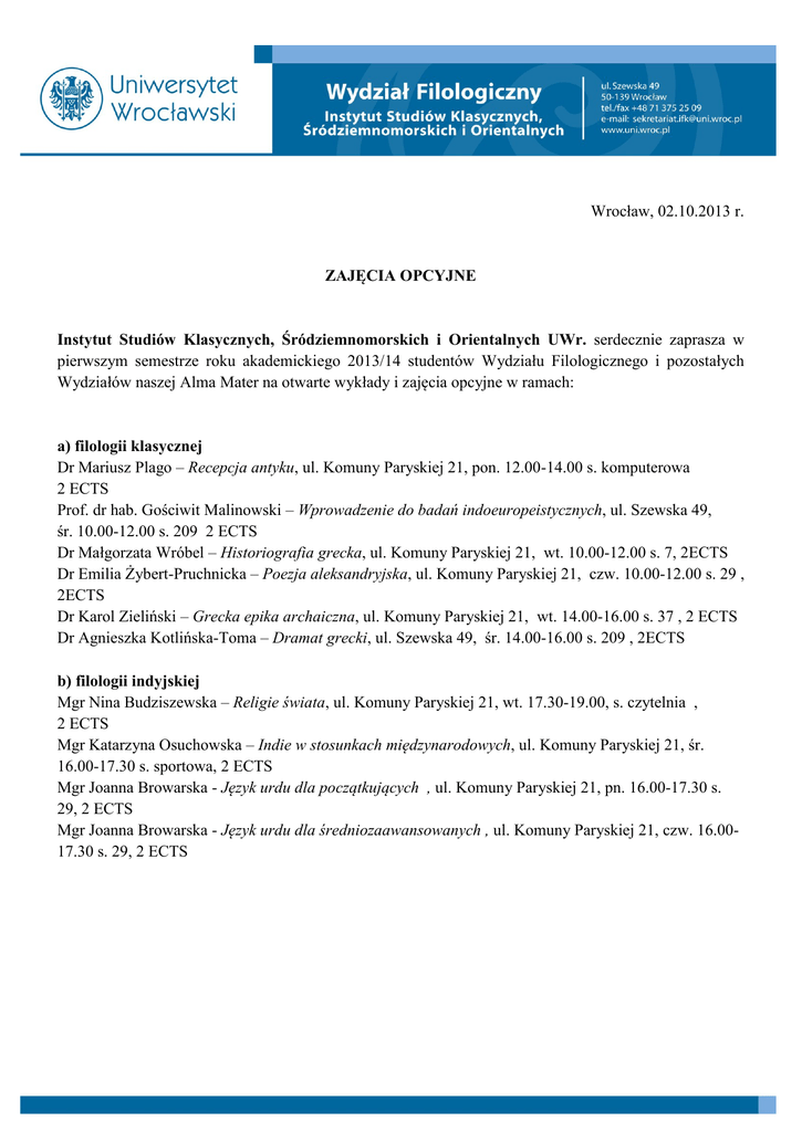 Wrocław, 02.10.2013 r. ZAJĘCIA OPCYJNE Instytut Studiów