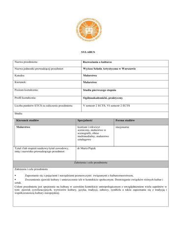 SYLABUS Nazwa przedmiotu: Rozważania o kulturze Nazwa jednostki prowadzącej przedmiot: Wyższa Szkoła Artystyczna w Warszawie Katedra: Malarstwa Kierunek: Malarstwo Poziom kształcenia: Studia pierwszego stopnia Profil kształcenia: Ogólnoakademicki, praktyczny Liczba punktów ETCS za zaliczenie przedmiotu: V semestr 2 ECTS, VI semestr 2 ECTS Studia Kierunek studiów Specjalność Forma studiów Malarstwo kostium i rekwizyt sceniczny, malarstwo w scenografii, obraz multimedialny, malarstwo sztalugowe stacjonarne Tytuł i/lub stopień naukowy/tytuł zawodowy, imię i nazwisko prowadzącego przedmiot: dr Maria Piątek Założenia i cele przedmiotu Założenia i cele przedmiotu Zapoznanie się z pojęciami i narzędziami poznawczymi związanymi z kulturoznawstwem, Zrozumienie zjawisk kultury i umieszczenie ich w kontekście społecznym. Dostrzeganie związków różnych kultur i sztuk. Celem przedmiotu jest spojrzenie na kulturę w szerokim kontekście antropologicznym z uwzględnieniem wielu aspektów w tym: zjawisk cywilizacyjnych, wytworów kultury, języka, tradycji, zabawy, symbolu a także zapoznanie się z tradycją i współczesnością kultury europejskiej. Wymagania wstępne Kwalifikacja na trzeci rok studiów. Symbol efektu kształcenia na poziomie kierunku K_W06 Zamierzony efekt kształcenia Opis efektu kształcenia na poziomie przedmiotu Ma wiedzę na temat możliwości oraz docierania do źródeł wiedzy dotyczącej antropologicznego rozumienia kultury. Weryfikacja efektu kształcenia - Zaliczenie z ocenąprezentacja audiowizualna lub wypowiedź ustna na wybrany przez wykładowcę temat , K_W09 Wie jak świadomie poruszać się w obecność na zajęciach obrębie podstawowych zagadnień związanych ze spojrzeniem - na kulturę i jej wytwory. K_U17 Potrafi świadomie wykorzystać swoją wiedzę dotyczącą rozważań o kulturze do celów projektowych. K_U21 Umie dotrzeć do źródeł informacji na temat antropologicznego rozumienia kultury jako całościowego dorobku społeczeństw, a więc tego wszystkiego, co decyduje o naszym człowieczeństwie i wyodrębnia nas ze świata natury oraz poszukiwanie możliwości spojrzenia na kulturę możliwie szeroko i nie zawężać pojęcia kultury tylko do twórczości artystycznej, a jej wytworów do dzieł sztuki. K_K02 Jest zdolny do gromadzenia i przetwarzania informacji z dziedziny kultury, które umie twórczo wykorzystać do realizowanych projektów. K_K03 Jest zdolny do rozumienia potrzeby uczenia się przez całe życie i świadomego wykorzystywania tej wiedzy w praktyce. K_K07 Jest zdolny do definiowania własnych sądów na tematy dotyczące rozważań o kulturze. Liczba godzin dydaktycznych i formy zajęć i punkty ECTS: : Liczba godzin dydaktycznych (w tym): Przedmioty Forma zajęć: (W - wykład, Ć - ćwiczenia, K konwersatorium) Razem W Ć 2 K test semestralny Rozważania o kulturze W+Ć 60 Rok I W Semestr I Ć K ECTS R W 30 30 Rok II Semestr II Ć K ECTS R W Ć Semestr III K ECTS R W Rok III Ć Semestr IV K ECTS R Semestr V W Ć K ECTS 2 0 1 0 Semestr VI W Ć K ECTS R W 20 10 2 R – rygor (egzamin, - E, zaliczenie z oceną –Zo, zaliczenie - Z Treści programowe nauczania [ treść zajęć] 3 R Rok IV Z o 2 Z o Semestr VII Ć K ECTS R SEMESTR V Wykład 1-2 Pojęcie i definicja kultury Podkreślenie antynomii kultura-natura. Potoczne i naukowe rozumienie kultury. Wykład 3-4 Kultura popularna. Problemy związane z oceną kultury popularnej jako jednego z najistotniejszych zjawisk świata współczesnego. Definicja kultury masowej, kultury popularnej, kultury elitarnej. Wykład 5-9 Sztuka i dzieło sztuki. Definicja sztuki i jej funkcje. Teorie analizy dzieła artystycznego – teoria Wollflina, teoria Panofskiego. Analiza formalna dzieła artystycznego. Wykład 10 Wybrane muzea świata w kontekście poznawania i ochrony kultury. Zbiory najsłynniejszych muzeów świata w Internecie. Ćwiczenie 1 Pojęcie i definicje kultury. Praca z tekstem Antoniny Kłoskowskiej (A. Kłoskowka, Pojęcia i problemy wiedzy o kulturze w: Encyklopedia kultury polskiej XX wieku, t. 1, pod red. A. Kłoskowska, Wrocław 1991, s. 17-50). Ćwiczenie 2 Kultura masowa. Praca z tekstem Davida Riesmana „Samotny tłum”. Wewnątrzsterowne i zewnątrzsterowne społeczeństwo – dyskusja. Ćwiczenie 3 Kultura popularna. Dyskusja z wprowadzeniem terminów: komercjalizacja, homogenizacja, autotematyzm, kicz. Praca ze słownikiem. Analiza tekstu A. Moles, Kicz, czyli sztuka szczęścia. Prezentacja na temat kiczu w kulturze. Ćwiczenie 4 Kultura popularna – rola sztuki pop artu dla przełamywania granic między kulturą niską i wysoką. Filozofia Waltera Benjamina – teoria pasaży. Prezentacja na temat głównych założeń doktryny pop artu z uwzględnieniem aspektu łączenia kultury wysokiej i niskiej. Ćwiczenie 5 Teorie analizy dzieła artystycznego – teoria Wollflina, teoria Panofskiego. Analiza i interpretacja obrazów: „Trzy Gracje” Rembrandta, „Ostatnia wieczerza” Leonarda da Vinci. Ćwiczenie 6, 7 Pojęcia analizy formalnej dzieła artystycznego. Analiza i interpretacja wybranych dzieł sztuki. Prezentacje. Ćwiczenie 8 Cykl w dziele artystycznym i jego struktura. Analiza struktur wybranych dzieł muzycznych, plastycznych, literackich. Ćwiczenie 9 Graffiti – sztuka czy akty wandalizmu? Dyskusja na temat sztuki street-artu. Prezentacja. Ćwiczenie 10 Artysta rzemieślnik, odtwórca, twórca, prowokator. Rola artysty i znaczenie jego twórczości dla kultury. Historycznie zmienna rola artysty w społeczeństwie - prezentacja. Ćwiczenie 11 Dyskusja na temat pojęcia tradycji w kulturze. Prezentacja o sztuce ludowej i jej wpływie na sztukę w Polsce. Ćwiczenie 12, 13 Wybrane muzea świata w kontekście poznawania i ochrony kultury. Zbiory najsłynniejszych muzeów świata w Internecie. Ćwiczenia. Luwr w Paryżu, Ermitaż w Petersburgu, Prado w Madrycie. Muzeum Narodowe w W-wie. Prezentacje – mistrz i uczeń. Ćwiczeni