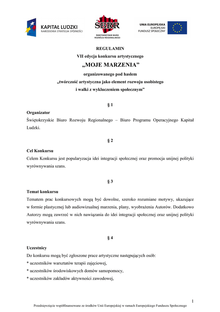 REGULAMIN VII edycja konkursu artystycznego „MOJE MARZENIA” organizowanego pod hasłem „twórczość artystyczna jako element rozwoju osobistego i walki z wykluczeniem społecznym” §1 Organizator Świętokrzyskie Biuro Rozwoju Regionalnego – Biuro Programu Operacyjnego Kapitał Ludzki. §2 Cel Konkursu Celem Konkursu jest popularyzacja idei integracji społecznej oraz promocja unijnej polityki wyrównywania szans. §3 Temat konkursu Tematem prac konkursowych mogą być dowolne, szeroko rozumiane motywy, ukazujące w formie plastycznej lub audiowizualnej marzenia, plany, wyobraŜenia Autorów. Dodatkowo Autorzy mogą zawrzeć w nich nawiązania do idei integracji społecznej oraz unijnej polityki wyrównywania szans. §4 Uczestnicy Do konkursu mogą być zgłoszone prace artystyczne następujących osób: * uczestników warsztatów terapii zajęciowej, * uczestników środowiskowych domów samopomocy, * uczestników zakładów aktywności zawodowej, 1 Przedsięwzięcie współfinansowane ze środków Unii Europejskiej w ramach Europejskiego Funduszu Społecznego * mieszkańców domów pomocy społecznej, * mieszkańców domów dziecka, * podopiecznych stowarzyszeń, działających na rzecz osób zagroŜonych wykluczeniem społecznym, * podopiecznych innych instytucji, zaangaŜowanych w działania z zakresu opieki społecznej i walki z wykluczeniem społecznym. §5 Prace 1. Do Konkursu moŜna zgłaszać prace w następujących kategoriach: 1) prace plastyczne - malarstwo, - rysunek i grafika, - inne formy artystyczne, 2) inscenizacja – przedstawienie przygotowane z udziałem podopiecznych danej placówki, tematyką nawiązujące do załoŜeń konkursowych, zaprezentowane w dowolnej formie (występ teatralny, muzyczny, taneczny, itp.). Występ nie moŜe trwać dłuŜej niŜ 10 minut. 2. Prace ujęte w pkt. 1 1) mogą być wykonane w następujących technikach: - malarstwo: akwarela, pastela, gwasz, olej itp., na dowolnym podłoŜu, - rysunek i grafika: ołówek, kredki, węgiel, piórko itp., - inne formy artystyczne: tkactwo, haft, płaskorzeźba, itp. 3. KaŜda praca ujęta w pkt. 1 1) i 2) powinna być oznaczona w następujący sposób: na płycie/odwrocie obrazu winna być trwale zamieszczona metryczka zawierająca następujące dane: tytuł pracy, imię i nazwisko autora/autorów, kategoria, nazwa organizacji, którą reprezentuje/ą autor/autorzy, adres, telefon organizacji lub placówki zgłaszającej pracę, imię i nazwisko kierownika/dyrektora placówki zgłaszającej pracę, imię i nazwisko opiekuna lub wychowawcy lub terapeuty uczestnika zgłaszanego do konkursu do materiału/pracy powinna być dołączona koperta, zawierająca podpisane oświadczenia, stanowiące załącznik nr 1 do Regulaminu. 4. Materiały ujęte w pkt. 1 2) powinny być nagrane w formie audiowizualnej i dostarczone w wersji elektronicznej na płycie CD, DVD lub pamięci przenośnej (USB). Forma zgłoszenia powinna uwzględniać powszechnie dostępne formaty plików elektronicznych, w celu umoŜliwienia Komisji Konkursowej przeprowadzenia oceny nadesłanego dzieła. 2 Przedsięwzięcie współfinansowane ze środków Unii Europejskiej w ramach Europejskiego Funduszu Społecznego 5. Prace i materiały naleŜy dostarczać (pocztą, przesyłką kurierską lub osobiście) do siedziby Świętokrzyskiego Biura Rozwoju Regionalnego – Biura Programu Operacyjnego Kapitał Ludzki, ul. Jagiellońska 70, 25-956 Kielce, w terminie do 31.10.2014 r. O zakwalifikowaniu do konkursu decyduje data dostarczenia pracy do siedziby ŚBRR – Biura PO KL. §6 Terminy Lipiec 2014 r. – ogłoszenie konkursu 31.10.2014 r. – ostateczny termin dostarczania prac Listopad/Grudzień 2014 r. – ogłoszenie wyników i wręczenie nagród §7 Komisja Konkursowa i ocena prac 1. Zgłoszone do konkursu prace oceniać Komisja w składzie: Krzysztof Szczypiór – Zastępca Dyrektora ŚBRR ds. POKL – Przewodniczący Komisji Artur Potaczała – Kierownik Zespołu Informacji, Promocji i Pomocy Technicznej Dorota Hlebicka-Józefowicz – Kierownik Sekcji ds. Informacji i Promocji Kamil Wojtczak – Starszy Specjalista ds. Informacji i Promocji Anna Pałys – Specjalista ds. Informacji i Promocji - Sekretarz Komisji Komisja Konkursowa ma za zadanie: 1. Wyłonienie najlepszych 3 prac w kaŜdej z kategorii/podkategorii, 2. Przyznanie wyróŜnień w kaŜdej z kategorii/podkategorii. W uzasadnionych przypadkach Komisja ma prawo przyznać wyróŜnienia poza wskazanymi kategoriami/podkegoriami. 3. Sporządzenie protokołu z posiedzenia Komisji z podpisami wszystkich członków Komisji. §8 Nagrody Autorzy nagrodzonych prac otrzymają pamiątkowe dyplomy i atrakcyjne nagrody rzeczowe – wartościowe materiały do twórczości plastycznej oraz zestawy upominków ŚBRR – Biura PO KL. Dodatkowo, placówka z której zgłoszonych zostanie najwięcej prac, otrzyma atrakcyjny zestaw akcesoriów plastycznych. 3 Przedsięwzięcie współfinansowane ze środków Unii Europejskiej w ramach Europejskiego Funduszu Społecznego §9 Rozstrzygnięcie Konkursu 1. Wyniki konkursu zostaną zamieszczone na witrynie internetowej ŚBRR – Biura PO KL oraz opublikowane w biuletynie informacyjnym ŚBRR – Biura PO KL. 2. O rozstrzygnięciu Konkursu placówki, z których pochodzą nagrodzone i wyróŜnione prace, zostaną powiadomione telefonicznie. 3. Uroczyste ogłoszenie wyników i wręczenie nagród nastąpi w listopadzie/grudniu 2014 r. § 10 Postanowienia końcowe 1. Organizator zastrzega sobie moŜliwość eksponowania nagrodzonych prac w ramach wystawy pokonkursowej w listopadzie/grudniu 2014 r. i innych przedsięwzięć o charakterze promocyjnym i artystycznym. 2. Po zakończeniu konkursu prace moŜna odbierać w siedzibie ŚBRR – Biura PO KL przy ul. Jagiellońskiej 70 w Kielcach, w godz. 800 - 1500 od oficjalnego ogłoszenia wyników do 31.01.2015 r. 3. W sprawach nieuregulowanych niniejszym Regulaminem decyduje Organizator. 4 Przedsięwzięci
