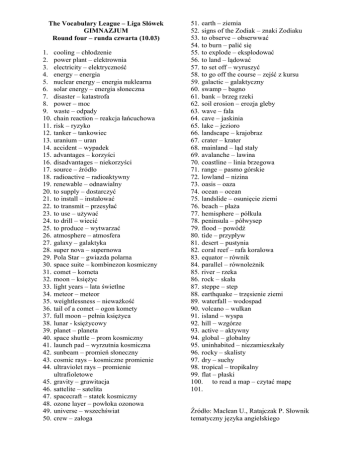 The Vocabulary League – Liga Słówek GIMNAZJUM Round four – runda czwarta (10.03) 1. 2. 3. 4. 5. 6. 7. 8. 9. 10. 11. 12. 13. 14. 15. 16. 17. 18. 19. 20. 21. 22. 23. 24. 25. 26. 27. 28. 29. 30. 31. 32. 33. 34. 35. 36. 37. 38. 39. 40. 41. 42. 43. 44. 45. 46. 47. 48. 49. 50. cooling – chłodzenie power plant – elektrownia electricity – elektryczność energy – energia nuclear energy – energia nuklearna solar energy – energia słoneczna disaster – katastrofa power – moc waste – odpady chain reaction – reakcja łańcuchowa risk – ryzyko tanker – tankowiec uranium – uran accident – wypadek advantages – korzyści disadvantages – niekorzyści source – źródło radioactive – radioaktywny renewable – odnawialny to supply – dostarczyć to install – instalować to transmit – przesyłać to use – używać to drill – wiecić to produce – wytwarzać atmosphere – atmosfera galaxy – galaktyka super nova – supernowa Pola Star – gwiazda polarna space suite – kombinezon kosmiczny comet – kometa moon – księżyc light years – lata świetlne meteor – meteor weightlessness – nieważkość tail of a comet – ogon komety full moon – pełnia księżyca lunar - księżycowy planet – planeta space shuttle – prom kosmiczny launch pad – wyrzutnia kosmiczna sunbeam – promień słoneczny cosmic rays – kosmiczne promienie ultraviolet rays – promienie ultrafioletowe gravity – grawitacja sattelite – satelita spacecraft – statek kosmiczny ozone layer – powłoka ozonowa universe – wszechświat crew – załoga 51. earth – ziemia 52. signs of the Zodiak – znaki Zodiaku 53. to observe – obserwwać 54. to burn – palić się 55. to explode – eksplodować 56. to land – lądować 57. to set off – wyruszyć 58. to go off the course – zejść z kursu 59. galactic – galaktyczny 60. swamp – bagno 61. bank – brzeg rzeki 62. soil erosion – erozja gleby 63. wave – fala 64. cave – jaskinia 65. lake – jezioro 66. landscape – krajobraz 67. crater – krater 68. mainland – ląd stały 69. avalanche – lawina 70. coastline – linia brzegowa 71. range – pasmo górskie 72. lowland – nizina 73. oasis – oaza 74. ocean – ocean 75. landslide – osunięcie ziemi 76. beach – plaża 77. hemisphere – półkula 78. peninsula – półwysep 79. flood – powódź 80. tide – przypływ 81. desert – pustynia 82. coral reef – rafa koralowa 83. equator – równik 84. parallel – równoleżnik 85. river – rzeka 86. rock – skała 87. steppe – step 88. earthquake – trzęsienie ziemi 89. waterfall – wodospad 90. volcano – wulkan 91. island – wyspa 92. hill – wzgórze 93. active – aktywny 94. global – globalny 95. uninhabited – niezamieszkały 96. rocky – skalisty 97. dry – suchy 98. tropical – tropikalny 99. flat – płaski 100. to read a map – czytać mapę 101. Źródło: Maclean U., Ratajczak P. Słownik tematyczny języka angielskiego