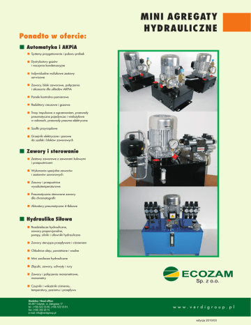 Ponadto w ofercie: MINI AGREGATY HYDRAULICZNE Automatyka i AKPiA Systemy przygotowania i poboru próbek Dystrybutory gazów i naczynia kondensacyjne Indywidualne walizkowe zestawy serwisowe Zawory, bloki zaworowe, połączenia i akcesoria dla układów AKPiA Panele kontrolno-pomiarowe Reduktory cieczowe i gazowe Trasy impulsowe z ogrzewaniem, przewody pneumatyczne pojedyncze i wielożyłowe w osłonach, przewody pneumo-elektryczne Szafki przyrządowe Grzejniki elektryczne i parowe do szafek i bloków zaworowych Zawory i sterowanie Zestawy zaworowe z zaworami kulowymi i przepustnicami Wykonania specjalne zaworów i zestawów zaworowych Zasuwy i przepustnice wysokotemperaturowe Pneumatycznie sterowane zawory dla chromatografii Aktuatory pneumatyczne 4-tłokowe Hydraulika Siłowa Rozdzielacze hydrauliczne, zawory proporcjonalne, pompy, silniki i siłowniki hydrauliczne Zawory sterujące przepływem i ciśnieniem Chłodnice oleju, powietrzne i wodne Mini zasilacze hydrauliczne Złączki, zawory, uchwyty i rury Zawory i połączenia manometrowe, manometry Sp. z o.o. Czujniki i wskaźniki ciśnienia, temperatury, poziomu i przepływu Siedziba / Head office: 80-557 Gdańsk, ul. Załogowa 17 tel.: (+58) 522 03 80, (+58) 522 03 81, fax: (+58) 342 20 10 e-mail: [email protected] w w w. v e r d i g r o u p . p l edycja 2010/03 Blok montażowy UA Mini agregaty hydrauliczne: Mini agregaty hydrauliczne budowane są na bazie 4 typów głównych bloków montażowych, umożliwiających kompaktową zabudowę pompy i silnika, przyłączenie nabojowych zaworów sterujących o różnych konfiguracjach oraz podłączenia do instalacji. Wykonania standardowe lub pod indywidualne potrzeby Klienta (patrz zdjęcia). Parametry głównych komponentów: Zbiorniki: Pompy: Silniki: Blok montażowy U4 Blok montażowy UR Cechy charakterystyczne: zwarta budowa małe gabaryty możliwość dostosowania układu do własnych potrzeb łatwa obsługa i serwis Blok montażowy UB Przykłady zastosowań: urządzenia mobilne urządzenia dźwigowe, podnośniki nożycowe maszyny przemysłowe: giętarki, praso-kontenery, sztaplarki windy dla osób niepełnosprawnych Siedziba / Head office: 80-557 Gdańsk, ul. Załogowa 17 tel.: (+58) 522 03 80, (+58) 522 03 81, fax: (+58) 342 20 10 e-mail: [email protected] w w w. v e r d i g r o u p . p l edycja 2010/03