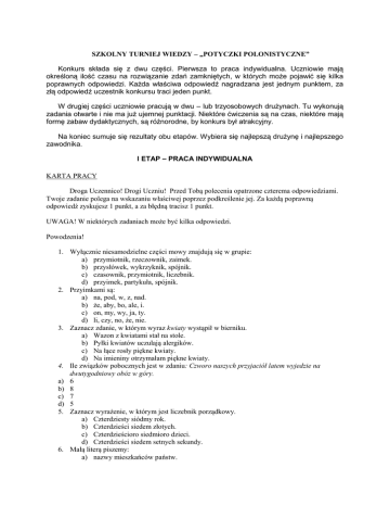 SZKOLNY TURNIEJ WIEDZY – „POTYCZKI POLONISTYCZNE” Konkurs składa się z dwu części. Pierwsza to praca indywidualna. Uczniowie mają określoną ilość czasu na rozwiązanie zdań zamkniętych, w których może pojawić się kilka poprawnych odpowiedzi. Każda właściwa odpowiedź nagradzana jest jednym punktem, za złą odpowiedź uczestnik konkursu traci jeden punkt. W drugiej części uczniowie pracują w dwu – lub trzyosobowych drużynach. Tu wykonują zadania otwarte i nie ma już ujemnej punktacji. Niektóre ćwiczenia są na czas, niektóre mają formę zabaw dydaktycznych, są różnorodne, by konkurs był atrakcyjny. Na koniec sumuje się rezultaty obu etapów. Wybiera się najlepszą drużynę i najlepszego zawodnika. I ETAP – PRACA INDYWIDUALNA KARTA PRACY Droga Uczennico! Drogi Uczniu! Przed Tobą polecenia opatrzone czterema odpowiedziami. Twoje zadanie polega na wskazaniu właściwej poprzez podkreślenie jej. Za każdą poprawną odpowiedź zyskujesz 1 punkt, a za błędną tracisz 1 punkt. UWAGA! W niektórych zadaniach może być kilka odpowiedzi. Powodzenia! 1. Wyłącznie niesamodzielne części mowy znajdują się w grupie: a) przymiotnik, rzeczownik, zaimek. b) przysłówek, wykrzyknik, spójnik. c) czasownik, przymiotnik, liczebnik. d) przyimek, partykuła, spójnik. 2. Przyimkami są: a) na, pod, w, z, nad. b) że, aby, bo, ale, i. c) on, my, wy, ja, ty. d) li, czy, no, że, nie. 3. Zaznacz zdanie, w którym wyraz kwiaty wystąpił w bierniku. a) Wazon z kwiatami stał na stole. b) Pyłki kwiatów uczulają alergików. c) Na łące rosły piękne kwiaty. d) Na imieniny otrzymałam piękne kwiaty. 4. Ile związków pobocznych jest w zdaniu: Czworo naszych przyjaciół latem wyjedzie na dwutygodniowy obóz w góry. a) 6 b) 8 c) 7 d) 5 5. Zaznacz wyrażenie, w którym jest liczebnik porządkowy. a) Czterdziesty siódmy rok. b) Czterdzieści siedem złotych. c) Czterdzieścioro siedmioro dzieci. d) Czterdzieści siedem setnych sekundy. 6. Małą literą piszemy: a) nazwy mieszkańców państw. 7. 8. 9. 10. 11. 12. 13. 14. 15. 16. 17. b) nazwy mieszkańców miast. c) przymiotniki od nazw własnych. d) Odpowiedzi b) i c) są właściwe. Czasowniki w formie osobowej występują w grupie: a) zrobiono, ukończono, zaśpiewano. b) rozpoczęto, powzięto, zamknięto. c) wzięli, mówił, będę śpiewała. d) wziąć, zrobić, ukończyć. Czasowniki nieprzechodnie to: a) otworzyć, zapiąć. b) oczekiwać, śpiewać. c) zaprosić, zapowiedzieć. d) siedzieć, wylegiwać się. Wskaż grupę, w której znajdują się wyłącznie wyrazy w stopniu wyższym. a) Lepiej, mądrzejszy, dobrze. b) Bardziej ślisko, grzeczniejszy. c) Dobry, lepszy, najlepszy. d) Szybko, szybciej, najszybciej. Która grupa zawierają wyłącznie czasowniki niedokonane? a) Przeczytały, narysowało, szliśmy. b) Zgadywał, będę sprzątać, zjem. c) Pisały, recytuj, rysowalibyśmy. d) Zgadnąć, korzystać, sprzątnąć. Czasowniki dokonane: a) tworzą czas przyszły w sposób złożony. b) tworzą czas przyszły w sposób prosty. c) nie tworzą form dla czasu przeszłego. d) tworzą formy w czasie teraźniejszym. Ze względu na cel wypowiedzi wypowiedzenia dzielimy na: a) pojedyncze i złożone. b) zdanie i równoważnik zdania. c) neutralne i wykrzyknikowe. d) oznajmujące, pytające i rozkazujące. Zaznacz zdania, w których czasownik występuje w trybie przypuszczającym. a) Może napiszę sprawdzian z polskiego na piątkę. b) Czy mogłabyś mi pomóc? c) Nie kąp się za długo w zimnej wodzie. d) Chętnie bym dzisiaj zagrał w tenisa. Wskaż wypowiedzenie rozkazujące. a) Ależ to fantastyczna zabawa! b) Zróbmy sobie krótką przerwę. c) Zaproszę przyjaciół na lody. d) Pójdziecie z nami do kina? Zaznacz zdanie, w którym występuje podmiot domyślny. a) W księgarni odbyło się spotkanie ze znanym autorem. b) Czytelnicy i dziennikarze spotkali się z autorem w księgarni. c) Z chęcią poszlibyśmy do domu kultury na wieczór poetycki. d) Sienkiewicz jest autorem wielu historycznych powieści. W której grupie znajdują się wyłącznie poprawnie zapisane wyrazy? a) Znienacka, naprzód, w okamgnieniu, beze mnie, co dzień, wszem wobec. b) Wsuwka, jaskółka, pustułka, pszczoła, obszar, piegża, odżywianie, gżegżółka. c) Druh, błahostka, hulajnoga, zuch, wujaszek, zhardzieć, wierzch, kucharka. d) Wszystkie wyrazy w grupach: a), b) i c) zostały prawidłowo zapisane. W której grupie znajdują się wyłącznie wyrazy z rz? a) Wzo...ec, ma...ec, ude... . 18. 19. 20. 21. 22. 23. 24. 25. 26. 27. 28. b) Ka...dy, no...yce, ja...yny. c) ...ałosny, ...aba, b...ózka . d) ...elazo, ró...a, ko...uch. W którym zdaniu dopełnienie występuje w narzędniku? a) Ania pisała szkolne wypracowanie. b) Ania pisała dzisiaj nowym piórem. c) Nagle w piórze skończył się atrament. d) Dziewczynka pożyczyła więc długopis. Które wypowiedzenia nie są równoważnikami zdania? a) Stań na baczność! b) Baczność! c) Wyrównajcie szereg! d) Równać szereg! W którym zdaniu grupa podmiotu jest nieprawidłowo oddzielona od grupy orzeczenia? a) Na kuchennym stole stoją / pachnące kwiaty. b) Mama posadziła /czerwone róże w ogródku. c) Klomby z kwiatami/ pięknie ozdabiają ogród. d) Nad kwiatowymi rabatami unoszą się /pszczoły. Orzeczenie złożone występuje w zdaniu: a) Monika będzie opalać się na plaży. b) Rodzice nie zaprosili przyjaciół na jubileusz. c) Zegar na ratuszu nieznacznie spóźnia się. d) Bilety są sprzedawane przez kasjera. Która wypowiedź jest prawdziwa? a) Podmiot i orzeczenie to nieodmienne części mowy. b) Podmiot i orzeczenie tworzą związek zgody. c) Podmiot i orzeczenie odmieniają się przez przypadki. d) Żadna wypowiedź nie jest prawdziwa. Które przysłowia zostały nieprawidłowo zapisane. a) Nie chwal dnia przed wschodem słońca. b) Dobrymi chęciami piekło jest wybrakowane. c) Złej tanecznicy przeszkadza falbana u spódnicy. d)