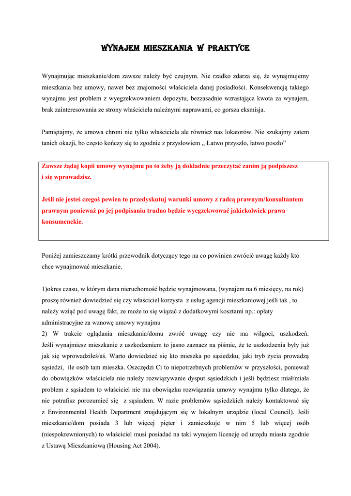 WYNAJEM MIESZKANIA W PRAKTYCE Wynajmując mieszkanie/dom zawsze należy być czujnym. Nie rzadko zdarza się, że wynajmujemy mieszkania bez umowy, nawet bez znajomości właściciela danej posiadłości. Konsekwencją takiego wynajmu jest problem z wyegzekwowaniem depozytu, bezzasadnie wzrastająca kwota za wynajem, brak zainteresowania ze strony właściciela należnymi naprawami, co gorsza eksmisja. Pamiętajmy, że umowa chroni nie tylko właściciela ale również nas lokatorów. Nie szukajmy zatem tanich okazji, bo często kończy się to zgodnie z przysłowiem ,, Łatwo przyszło, łatwo poszło” Zawsze żądaj kopii umowy wynajmu po to żeby ją dokładnie przeczytać zanim ją podpiszesz i się wprowadzisz. Jeśli nie jesteś czegoś pewien to przedyskutuj warunki umowy z radcą prawnym/konsultantem prawnym ponieważ po jej podpisaniu trudno będzie wyegzekwować jakiekolwiek prawa konsumenckie. Poniżej zamieszczamy krótki przewodnik dotyczący tego na co powinien zwrócić uwagę każdy kto chce wynajmować mieszkanie. 1)okres czasu, w którym dana nieruchomość będzie wynajmowana, (wynajem na 6 miesięcy, na rok) proszę również dowiedzieć się czy właściciel korzysta z usług agencji mieszkaniowej jeśli tak , to należy wziąć pod uwagę fakt, ze może to się wiązać z dodatkowymi kosztami np.: opłaty administracyjne za wznowę umowy wynajmu 2) W trakcie oglądania mieszkania/domu zwróć uwagę czy nie ma wilgoci, uszkodzeń. Jeśli wynajmiesz mieszkanie z uszkodzeniem to jasno zaznacz na piśmie, że te uszkodzenia były już jak się wprowadziłeś/aś. Warto dowiedzieć się kto mieszka po sąsiedzku, jaki tryb życia prowadzą sąsiedzi, ile osób tam mieszka. Oszczędzi Ci to niepotrzebnych problemów w przyszłości, ponieważ do obowiązków właściciela nie należy rozwiązywanie dysput sąsiedzkich i jeśli będziesz miał/miała problem z sąsiadem to właściciel nie ma obowiązku rozwiązania umowy wynajmu tylko dlatego, że nie potrafisz porozumieć się z sąsiadem. W razie problemów sąsiedzkich należy kontaktować się z Environmental Health Department znajdującym się w lokalnym urzędzie (local Council). Jeśli mieszkanie/dom posiada 3 lub więcej pięter i zamieszkuje w nim 5 lub więcej osób (niespokrewnionych) to właściciel musi posiadać na taki wynajem licencję od urzędu miasta zgodnie z Ustawą Mieszkaniową (Housing Act 2004). 3) Jaka kwota jest wymagana na starcie, czy właściciel/agencja wymaga depozytu, czy tylko miesięcznej opłaty z góry, czy są jakieś opłaty administracyjne. Proszę pamiętać, że po zapłacie depozytu masz prawo otrzymać rachunek oraz informacje dotyczącą gdzie będzie przechowywany depozyt. 4) Agencja mieszkaniowa czuwająca nad nieruchomością właściciela ma prawo do inspekcji danej nieruchomości, a Ty masz prawo być obecnym przy takiej inspekcji. 5)Poproś o kopię dokumentu Energy Performance Certificate [EPC]. Jest to dokument przedstawiający zużycie energii w danej nieruchomości, tj: gaz, opłaty za zużycie wody, ogrzewanie. Właściciel ma obowiązek wystawić taki dokument jest to wymóg prawny z 1 października 2008 roku. 6)Masz prawo otrzymać kopię certifikatu dotyczącego sprawdzenia bezpieczeństwa gazu w danej nieruchomości (coroczne testowanie) Zapytaj również: - o detektor dwutlenku węgla/alarmu dymu a także o ich regularne testowanie. - o alarm antywłamaniowy i jego regularne testowanie - o zasady segregacji odpadów - możliwość składania wizyt przez rodzinę (dłuższy pobyt rodziny) - w której grupie znajduje się nieruchmość jeśli chodzi o Council Tax Na koniec kilka słów o eksmisji: Nielegalna eksmisja ma miejsce wtedy gdy właściciel eksmituje lub próbuje eksmitować rezydenta z domu bez zastosowania procedur prawnych. O nielegalnej eksmisji mówimy też w przypadkach wyrzucenia rzeczy osobistych rezydenta przez właściciela lub zmiany zamka w drzwiach. Nielegalna eksmisja jest przestępstwem karnym według Aktu Ochrona przed eksmisją z roku 1977 (Protection from Eviction Act 1977). Ten sam akt dotyczy prześladowania. Prześladowanie w prawie wynajmu oznacza takie zachowanie właściciela lub agenta agencji mieszkaniowej, które zakłóca spokój i komfort rezydentów lub objawia się wstrzymaniem lub wycofaniem się z obowiązku napraw należnych do wykonania przez właściciela. Osobą nękającą rezydenta może być również współlokator, sąsiad. Powyższy informator to tylko skrót najistotniejszych faktów związanych z wynajmem, jeśli masz problem z właścicielem/agencją, nie rozumiesz umowy wynajmu i chcesz naszej porady, mediacji czy też reprezentacji prawnej to zadzwoń do Nas już dziś.