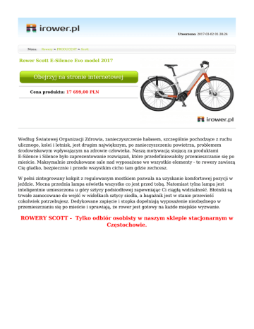 Utworzono: 2017-03-02 01:38:24 Menu: Rowery > PRODUCENT > Scott Rower Scott E-Silence Evo model 2017 Obejrzyj na stronie internetowej Cena produktu: 17 699,00 PLN Według Światowej Organizacji Zdrowia, zanieczyszczenie hałasem, szczególnie pochodzące z ruchu ulicznego, kolei i lotnisk, jest drugim największym, po zanieczyszczeniu powietrza, problemem środowiskowym wpływającym na zdrowie człowieka. Naszą motywacją stojącą za produktami E-Silence i Silence było zaprezentowanie rozwiązań, które przedefiniowałoby przemieszczanie się po mieście. Maksymalnie zredukowane sale nad wyposażone we wszystkie elementy - te rowery zawiozą Cię gładko, bezpiecznie i przede wszystkim cicho tam gdzie zechcesz. W pełni zintegrowany kokpit z regulowanym mostkiem pozwala na uzyskanie komfortowej pozycji w jeździe. Mocna przednia lampa oświetla wszystko co jest przed tobą. Natomiast tylna lampa jest inteligentnie umieszczona u góry sztycy podsiodłowej zapewniając Ci ciągłą widzialność. Błotniki są trwałe zamocowane do wejść w widełkach sztycy siodła, a bagażnik jest w stanie przewieść cokolwiek potrzebujesz. Dedykowane zapięcie i stopka dopełniają wyposażenie niezbędnego w przemieszczaniu się po mieście i sprawiają, że rower jest gotowy na każde miejskie wyzwanie. ROWERY SCOTT - Tylko odbiór osobisty w naszym sklepie stacjonarnym w Częstochowie. Producent Rozmiary ram Manetki Klamki hamulców Hamulce Mechanizm korbowy Oś korbowodu Prowadzenie łańcucha Kierownica Mostek/ Wspornik kierownicy Scott S, M, L, XL H3 Shimano BR-T8000 Disc Brose System 508Wh integrated Battery FSA CK746 Boost 39T Conti Syncros UC1.5 620mm / 15° bend Syncros UC1.5 adjustable with integrated Light Pedały VP 615 Sztyca Syncros UC1.5 / 31.6 w. Int. Light Siodło Syncros UC1.5 Piasta przód Shimano HB-M525 Piasta tył Nuvinci N330 Harmony Łańcuch Conti belt 1344 Kaseta/ wolnobieg 20 T Conti sprocket +3mm Szprychy Sapim double butted Obręcze Rodi Opony Wyposażenie dodatkowe Typ roweru Przeznaczenie Schwalbe Marathon Supreme Performacne 700x50c Światła: Front Integrated Supernova E3 Rear Integrated in Seatpost Supernova Tail Light 2 RACK & FeNDeRS: Carrier with spring / Curana wide fenders Ursus kickstand Abus Lock Holder for Bordo Miejski, Trekkingowy, Elektryczny, Urban Męski Tylny amortyzator /Damper Rozmiar kół Sezon Rodzina 28" 2017 Damski Kolor Szary_#808080 Waga 23.90 kg Rama E-Silence podwójnie cieniowane 6061 Alum. / 700c Widelec/amortyzator Glory Wheel / Tapered 1.5” 1 1/8” semi integ. OD 50/61mm / ID 44/55mm Stery Przerzutka przód Przerzutka tył Adres: www.erowery.pl [email protected] NEW Silence rigid Nuvinci N330 Harmony Adres: www.irower.pl Telefon: 605 515 185, 34 361 16 71 Email: [email protected] Email: