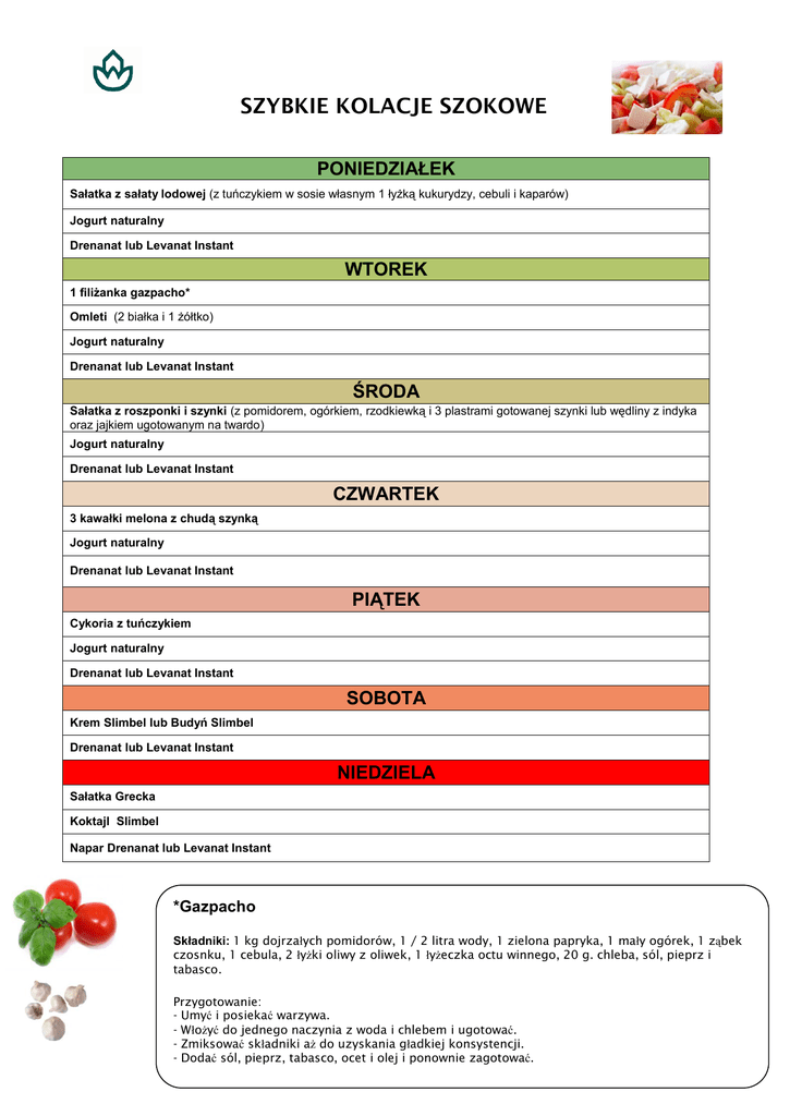 SZYBKIE KOLACJE SZOKOWE PONIEDZIAŁEK Sałatka z sałaty lodowej (z tuńczykiem w sosie własnym 1 łyżką kukurydzy, cebuli i kaparów) Jogurt naturalny Drenanat lub Levanat Instant WTOREK 1 filiżanka gazpacho* Omleti (2 białka i 1 żółtko) Jogurt naturalny Drenanat lub Levanat Instant ŚRODA Sałatka z roszponki i szynki (z pomidorem, ogórkiem, rzodkiewką i 3 plastrami gotowanej szynki lub wędliny z indyka oraz jajkiem ugotowanym na twardo) Jogurt naturalny Drenanat lub Levanat Instant CZWARTEK 3 kawałki melona z chudą szynką Jogurt naturalny Drenanat lub Levanat Instant PIĄTEK Cykoria z tuńczykiem Jogurt naturalny Drenanat lub Levanat Instant SOBOTA Krem Slimbel lub Budyń Slimbel Drenanat lub Levanat Instant NIEDZIELA Sałatka Grecka Koktajl Slimbel Napar Drenanat lub Levanat Instant *Gazpacho Składniki: 1 kg dojrzałych pomidorów, 1 / 2 litra wody, 1 zielona papryka, 1 mały ogórek, 1 ząbek czosnku, 1 cebula, 2 łyżki oliwy z oliwek, 1 łyżeczka octu winnego, 20 g. chleba, sól, pieprz i tabasco. Przygotowanie: - Umyć i posiekać warzywa. - Włożyć do jednego naczynia z woda i chlebem i ugotować. - Zmiksować składniki aż do uzyskania gładkiej konsystencji. - Dodać sól, pieprz, tabasco, ocet i olej i ponownie zagotować.