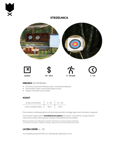 STRZELNICA outdoor 35 – 40 zł 6 – 30 osób 1–2h MIEJSCE DO WYBORU strzelnica na terenie Półwyspu Lipa | www.polwyseplipa.pl teren hotelu Gołuń | www.hotel-golun.com.pl miejsce wskazane przez Ciebie KOSZT liczba uczestników 6 - 20 21 - 30 cena za osobę (netto) 40 zł 35 zł Cena zawiera realizację pakietu atrakcji (opis poniżej), obsługę zajęć przez animatora, nagrody. Na życzenie organizujemy kompleksowe pobyty (transport, wyżywienie, nocleg, imprezy wieczorne), koszty i plan pobytu ustalane indywidulnie po konsultacji. Oferta oraz podane ceny mają jedynie charakter informacyjny i nie stanowią oferty handlowej w rozumieniu art. 66 par. 1 kodeksu cywilnego i mogą ulec zmianie, firma ubezpieczona od OC. LICZBA OSÓB 6 – 30 w przypadku grupy poniżej 6 os. obowiązuje opłata jak za 6 os. PRZEBIEG IMPREZY strzały próbne - strzelanie do celu przy pomocy 3 różnych narzędzi: łuku sportowego markera paintballowego wiatrówki na śrut zawody - strzelanie do celu na punkty, zawody strzeleckie (animator będzie przyznawał odpowiednią ilość punktów za każdy strzał) slalom w alkogoglach – dodatkowa konkurencja, niespodzianka ogłoszenie zwycięzcy i wręczenie nagród Istnieje również możliwość wypożyczenia sprzętu bez opieki instruktora. Cennik oraz godziny otwarcia wypożyczalni sprzętu sportowego, znajdującej się na terenie Półwyspu Lipa, można pobrać ze strony www.sparker.pl (zakładka GRUPY INDYWIDUALNE). *Istnieje możliwość poszerzenia oferty o inne pakiety imprez integracyjnych, przykładowe oferty na stronie www.sparker.pl w dziale IMPREZY FIRMOWE, zapraszamy. **Istnieje możliwość indywidualnych modyfikacji scenariusza i dostosowania czasu trwania imprezy do potrzeb grupy np. wprowadzenie przerwy obiadowej.
