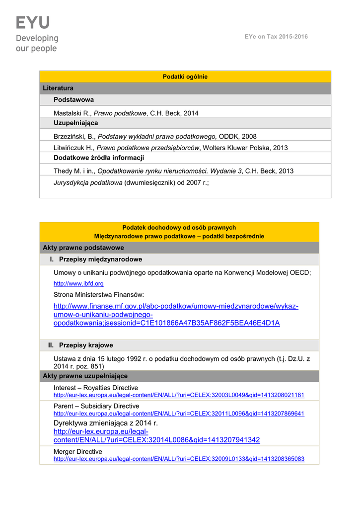 EYe on Tax 2015-2016 Podatki ogólnie Literatura Podstawowa Mastalski R., Prawo podatkowe, C.H. Beck, 2014 Uzupełniająca Brzeziński, B., Podstawy wykładni prawa podatkowego, ODDK, 2008 Litwińczuk H., Prawo podatkowe przedsiębiorców, Wolters Kluwer Polska, 2013 Dodatkowe źródła informacji Thedy M. i in., Opodatkowanie rynku nieruchomości. Wydanie 3, C.H. Beck, 2013 Jurysdykcja podatkowa (dwumiesięcznik) od 2007 r.; Podatek dochodowy od osób prawnych Międzynarodowe prawo podatkowe – podatki bezpośrednie Akty prawne podstawowe I. Przepisy międzynarodowe Umowy o unikaniu podwójnego opodatkowania oparte na Konwencji Modelowej OECD; http://www.ibfd.org Strona Ministerstwa Finansów: http://www.finanse.mf.gov.pl/abc-podatkow/umowy-miedzynarodowe/wykazumow-o-unikaniu-podwojnegoopodatkowania;jsessionid=C1E101866A47B35AF862F5BEA46E4D1A II. Przepisy krajowe Ustawa z dnia 15 lutego 1992 r. o podatku dochodowym od osób prawnych (t.j. Dz.U. z 2014 r. poz. 851) Akty prawne uzupełniające Interest – Royalties Directive http://eur-lex.europa.eu/legal-content/EN/ALL/?uri=CELEX:32003L0049&qid=1413208021181 Parent – Subsidiary Directive http://eur-lex.europa.eu/legal-content/EN/ALL/?uri=CELEX:32011L0096&qid=1413207869641 Dyrektywa zmieniająca z 2014 r. http://eur-lex.europa.eu/legalcontent/EN/ALL/?uri=CELEX:32014L0086&qid=1413207941342 Merger Directive http://eur-lex.europa.eu/legal-content/EN/ALL/?uri=CELEX:32009L0133&qid=1413208365083 EYe on Tax 2015-2016 Podatek dochodowy od osób prawnych Międzynarodowe prawo podatkowe – podatki bezpośrednie Capital Duty Directive http://eur-lex.europa.eu/legal-content/EN/ALL/?uri=CELEX:32008L0007 Orzecznictwo ETS http://curia.europa.eu/jcms/jcms/j_6/ Literatura Podstawowa Obońska, Wacławczyk, Walter , Podatek dochodowy od osób prawnych. Komentarz, 2014, C.H.Beck, 2014; Model Tax Convention on income and on capital - introduction, model convention, commentary; The Application of the OECD Model Tax Convention to partnerships http://www.oecd-ilibrary.org/taxation/model-tax-convention-on-income-and-on-capital2010/r-15-the-application-of-the-oecd-model-tax-convention-topartnerships_9789264175181-108-en OECD Model Tax Convention revised proposals concerning the interpretation and application of Article 5 (Permanent Establishment) http://www.oecd.org/ctp/treaties/PermanentEstablishment.pdf Uzupełniająca Brzeziński B., Model Konwencji OECD : komentarz, Oficyna Prawa Polskiego, 2010 Banach, J., Polskie umowy o unikaniu podwójnego opodatkowania komentarz, C.H. Beck, 2002 Ziółek, Ł. i in., Międzynarodowe planowanie podatkowe, Difin, 2007 Dodatkowe źródła informacji Vogel K., Klaus Vogel on double taxation conventions, Kluwer, 2006 Świderska G. (red.), Sprawozdanie finansowe bez tajemnic, Difin, 2008 EYe on Tax 2015-2016 Podatek akcyzowy i prawo celne Akty prawne podstawowe W zakresie podatku akcyzowego Ustawa z dnia 6 grudnia 2008 r. o podatku akcyzowym (Dz.U. z 2014 r. poz. 752 j.t.) Rozporządzenie Ministra Finansów z dnia 8 lutego 2013 r. w sprawie zwolnień od podatku akcyzowego (Dz.U. z 2013 r. poz. 212) Dyrektywa Rady 2008/118/WE z dnia 16 grudnia 2008 r. w sprawie ogólnych zasad dotyczących podatku akcyzowego, uchylająca dyrektywę 92/12/EWG (Dz. U. UE. L z 2009 r. Nr 9, s. 12 ze zm.) Dyrektywa Rady 2003/96/WE z dnia 27 października 2003 r. w sprawie restrukturyzacji wspólnotowych przepisów ramowych dotyczących opodatkowania produktów energetycznych i energii elektrycznej (Dz.U.UE.L z 2003 r. Nr 283, s. 51 ze zm.) W zakresie prawa celnego Wspólnotowy Kodeks Celny – Rozporządzenie Rady Nr 2913/92 z dnia 12 października 1992 r. ustanawiające Wspólnotowy Kodeks Celny (Dz.U. UE. L z 1992 r. Nr 302, s. 1 ze zm.) Ustawa z dnia 19 marca 2004 r. Prawo celne (Dz.U. z 2013 r. poz.727 ze zm.) Akty prawne uzupełniające W zakresie podatku akcyzowego Pozostałe rozporządzenia wykonawcze do ustawy o podatku akcyzowym W zakresie prawa celnego Rozporządzenie wykonawcze do WKC – rozporządzenie Komisji Nr 2454/93 z dnia 2 lipca 1993 r. ustanawiające przepisy w celu wykonania rozporządzenia Rady Nr 2913/92 ustanawiającego Wspólnotowy Kodeks Celny (Dz.U.UE.L z 1993 r. Nr 253, s. 1 ze zm.) Rozporządzenie Rady (EWG) nr 1186/2009 z dnia 16 listopada 2009 r. ustanawiające wspólnotowy system zwolnień celnych (Dz.U.UE.L. z 2009 r. Nr 324 s. 23 ze zm.) Pozostałe rozporządzenia Komisji Europejskiej lub Ministra Finansów dotyczące kwestii specyficznych, np. Wspólna Taryfa Celna Literatura Podstawowa Strona internetowa Służby Celnej oraz serwis internetowy Finanse, zakładki Cło i Akcyza (Ministerstwo Finansów) Lux M., Prawo Celne Unii Europejskiej, Wydawnictwo BW Szczecin 2004 r. Parulski Sz., Akcyza. Komentarz, Wolters Kluwer 2010 r. Uzupełniająca Krzysztof Lasiński-Sulecki (red. nauk.), Akcyza w prawie Unii Europejskiej. Komentarz, Wolters Kluwer 2013 r. Morawski W., Wspólnotowy kodeks celny. Komentarz, Wolters Kluwer 2007 r. EYe on Tax 2015-2016 Kalinowska A, Parulski Sz., Akcyza w orzecznictwie Europejskiego Trybunału Sprawiedliwości, CH Beck 2006 r. Postępowania sądowe i podatkowe Akty prawne podstawowe Ustawa z 29 sierpnia 1997 r. Ordynacja podatkowa (j.t. Dz. U. z 2012 r., poz. 749 ze zm.) Rozporządzenie Ministra Finansów z 20 czerwca 2007 r. w sprawie upoważnienia do wydawania interpretacji przepisów prawa podatkowego (Dz. U. Nr 112, poz. 770 ze zm.) Rozporządzenie Ministra Finansów z 20 czerwca 2007 r. w sprawie wzoru wniosku o wydanie interpretacji przepisów prawa podatkowego oraz sposobu uiszczenia opłaty od wniosku (j.t, Dz.U z 2013 r., poz. 188) Ustawa z 28 września 1991 r. o kontroli skarbowej (j.t. Dz. U. z 2011 r. Nr 41, poz. 214 ze zm.) Ustawa z 2 lipca 2004 r. o swobodzie działalności gospodarczej (j.t. Dz. U. z 2013 r., poz. 672) – Rozdział 5 Kontrola działalności gospodarczej przedsiębiorcy Ustawa z 30 sierpnia 2002 r. Prawo o postępowaniu przed sądami administracyjnymi (j