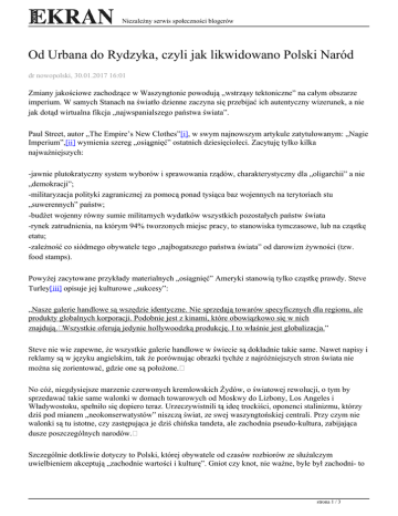 Niezależny serwis społeczności blogerów Od Urbana do Rydzyka, czyli jak likwidowano Polski Naród dr nowopolski, 30.01.2017 16:01 Zmiany jakościowe zachodzące w Waszyngtonie powodują „wstrząsy tektoniczne” na całym obszarze imperium. W samych Stanach na światło dzienne zaczyna się przebijać ich autentyczny wizerunek, a nie jak dotąd wirtualna fikcja „najwspanialszego państwa świata”. Paul Street, autor „The Empire’s New Clothes”[i], w swym najnowszym artykule zatytułowanym: „Nagie Imperium”,[ii] wymienia szereg „osiągnięć” ostatnich dziesięcioleci. Zacytuję tylko kilka najważniejszych: -jawnie plutokratyczny system wyborów i sprawowania rządów, charakterystyczny dla „oligarchii” a nie „demokracji”; -militaryzacja polityki zagranicznej za pomocą ponad tysiąca baz wojennych na terytoriach stu „suwerennych” państw; -budżet wojenny równy sumie militarnych wydatków wszystkich pozostałych państw świata -rynek zatrudnienia, na którym 94% tworzonych miejsc pracy, to stanowiska tymczasowe, lub na cząstkę etatu; -zależność co siódmego obywatele tego „najbogatszego państwa świata” od darowizn żywności (tzw. food stamps). Powyżej zacytowane przykłady materialnych „osiągnięć” Ameryki stanowią tylko cząstkę prawdy. Steve Turley[iii] opisuje jej kulturowe „sukcesy”: „Nasze galerie handlowe są wszędzie identyczne. Nie sprzedają towarów specyficznych dla regionu, ale produkty globalnych korporacji. Podobnie jest z kinami, które obowiązkowo się w nich znajdują. Wszystkie oferują jedynie hollywoodzką produkcję. I to właśnie jest globalizacja.” Steve nie wie zapewne, że wszystkie galerie handlowe w świecie są dokładnie takie same. Nawet napisy i reklamy są w języku angielskim, tak że porównując obrazki tychże z najróżniejszych stron świata nie można się zorientować, gdzie one są położone. No cóż, niegdysiejsze marzenie czerwonych kremlowskich Żydów, o światowej rewolucji, o tym by sprzedawać takie same walonki w domach towarowych od Moskwy do Lizbony, Los Angeles i Władywostoku, spełniło się dopiero teraz. Urzeczywistnili tą ideę trockiści, oponenci stalinizmu, którzy dziś pod mianem „neokonserwatystów” niszczą świat, ze swej waszyngtońskiej centrali. Przy czym nie walonki są tu istotne, czy zastępująca je dziś chińska tandeta, ale zachodnia pseudo-kultura, zabijająca dusze poszczególnych narodów. Szczególnie dotkliwie dotyczy to Polski, której obywatele od czasów rozbiorów ze służalczym uwielbieniem akceptują „zachodnie wartości i kulturę”. Gniot czy knot, nie ważne, byle był zachodni- to strona 1 / 3 Niezależny serwis społeczności blogerów dewiza Polaków. Ze swej strony Zachód w najmniejszym nawet stopniu nie akceptował wspaniałej polskiej kultury. Ona dlań po prostu nie istniała. Na szczęście jej depozytariuszem, był Naród pod zaborami, obywatele II RP i PRLu. O ironio, PRL będący półkolonią sowieckiego imperium, potrafił zawojować kulturowo wszystkie jego narody. Dziś, kiedy Rosja zaczyna się otrząsać również z kulturowej agresji Zachodu, przy okazji przywraca dawny blask polskiej kultury, mocno zakorzenionej w sowieckiej świadomości. Jeśli uda się jej wyjść obronną ręką z konfrontacji globalizmu, to być może, choć w skromnym stopniu, stanie się ona również depozytariuszem polskiej kultury. Współcześni obywatele terytorium pt. „III RP” zostali całkowicie pozbawieni swej rodzimej kultury. Niepodzielnie króluje na nim zachodni kicz, lub polskojęzyczne twory na jego podobieństwo. Fakt ten ma krytyczne znaczenie dla przyszłości tego terytorium i jego mieszkańców. Urodzonych i „wykształconych” (wytresowanych) w III RP obywateli, oprócz bezpośrednich związków w ramach rodzin, nie łączy nic, prócz terytorium Unii Europejskiej, do której przynależą. Stąd też z łatwością przenoszą się tam gdzie jest lepsza praca, lub przykładowo klimat, albo język który im bardziej odpowiada. Zwykle, w takich przypadkach, gdy nie stanie już narodu, pozostaje ludziom tradycja i religia. Jednakowoż rola jaką gra w III RP kościół katolicki jest co najmniej dwuznaczna. Przykłady można mnożyć i pisałem o tym niejednokrotnie, ale przytoczę tu tylko wczorajszą mszę w parafii dużej krajowej metropolii. Ojcowie Kapucyni, którzy ją prowadzą, mają zwyczaj podsumowywania roku ubiegłego, po zakończeniu noworocznej kolędy. Według oficjalnych stwierdzeń z ambony, w ostatnich kilku latach liczebność parafii zmniejszyła się z 22 do 17 tysięcy osób. Według referującego to księdza ponad jedna trzecia odwiedzanych mieszkań stoi pusta, gdyż (cytuję z pamięci): „mieszkańcy albo odeszli, albo wyemigrowali”. Poza tym, na sto chrztów w 2016 roku, odbyło się 200 pogrzebów. Ta szokująca statystyka współgra z ogólną krajową rzeczywistością, bo o propagandzie szerzonej przez okupanta, a zwanej „statystyką”, nie warto nawet wspominać. Jak zwykle w każdą niedzielę, duszpasterz, nie zapomniał o reklamie „prasy katolickiej”. W tym wypadku był to lokalny miesięcznik „W drodze”[iv], który zachęcał artykułem na aktualny temat mieszanych małżeństw katolicko – muzułmańskich. Temat istotny, ale powinien być skwitowany, podobnie jak po stronie muzułmańskiej, krótkim stwierdzeniem z ambony, że takowe „śluby” nie istnieją. Sam fakt wdawania się w dywagacje świadczy jasno, że sponsorom i autorom tego „artykułu” zależy tylko na jednym; a mianowicie poprzez talmudycznie pokrętną argumentację, dać „moralną dyspensę” tym polskim kobietom, które jeszcze mają jakieś hamulce w zdziczałej pogoni za „egzotycznym” multi-kulti.. Ten powyższy przypadek, jak i multum innych, pokazuje wyraźnie że hierarchia kościelna działa na szkodę społeczeństwa. Szkodzenie innym, nie należy do promowanych wart