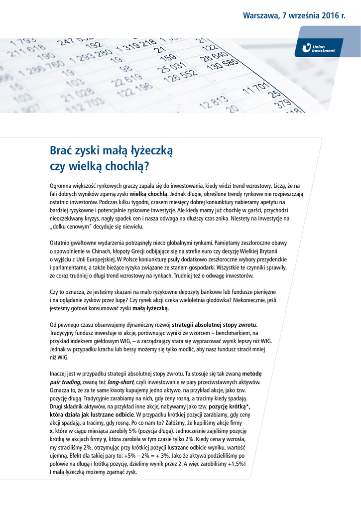 Warszawa, 7 września 2016 r. Brać zyski małą łyżeczką czy wielką chochlą? Ogromna większość rynkowych graczy zapala się do inwestowania, kiedy widzi trend wzrostowy. Liczą, że na fali dobrych wyników zgarną zyski wielką chochlą. Jednak długie, określone trendy rynkowe nie rozpieszczają ostatnio inwestorów. Podczas kilku tygodni, czasem miesięcy dobrej koniunktury nabieramy apetytu na bardziej ryzykowne i potencjalnie zyskowne inwestycje. Ale kiedy mamy już chochlę w garści, przychodzi nieoczekiwany kryzys, nagły spadek cen i nasza odwaga na dłuższy czas znika. Niestety na inwestycje na „dołku cenowym” decyduje się niewielu. Ostatnio gwałtowne wydarzenia potrząsnęły nieco globalnymi rynkami. Pamiętamy zeszłoroczne obawy o spowolnienie w Chinach, kłopoty Grecji odbijające się na strefie euro czy decyzję Wielkiej Brytanii o wyjściu z Unii Europejskiej. W Polsce koniunkturę psuły dodatkowo zeszłoroczne wybory prezydenckie i parlamentarne, a także bieżące ryzyka związane ze stanem gospodarki. Wszystkie te czynniki sprawiły, że coraz trudniej o długi trend wzrostowy na rynkach. Trudniej też o odwagę inwestorów. Czy to oznacza, że jesteśmy skazani na mało ryzykowne depozyty bankowe lub fundusze pieniężne i na oglądanie zysków przez lupę? Czy rynek akcji czeka wieloletnia głodówka? Niekoniecznie, jeśli jesteśmy gotowi konsumować zyski małą łyżeczką. Od pewnego czasu obserwujemy dynamiczny rozwój strategii absolutnej stopy zwrotu. Tradycyjny fundusz inwestuje w akcje, porównując wyniki ze wzorcem – benchmarkiem, na przykład indeksem giełdowym WIG, – a zarządzający stara się wypracować wynik lepszy niż WIG. Jednak w przypadku krachu lub bessy możemy się tylko modlić, aby nasz fundusz stracił mniej niż WIG. Inaczej jest w przypadku strategii absolutnej stopy zwrotu. Tu stosuje się tak zwaną metodę pair trading, zwaną też long-short, czyli inwestowanie w pary przeciwstawnych aktywów. Oznacza to, że za te same kwoty kupujemy jedno aktywo, na przykład akcje, jako tzw. pozycję długą. Tradycyjnie zarabiamy na nich, gdy ceny rosną, a tracimy kiedy spadają. Drugi składnik aktywów, na przykład inne akcje, nabywamy jako tzw. pozycję krótką*, która działa jak lustrzane odbicie. W przypadku krótkiej pozycji zarabiamy, gdy ceny akcji spadają, a tracimy, gdy rosną. Po co nam to? Załóżmy, że kupiliśmy akcje firmy x, które w ciągu miesiąca zarobiły 5% (pozycja długa). Jednocześnie zajęliśmy pozycję krótką w akcjach firmy y, która zarobiła w tym czasie tylko 2%. Kiedy cena y wzrosła, my straciliśmy 2%, otrzymując przy krótkiej pozycji lustrzane odbicie wyniku, wartość ujemną. Efekt dla takiej pary to: +5% – 2% = + 3%. Jako że aktywa podzieliliśmy po połowie na długą i krótką pozycję, dzielimy wynik przez 2. A więc zarobiliśmy +1,5%! I małą łyżeczką możemy zgarnąć zysk. Warszawa, 7 września 2016 r. Jeśli cały rynek mocno straci, tradycyjny fundusz na pewno znajdzie się w dołku. A co stanie się z naszą parą? Jeśli spółka x straciła 3%, a spółka y straciła 5%, my tracimy na pozycji długiej (-3%), a zarabiamy na krótkiej (+5%). Bo jako wynik dostajemy znowu lustrzane odbicie. Czyli -3% + 5% = + 2% dzielimy na 2 i otrzymujemy 1% zysku. Bingo! Mamy perpetuum mobile, które zawsze zarabia, niezależnie od koniunktury! I znowu mała łyżeczka w ruch. Jest tylko jedno „ale”. Jeśli w pierwszym przypadku to spółka y zarobi 5%, a spółka x tylko 2%, to my „zarobimy” -3%/2, czyli -1,5%. W drugim przypadku, gdy x traci 5%, a y tylko 3%, otrzymujemy ostateczny wynik równy -2%/2, czyli -1%. Kluczem do sukcesu jest właściwa selekcja aktywów, czyli wybór spółek, które będą sobie radziły lepiej od innych. Potrzeba szerokiej wiedzy i doświadczenia, aby dokonać właściwego wyboru. Jeśli jednak takich par akcji mamy 15 lub 20, to rozpraszamy ryzyko błędu. Wystarczy zatem, aby większość decyzji podjęta była prawidłowo, aby cały fundusz dał dodatni wynik. Jak to wygląda w praktyce? 23,5% 17,3% 11,2% 5,07% -1% 08.08.2016 MIL 16.08.2016 22.08.2016 29.08.2016 PKO Źródło: www.stooq.com Wyobraźmy sobie, że miesiąc temu kupiliśmy akcje Banku Millennium (niebieska linia). Zanotowały one rewelacyjny wzrost aż o ok. 22%. Dokonaliśmy też krótkiej sprzedaży akcji PKO BP (czerwona linia), gdzie zysk był też bardzo dobry, bo ok. 11%, ale słabszy od Millennium. Mamy więc: 22% – 11% = + 11%/2 = 5,5%. Oczywiście w tradycyjnym funduszu zarobilibyśmy więcej, ale wolimy przecież małą łyżeczkę! Warszawa, 7 września 2016 r. Bo możemy trafić i tak (sektor energetyczny): 3,92% -2,5% -9% -15% -21% 08.08.2016 16.08.2016 22.08.2016 ENG 29.08.2016 TPE Źródło: www.stooq.com Strata na wybranych przez nas akcjach Tauronu (czerwony wykres) wynosi ok. 8%. Jest mniejsza niż na sprzedanej na krótko Enerdze (niebieski wykres), gdzie wynosi ok. 19%. Czyli -8% + 19% = 11%. Dzielimy to przez 2 i otrzymujemy +5,5%. Co dostajemy zatem z inwestycji w dobrze zarządzany fundusz absolutnej stopy zwrotu, który jest oparty na metodzie pair trading (long-short)? Relatywnie niewysokie, ale stabilne i powtarzalne zyski. Małą łyżeczką, ale regularnie zaspokoimy swój apetyt. Wykres takiego funduszu może wyglądać na przykład tak: 14% 12% 10% 8% 6% 4% 2% 0% sie’15 wrz’15 paź’15 lis’15 gru’15 sty’16 lut’16 mar’16 kwi’16 may’16 Wykres jednego z najlepszych w bieżącym roku w Polsce funduszy akcyjnych absolutnej stopy zwrotu. cze’16 lip’16 Warszawa, 7 września 2016 r. Sytuacja na polskiej giełdzie, zwłaszcza w ostatnich miesiącach, ułatwia zadanie zarządzającym takim funduszem. Duże spółki radzą sobie słabo i są to kandydaci na krótkie pozycje. Często wykorzystuje się tutaj po prostu cały indeks dużych spółek WIG 20 (a dokładniej kontrakt na WIG 20). Jednocześnie jako pozycję dł