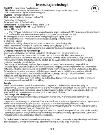 Instrukcja obsługi ON/OFF – załączenie / wyłączanie PL LED – kolor czerwony, ładowanie / kolor niebieski, urządzenie załączone USB – ładowanie / łącze komunikacyjne Wyjście – gniazdo słuchawek ON/OFF – zapnutí / vypnutí Technické parametry: Slot – gniazdo karty pamięci mikro SD LED – červená nabíjení / modrá zapnutí Baterie - Li-Ion 3,7V/160mAh Parametry techniczne: Bateria - Li-Ion /3,7V/160mAh USB – nabíjení vstup Line Nabíjení - USB kabel 5V Ładowanie – napięciem 5V przez kabel USB Výstup - sluchátka FM - 87,5-108MHz zakres fal radiowych Slot - mikro SD karty FM - 87,5-108MHz mikro SD - mp3 mikro SD – mp3 Play / Pauza / Automatyczne wyszukiwanie stacji radiowych FM / przełączanie pomiędzy �� Play / Pauza Automatické naladění stanic FM rádia / přepnutí FM-MP3 (podržet tl. 3s.) radiem FM a/odtwarzaczem mp3 (przytrzymać przycisk przez 3s.) � Další skladba / Posun vpřed na další FM stanici Następny utwór / Wyszukiwanie następnej stacji w górę pasma � Předchozí Posun vzad nanastępnej předchozístacji FM stanici Poprzedniskladba utwór / /Wyszukiwanie w dół pasma + głośniej, - ciszej - zeslabení hlasitosti zesílení hlasitosti, Urządzenie należy chronić przed uderzeniami oraz przed wilgocią. Přístroj chraňte před nárazem a vodou. Jeżeli urządzenie nie będzie używane należy go wyłączyć (OFF). Připrzypadku, nepoužívání vypněte přístroj do polohy OFF. W gdy nie można uruchomić urządzenia, należy naładować baterię. Pokud nelze přístroj spustit, nabijte jej. Ochrona środowiska naturalnego Informacje dotyczące utylizacji urządzeń elektrycznych i elektronicznych Po upłynięciu czasu żywotności produktu lub w momencie, kiedy naprawa jest Ochrana životního prostředí nieekonomiczna, nie wolno wyrzucać produktu do odpadów domowych. Aby dokonać Informaceutylizacji k likvidaciproduktu, elektrických a elektronickýchzařízení właściwej należy oddać go do wyznaczonego miejsca zbiórki, gdzie Po uplynutí doby nieodpłatnie. životnosti produktu nebo v okamžiku, kdy by oprava byla neekonomická, zostanie przyjęty Dokonując prawidłowej utylizacji pomagasz zasoby przyrodnicze produkt nevhazujte do domovního odpadu. zachować Za účelemcenne správné likvidace výrobku jej odeivzdejte wspomagasz prewencję przeciw potencjalnemu negatywnemu wpływowi na środowisko na určených sběrných místech, kde budou přijata zdarma. naturalne i ludzkie zdrowie, na co mogłaby mieć wpływ nieprawidłowa utylizacja odpadów. Správnou likvidací pomůžete zachovat cenné přírodní zdroje a napomáháte prevenci potenDalszych szczegółów wymagaj od lokalnego urzędu lub w najbliższym miejscu zbiórki ciálních negativních dopadů na životní prostředí lidskérodzaju zdraví,odpadów což by mohly být důsledky odpadów. W przypadku nieprawidłowej likwidacjia tego może zostać nesprávnékara likvidace odpadů. Další podrobnosti nałożona zgodnie z przepisami krajowymi. si vyžádejte od místního úřadu nebo nejbližNie wyrzucać bateriilikvidaci do odpadów należy je oddać miejsces šíhowolno sběrného místa.zużytych Při nesprávné tohotodomowych, druhu odpadu mohou být vwsouladu zapewniające odpowiedni ich recykling. národními předpisy uděleny pokuty. Serwis Baterie nevhazujte do běžného odpadu, ale odevzdejte na místa zajišťující recyklaci baterií. Jeżeli Servispo zakupieniu produktu stwierdzisz, że jest on uszkodzony, skontaktuj się ze sprzedawcą. Używając produktu stosuj się do wskazówek zawartych w załączonej instrukcji V případě, že po zakoupení výrobku zjistíte jakoukoli závadu,zmiany kontaktujte servisnílub oddělení. Při obsługi. Reklamacja nie będzie uznana, jeżeli wprowadziłeś w produkcie nie použití výrobku řiďte pokyny uvedenými v přiloženém návodu k použití. Na reklamaci nestosowałeś się dosewskazówek zawartych w instrukcji obsługi. bude brán zřetel, pokud jste výrobek pozměnili či jste se neřídili pokyny uvedenými v návodu Gwarancja nie obejmuje: -k naturalnego zużycia elementów pracujących produktu w trakcie jego normalnego použití. użytkowania, Záruka se nevztahuje - czynności serwisowych związanych ze standardową konserwacją produktu (np. czyszczenie, - na přirozené opotřebení funkčníchsię částí výrobku v důsledkuużytkowania jeho používání wymiana elementów zużywających podczas normalnego itd.), na servisní zásahy související se standardní údržbou výrobku (např. čištění, atmosferyczne, výměna dílů pod-- usterek spowodowanych wpływem warunków zewnętrznych (np. warunki léhajícíchnieodpowiednie běžnému opotřebení …) zapylenie, użytkowanie itp.), - uszkodzeń mechanicznych powstałych w związku z upadkiem produktu, uderzenia nim itp., na závady způsobené vnějšími vlivy (např. klimatickými podmínkami, prašností, nevhodným - szkód powstałych w wyniku nieodpowiedniego obchodzenia się z produktem, używania použitím apod.) nieodpowiednich akcesoriów bądź narzędzi itp. - na mechanická poškození v důsledku pádu výrobku, nárazu, úderu do něj apod. - nauszkodzenia škody vzniklé neodborným zacházením, přetížením, použitím nesprávných dílů, nevhodZa mechaniczne reklamowanego produktu powstałe w wyniku nieprawidłowo ného příslušenství či nevhodných przedmiotu nástrojů apod. zabezpieczenia transportowanego odpowiada jego właściciel. U reklamovaných výrobků, které nebyly řádně zabezpečeny proti mechanickému poškození při přepravě nese riziko případné škody výhradně majitel. - PL 1 - Návod na použití CZ -1- CZ Aktuální verzi návodu v elektronické podobě najdete na www.tvproducts.cz