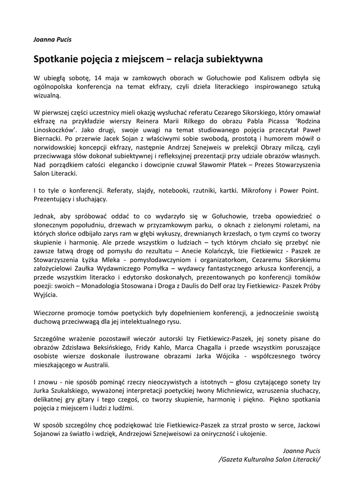 Joanna Pucis Spotkanie pojęcia z miejscem − relacja subiektywna W ubiegłą sobotę, 14 maja w zamkowych oborach w Gołuchowie pod Kaliszem odbyła się ogólnopolska konferencja na temat ekfrazy, czyli dzieła literackiego inspirowanego sztuką wizualną. W pierwszej części uczestnicy mieli okazję wysłuchać referatu Cezarego Sikorskiego, który omawiał ekfrazę na przykładzie wierszy Reinera Marii Rilkego do obrazu Pabla Picassa ‘Rodzina Linoskoczków’. Jako drugi, swoje uwagi na temat studiowanego pojęcia przeczytał Paweł Biernacki. Po przerwie Jacek Sojan z właściwymi sobie swobodą, prostotą i humorem mówił o norwidowskiej koncepcji ekfrazy, następnie Andrzej Sznejweis w prelekcji Obrazy milczą, czyli przeciwwaga słów dokonał subiektywnej i refleksyjnej prezentacji przy udziale obrazów własnych. Nad porządkiem całości elegancko i dowcipnie czuwał Sławomir Płatek – Prezes Stowarzyszenia Salon Literacki. I to tyle o konferencji. Referaty, slajdy, notebooki, rzutniki, kartki. Mikrofony i Power Point. Prezentujący i słuchający. Jednak, aby spróbować oddać to co wydarzyło się w Gołuchowie, trzeba opowiedzieć o słonecznym popołudniu, drzewach w przyzamkowym parku, o oknach z zielonymi roletami, na których słońce odbijało zarys ram w głębi wykuszy, drewnianych krzesłach, o tym czymś co tworzy skupienie i harmonię. Ale przede wszystkim o ludziach – tych którym chciało się przebyć nie zawsze łatwą drogę od pomysłu do rezultatu – Anecie Kolańczyk, Izie Fietkiewicz - Paszek ze Stowarzyszenia Łyżka Mleka - pomysłodawczyniom i organizatorkom, Cezaremu Sikorskiemu założycielowi Zaułka Wydawniczego Pomyłka – wydawcy fantastycznego arkusza konferencji, a przede wszystkim literacko i edytorsko doskonałych, prezentowanych po konferencji tomików poezji: swoich – Monadologia Stosowana i Droga z Daulis do Delf oraz Izy Fietkiewicz- Paszek Próby Wyjścia. Wieczorne promocje tomów poetyckich były dopełnieniem konferencji, a jednocześnie swoistą duchową przeciwwagą dla jej intelektualnego rysu. Szczególne wrażenie pozostawił wieczór autorski Izy Fietkiewicz-Paszek, jej sonety pisane do obrazów Zdzisława Beksińskiego, Fridy Kahlo, Marca Chagalla i przede wszystkim poruszające osobiste wiersze doskonale ilustrowane obrazami Jarka Wójcika - współczesnego twórcy mieszkającego w Australii. I znowu - nie sposób pominąć rzeczy nieoczywistych a istotnych – głosu czytającego sonety Izy Jurka Szukalskiego, wyważonej interpretacji poetyckiej Iwony Michniewicz, wzruszenia słuchaczy, delikatnej gry gitary i tego czegoś, co tworzy skupienie, harmonię i piękno. Piękno spotkania pojęcia z miejscem i ludzi z ludźmi. W sposób szczególny chcę podziękować Izie Fietkiewicz-Paszek za strzał prosto w serce, Jackowi Sojanowi za światło i wdzięk, Andrzejowi Sznejweisowi za oniryczność i ukojenie. Joanna Pucis /Gazeta Kulturalna Salon Literacki/