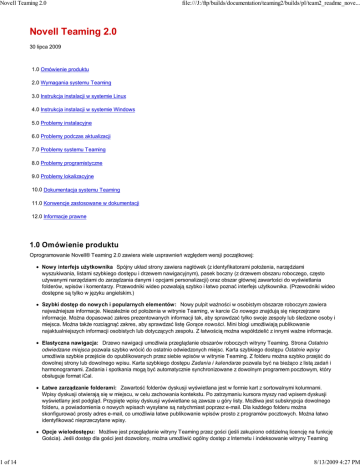 Novell Teaming 2.0 1 of 14 file:///J:/ftp/builds/documentation/teaming2/builds/pl/team2_readme_nove... Novell Teaming 2.0 30 lipca 2009 1.0 Omówienie produktu 2.0 Wymagania systemu Teaming 3.0 Instrukcja instalacji w systemie Linux 4.0 Instrukcja instalacji w systemie Windows 5.0 Problemy instalacyjne 6.0 Problemy podczas aktualizacji 7.0 Problemy systemu Teaming 8.0 Problemy programistyczne 9.0 Problemy lokalizacyjne 10.0 Dokumentacja systemu Teaming 11.0 Konwencje zastosowane w dokumentacji 12.0 Informacje prawne 1.0 Omówienie produktu Oprogramowanie Novell® Teaming 2.0 zawiera wiele usprawnień względem wersji początkowej: Nowy interfejs użytkownika Spójny układ strony zawiera nagłówek (z identyfikatorami położenia, narzędziami wyszukiwania, listami szybkiego dostępu i drzewem nawigacyjnym), pasek boczny (z drzewem obszaru roboczego, często używanymi narzędziami do zarządzania danymi i opcjami personalizacji) oraz obszar głównej zawartości do wyświetlania folderów, wpisów i komentarzy. Przewodniki wideo pozwalają szybko i łatwo poznać interfejs użytkownika. (Przewodniki wideo dostępne są tylko w języku angielskim.) Szybki dostęp do nowych i popularnych elementów: Nowy pulpit ważności w osobistym obszarze roboczym zawiera najważniejsze informacje. Niezależnie od położenia w witrynie Teaming, w karcie Co nowego znajdują się nieprzejrzane informacje. Można dopasować zakres prezentowanych informacji tak, aby sprawdzać tylko swoje zespoły lub śledzone osoby i miejsca. Można także rozciągnąć zakres, aby sprawdzać listę Gorące nowości. Mini blogi umożliwiają publikowanie najaktualniejszych informacji osobistych lub dotyczących zespołu. Z łatwością można współdzielić z innymi ważne informacje. Elastyczna nawigacja: Drzewo nawigacji umożliwia przeglądanie obszarów roboczych witryny Teaming. Strona Ostatnio odwiedzane miejsca pozwala szybko wrócić do ostatnio odwiedzonych miejsc. Karta szybkiego dostępu Ostatnie wpisy umożliwia szybkie przejście do opublikowanych przez siebie wpisów w witrynie Teaming. Z folderu można szybko przejść do dowolnej strony lub dowolnego wpisu. Karta szybkiego dostępu Zadania i kalendarze pozwala być na bieżąco z listą zadań i harmonogramami. Zadania i spotkania mogą być automatycznie synchronizowane z dowolnym programem pocztowym, który obsługuje format iCal. Łatwe zarządzanie folderami: Zawartość folderów dyskusji wyświetlana jest w formie kart z sortowalnymi kolumnami. Wpisy dyskusji otwierają się w miejscu, w celu zachowania kontekstu. Po zatrzymaniu kursora myszy nad wpisem dyskusji wyświetlany jest podgląd. Przypięte wpisy dyskusji wyświetlane są zawsze u góry listy. Możliwa jest subskrypcja dowolnego folderu, a powiadomienia o nowych wpisach wysyłane są natychmiast poprzez e-mail. Dla każdego folderu można skonfigurować prosty adres e-mail, co umożliwia łatwe publikowanie wpisów prosto z programów pocztowych. Można łatwo identyfikować nieprzeczytane wpisy. Opcje wielodostępu: Możliwe jest przeglądanie witryny Teaming przez gości (jeśli zakupiono oddzielną licencję na funkcję Gościa). Jeśli dostęp dla gości jest dozwolony, można umożliwić ogólny dostęp z Internetu i indeksowanie witryny Teaming 8/13/2009 4:27 PM Novell Teaming 2.0 2 of 14 file:///J:/ftp/builds/documentation/teaming2/builds/pl/team2_readme_nove... przez wyszukiwarki. Można używać programu Skype* do wykonywania połączeń z witryny Teaming. Dostosowywanie: Folderom i obszarom roboczym można nadać motyw firmowy dla łatwego rozpoznawania i identyfikacji. Strony docelowe pozwalają na konsolidację najważniejszych części obszaru roboczego w celu umożliwienia natychmiastowego podglądu po otwarciu strony. W ramach witryny Novell Teaming Library oferowane są najczęściej używane własne formularze i przepływy pracy. Przepływy pracy można łączyć i zapisywana jest historia aktywności przepływu pracy. Inne możliwości konfiguracji: Portal Liferay* nie jest już wymagany do działania systemu Teaming. W ramach projektu o otwartym kodzie źródłowym Kablink.org dostępny jest portlet dla systemu Liferay, który może być zastosowany dla witryn korzystających z systemu Liferay. Wielokrotne zapytania LDAP pozwalają znajdować użytkowników i grupy w więcej niż * * jednym położeniu w usłudze katalogowej (Novell eDirectory™ lub Microsoft Active Directory ). Opcjonalny, wbudowany serwer e-mail sprawia, że publikowanie w witrynie Teaming z programów pocztowych jest bardzo łatwe. Wiele serwerów * indeksujących Lucene udostępnia funkcje wyszukiwania o wysokiej dostępności. Wielokrotne strefy pozwalają na konfigurację wielu wirtualnych witryn Teaming, które posiadają unikatowe adresy URL i są jednocześnie częścią jednej witryny Teaming. 2.0 Wymagania systemu Teaming Wymagania systemowe dostępne są w Przewodniku instalacji systemu Teaming 2.0 w Witrynie dokumentacji systemu Novell Teaming 2.0. 3.0 Instrukcja instalacji w systemie Linux 1. Należy upewnić się, że docelowy serwer linuksowy*, gdzie zainstalowany ma być system Novell Teaming, spełnia wymagania systemowe. 2. Jeśli na serwerze tym uruchomiony jest serwer HTTP, należy go zatrzymać, a najlepiej wyłączyć. 3. Następnie trzeba utworzyć lub wybrać użytkownika (nie może to być użytkownik root) i grupę w systemie Linux, do których będą należały katalogi i pliki, i którzy będą mogli uruchamiać oprogramowanie Teaming. 4. W oknie terminala należy zalogować się jako użytkownik root poprzez wydanie polecenia su - oraz podanie hasła użytkownika root. 5. Aby uruchomić program instalacyjny systemu Teaming, należy wydać następujące polecenie: ./installer-teaming.linux Pełna instrukcja instalacji dostępna jest w Przewodniku instalacji systemu Teaming 2.0 w Witrynie dokumentacji systemu Novell Teaming 2.0. 4.0 Instrukcja instalacji w systemie Windows