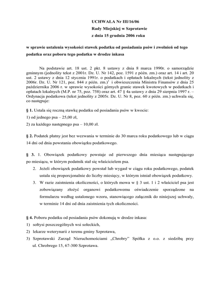 UCHWAŁA Nr III/16/06 Rady Miejskiej w Szprotawie z dnia 15 grudnia 2006 roku w sprawie ustalenia wysokości stawek podatku od posiadania psów i zwolnień od tego podatku oraz poboru tego podatku w drodze inkasa Na podstawie art. 18 ust. 2 pkt. 8 ustawy z dnia 8 marca 1990r. o samorządzie gminnym (jednolity tekst z 2001r. Dz. U. Nr 142, poz. 1591 z późn. zm.) oraz art. 14 i art. 20 ust. 2 ustawy z dnia 12 stycznia 1991r. o podatkach i opłatach lokalnych (tekst jednolity z 2006r. Dz. U. Nr 121, poz. 844 z późn. zm.)1 i obwieszczenia Ministra Finansów z dnia 25 października 2006 r. w sprawie wysokości górnych granic stawek kwotowych w podatkach i opłatach lokalnych (M.P. nr 75, poz. 758) oraz art. 47 § 4a ustawy z dnia 29 sierpnia 1997 r. – Ordynacja podatkowa (tekst jednolity z 2005r. Dz. U. Nr 8, poz. 60 z późn. zm.) uchwala się, co następuje: § 1. Ustala się roczną stawkę podatku od posiadania psów w kwocie: 1) od jednego psa – 25,00 zł, 2) za każdego następnego psa – 10,00 zł. § 2. Podatek płatny jest bez wezwania w terminie do 30 marca roku podatkowego lub w ciągu 14 dni od dnia powstania obowiązku podatkowego. § 3. 1. Obowiązek podatkowy powstaje od pierwszego dnia miesiąca następującego po miesiącu, w którym podatnik stał się właścicielem psa. 2. Jeżeli obowiązek podatkowy powstał lub wygasł w ciągu roku podatkowego, podatek ustala się proporcjonalnie do liczby miesięcy, w którym istniał obowiązek podatkowy. 3. W razie zaistnienia okoliczności, o których mowa w § 3 ust. 1 i 2 właściciel psa jest zobowiązany złożyć organowi podatkowemu oświadczenie sporządzone na formularzu według ustalonego wzoru, stanowiącego załącznik do niniejszej uchwały, w terminie 14 dni od dnia zaistnienia tych okoliczności. § 4. Poboru podatku od posiadania psów dokonują w drodze inkasa: 1) sołtysi poszczególnych wsi sołeckich, 2) lekarze weterynarii z terenu gminy Szprotawa, 3) Szprotawski Zarząd Nieruchomościami „Chrobry” Spółka z o.o. z siedzibą przy ul. Chrobrego 15, 67-300 Szprotawa. 2 § 5. Podatek od posiadania psów może być również płatny bezpośrednio w kasie Urzędu lub na rachunek Urzędu Miejskiego w Szprotawie Nr 30 1090 2545 0000 0006 3800 0056 § 6. Inkasenci, o których mowa w § 4 zobowiązani są do przekazywania zainkasowanych kwot na rachunek Urzędu Miejskiego w Szprotawie w ciągu 10 dni od daty pobrania podatku wraz z wykazem osób, które uiściły podatek oraz oświadczeniami przedłożonymi przez podatników na formularzach, o których mowa w § 3 ust. 3 niniejszej uchwały. § 7. Wynagrodzenie inkasentów, o którym mowa w § 4 ustala się w wysokości 15% od zainkasowanych i odprowadzonych do Urzędu Miejskiego kwot. § 8. Niezależnie od określonych zwolnień ustawowych zwalnia się z podatku od posiadania psa szczenięta w wieku do 4 miesięcy. § 9. Wykonanie uchwały powierza się Burmistrzowi Szprotawy. § 10. Traci moc uchwała Nr XLVII/278/05 Rady Miejskiej w Szprotawie z dnia 8 grudnia 2005 roku w sprawie ustalenia wysokości stawek podatku od posiadania psów i zwolnień od tego podatku oraz poboru tego podatku w drodze inkasa § 11. Uchwała wchodzi w życie po upływie 14 dni od ogłoszenia w dzienniku Urzędowym Województwa Lubuskiego z mocą obowiązującą od 1 stycznia 2007 r. 1 Niniejsza ustawa dokonuje w zakresie swojej regulacji wdrożenia następujących dyrektyw Wspólnot Europejskich: 1)dyrektywy 92/106/EWG z dnia 7 grudnia 1992r. w sprawie ustanowienia wspólnych zasad dla niektórych typów transportu kombinowanego towarów między państwami członkowskimi (Dz. Urz. WE L 368 z 17.12.1992), 2) dyrektywy 1999/62/WE z dnia 17 czerwca 1999r. w sprawie pobierania opłat za użytkowanie niektórych typów infrastruktury przez pojazdy ciężarowe (Dz. Urz. WE L 187 z 20.07.1999). Dane dotyczące ogłoszenia aktów Unii Europejskiej, zamieszczone w niniejszej ustawie – z dniem uzyskania przez Rzeczpospolitą Polską członkostwa w Unii Europejskiej – dotyczą ogłoszenia tych aktów w dzienniku Urzędowym Unii Europejskiej – wydanie specjalne. 3 Załącznik do uchwały Nr III/16/06 Rady Miejskiej Szprotawy z dnia 15 grudnia 2006 r. Miejscowość, data...................................... ................................................... Imię i nazwisko .............................................................. adres .............................................................. .............................................................. Pesel .............................................................. NIP Burmistrz Szprotawy ul. Rynek 45 67-300 Szprotawa OŚWIADCZENIE Oświadczam, że: 1. Posiadam psa/psy w ilości.................od dnia...................................................... 2. Posiadam szczeniaki w wieku do 4 miesięcy - TAK/NIE* od dnia..................... 3. Prowadzę samodzielne gospodarstwo domowe – TAK/NIE* 4. Jestem osobą niepełnosprawną (niewidomą, głuchoniemą, niedołężną) i pies jest dla mnie pomocą. – TAK/NIE* 5. Posiadam gospodarstwo rolne - ..............ha i pies/psy potrzebne są mi do pilnowania gospodarstwa rolnego – TAK/NIE* Świadom odpowiedzialności karnej (art. 233 § k.k.) oświadczam, że podane przeze mnie dane są zgodne z prawdą. * niepotrzebne skreślić .......................................... czytelny podpis 4 UZASADNIENIE Podatek od posiadania psa regulują przepisy ustawy z dnia 12 stycznia 1991 r. o podatkach i opłatach lokalnych (tekst jednolity z 2006 r. Dz. U. Nr 121, poz. 844 z późn. zm.) Górna granica stawki tego podatku określana jest przez Ministra Finansów i ulega corocznie podwyższeniu na następny rok podatkowy w stopniu odpowiadającym wskaźnikowi cen detalicznych towarów i usług konsumpcyjnych w okresie pierwszych trzech kwartałów roku, w którym stawki ulegają podwyższeniu w stosunku do analogicznego okresu roku poprzedniego. Wskaźnik wzrostu cen towaró