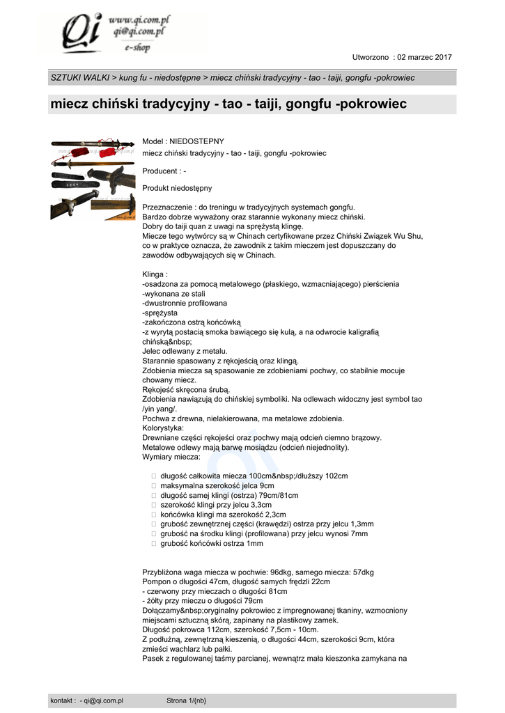 Utworzono : 02 marzec 2017 SZTUKI WALKI > kung fu - niedostępne > miecz chiński tradycyjny - tao - taiji, gongfu -pokrowiec miecz chiński tradycyjny - tao - taiji, gongfu -pokrowiec Model : NIEDOSTEPNY miecz chiński tradycyjny - tao - taiji, gongfu -pokrowiec Producent : Produkt niedostępny Przeznaczenie : do treningu w tradycyjnych systemach gongfu. Bardzo dobrze wyważony oraz starannie wykonany miecz chiński. Dobry do taiji quan z uwagi na sprężystą klingę. Miecze tego wytwórcy są w Chinach certyfikowane przez Chiński Związek Wu Shu, co w praktyce oznacza, że zawodnik z takim mieczem jest dopuszczany do zawodów odbywających się w Chinach. Klinga : -osadzona za pomocą metalowego (płaskiego, wzmacniającego) pierścienia -wykonana ze stali -dwustronnie profilowana -sprężysta -zakończona ostrą końcówką -z wyrytą postacią smoka bawiącego się kulą, a na odwrocie kaligrafią chińską Jelec odlewany z metalu. Starannie spasowany z rękojeścią oraz klingą. Zdobienia miecza są spasowanie ze zdobieniami pochwy, co stabilnie mocuje chowany miecz. Rękojeść skręcona śrubą. Zdobienia nawiązują do chińskiej symboliki. Na odlewach widoczny jest symbol tao /yin yang/. Pochwa z drewna, nielakierowana, ma metalowe zdobienia. Kolorystyka: Drewniane części rękojeści oraz pochwy mają odcień ciemno brązowy. Metalowe odlewy mają barwę mosiądzu (odcień niejednolity). Wymiary miecza: i Q � długość całkowita miecza 100cm /dłuższy 102cm � maksymalna szerokość jelca 9cm � długość samej klingi (ostrza) 79cm/81cm � szerokość klingi przy jelcu 3,3cm � końcówka klingi ma szerokość 2,3cm � grubość zewnętrznej części (krawędzi) ostrza przy jelcu 1,3mm � grubość na środku klingi (profilowana) przy jelcu wynosi 7mm � grubość końcówki ostrza 1mm Przybliżona waga miecza w pochwie: 96dkg, samego miecza: 57dkg Pompon o długości 47cm, długość samych frędzli 22cm - czerwony przy mieczach o długości 81cm - żółty przy mieczu o długości 79cm Dołączamy oryginalny pokrowiec z impregnowanej tkaniny, wzmocniony miejscami sztuczną skórą, zapinany na plastikowy zamek. Długość pokrowca 112cm, szerokość 7,5cm - 10cm. Z podłużną, zewnętrzną kieszenią, o długości 44cm, szerokości 9cm, która zmieści wachlarz lub pałki. Pasek z regulowanej taśmy parcianej, wewnątrz mała kieszonka zamykana na kontakt : - [email protected] Strona 1/{nb} Utworzono : 02 marzec 2017 SZTUKI WALKI > kung fu - niedostępne > miecz chiński tradycyjny - tao - taiji, gongfu -pokrowiec miecz chiński tradycyjny - tao - taiji, gongfu -pokrowiec taśmę-rzep. Na futerale nadruk o treści 'chińskie sztuki wojenne'. Cena : 0,00 zł Brutto ( 0,00 zł Netto) Dostępność: Produkt dostępny w naszym sklepie od 29 listopad 2009 i Q kontakt : - [email protected] Strona 2/{nb}