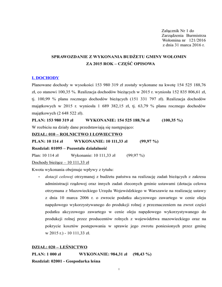 Załącznik Nr 1 do Zarządzenia Burmistrza Wołomina nr 121/2016 z dnia 31 marca 2016 r. SPRAWOZDANIE Z WYKONANIA BUDŻETU GMINY WOŁOMIN ZA 2015 ROK – CZĘŚĆ OPISOWA I. DOCHODY Planowane dochody w wysokości 153 980 319 zł zostały wykonane na kwotę 154 525 188,76 zł, co stanowi 100,35 %. Realizacja dochodów bieżących w 2015 r. wyniosła 152 835 806,61 zł, tj. 100,99 % planu rocznego dochodów bieżących (151 331 797 zł). Realizacja dochodów majątkowych w 2015 r. wyniosła 1 689 382,15 zł, tj. 63,79 % planu rocznego dochodów majątkowych (2 648 522 zł). PLAN: 153 980 319 zł WYKONANIE: 154 525 188,76 zł (100,35 %) W rozbiciu na działy dane przedstawiają się następująco: DZIAŁ: 010 – ROLNICTWO I ŁOWIECTWO PLAN: 10 114 zł WYKONANIE: 10 111,33 zł (99,97 %) Rozdział: 01095 – Pozostała działalność Plan: 10 114 zł Wykonanie: 10 111,33 zł (99,97 %) Dochody bieżące – 10 111,33 zł Kwota wykonania obejmuje wpływy z tytułu: • dotacji celowej otrzymanej z budżetu państwa na realizację zadań bieżących z zakresu administracji rządowej oraz innych zadań zleconych gminie ustawami (dotacja celowa otrzymana z Mazowieckiego Urzędu Wojewódzkiego w Warszawie na realizację ustawy z dnia 10 marca 2006 r. o zwrocie podatku akcyzowego zawartego w cenie oleju napędowego wykorzystywanego do produkcji rolnej z przeznaczeniem na zwrot części podatku akcyzowego zawartego w cenie oleju napędowego wykorzystywanego do produkcji rolnej przez producentów rolnych z województwa mazowieckiego oraz na pokrycie kosztów postępowania w sprawie jego zwrotu poniesionych przez gminę w 2015 r.) - 10 111,33 zł. DZIAŁ: 020 – LEŚNICTWO PLAN: 1 000 zł WYKONANIE: 984,31 zł Rozdział: 02001 - Gospodarka leśna 1 (98,43 %) Plan: 1 000 zł Wykonanie: 984,31 zł (98,43 %) Dochody bieżące – 984,31 zł Wykonanie obejmuje wpływy z dochodów własnych gminy - z gospodarowania majątkiem gminy, w tym: • dochody z najmu i dzierżawy składników majątkowych jst (opłaty z tytułu dzierżawy terenów łowieckich) – 984,31 zł. DZIAŁ: 400 – WYTWARZANIE I ZAOPATRYWANIE W ENERGIĘ ELEKTRYCZNĄ, GAZ I WODĘ PLAN: 250 000 zł WYKONANIE: 250 000,00 zł (100,00 %) Rozdział: 40001 – Dostarczanie ciepła Plan: 250 000 zł Wykonanie: 250 000,00 zł (100,00 %) Dochody bieżące – 250 000,00 zł Kwota wykonania obejmuje wpływy z dochodów własnych gminy: • wpływy dywidendy (dywidenda za 2014 r. z Zakładu Energetyki Cieplnej Sp. z o.o. w Wołominie) – 250 000,00 zł. DZIAŁ: 600 – TRANSPORT I ŁĄCZNOŚĆ PLAN: 238 576 zł WYKONANIE: 295 186,31 zł (123,73 %) Rozdział: 60014 – Drogi publiczne powiatowe Plan: 160 500 zł Wykonanie: 171 376,49 zł (106,78 %) Dochody bieżące – 171 376,49 zł Kwota wykonania obejmuje wpływy z tytułu dochodów własnych gminy – 171 376,49 zł, w tym: • dochody różne (zwrot niewykorzystanych dotacji z 2014 r. przez Starostwo Powiatowe w Wołominie przekazanych przez gminę Wołomin na realizację zadań: - budowa ronda w Zagościńcu gm. Wołomin na skrzyżowaniu ulic: 100-lecia, Podmiejskiej, Armii Krajowej – 160 500,00 zł, - przebudowa ciągu drogi Nr 4314W Turów – Leśniakowizna – Majdan, gm. Wołomin 10 876,49 zł. Rozdział: 60016 – Drogi publiczne gminne Plan: 3 440 zł Wykonanie: 44 095,10 zł (1 281,83 %) Dochody bieżące – 44 095,10 zł Kwota wykonania obejmuje wpływy z tytułu dochodów własnych gminy – 44 095,10 zł, w tym: • wpływy z różnych dochodów – 44 095,10 zł, w tym: 2 - kary umowne potrącone wykonawcom za nieterminowe realizacje umów z tytułu usług świadczonych na rzecz gminy Wołomin – 24 069,50 zł, - odszkodowanie za drogę i partycypacja w kosztach utrzymania miejsc parkingowych – 20 025,60 zł. Należności na dzień 31.12.2015 r. wynoszą 82 685,74 zł, w tym wymagalne – 81 867,79 zł. Rozdział: 60017 – Drogi wewnętrzne Plan: 74 636 zł Wykonanie: 74 635,39 zł (100,00 %) Dochody majątkowe – 74 635,39 zł Kwota wykonania obejmuje wpływy z tytułu: • dotacji celowej otrzymanej z tytułu pomocy finansowej udzielanej między jst na dofinansowanie własnych zadań inwestycyjnych i zakupów inwestycyjnych (środki otrzymane z Urzędu Marszałkowskiego Województwa Mazowieckiego) związanych z wyłączeniem z produkcji gruntów rolnych na realizację zadania pn. „Modernizacja drogi dojazdowej do gruntów rolnych – ul. Radosna we wsi Stare Lipiny” - 74 635,39 zł. Rozdział: 60053 – Infrastruktura telekomunikacyjna Plan: 0,00 zł Wykonanie: 5 079,33 zł (0,00 %) Dochody bieżące – 5 079,33 zł Kwota wykonania obejmuje wpływy z tytułu: dochodów własnych gminy - 5 079,33 zł, w tym: • wpływy z różnych dochodów (refundacja wydatków z lat ubiegłych z tytułu rozliczenia projektu „Internet szansą rozwoju gminy Wołomin) – 159,33 zł, • dotacji celowej w ramach programów finansowanych z udziałem środków europejskich oraz środków, o których mowa w art. 5 ust. 1 pkt 3 oraz ust. 3 pkt 5 i 6 ustawy, lub płatności w ramach budżetu środków europejskich (dofinansowanie projektu „Internet szansą rozwoju Gminy Wołomin” w ramach działania 8.3. „Przeciwdziałanie wykluczeniu cyfrowemu – eIncusion” osi priorytetowej 8. „Społeczeństwo informacyjne – zwiększanie innowacyjności gospodarki” Programu Operacyjnego Innowacyjna Gospodarka 2007 – 2013. Projekt realizowany był w okresie od 1 stycznia 2012 r. do 31 grudnia 2014 r.) – 4 920,00 zł. Należności na dzień 31.12.2015 r. wynoszą 225 822,24 zł, w tym wymagalne – 225 822,24 zł. Należności dotyczą kar umownych za zwłokę tytułem nienależytego wykonania zobowiązań umownych przez wykonawcę robót w zakresie prac określonych w umowie na realizację projektu pn. „Szerokopasmowy internet dla sołectw”. 3 DZIAŁ: 630 – TURYSTYKA PLAN: 500 zł WYKONANIE: 0,00 zł (0,00 %) Rozdział: 63003 – Zadania w zakresie upowszechniania turystyki P