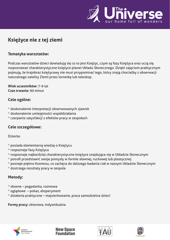 Księżyce nie z tej ziemi Tematyka warsztatów: Podczas warsztatów dzieci dowiadują się co to jest Księżyc, czym są fazy Księżyca oraz uczą się rozpoznawać charakterystyczne księżyce planet Układu Słonecznego. Dzięki zajęciom praktycznym pojmują, że krajobraz księżycowy nie musi przypominać tego, który znają chociażby z obserwacji naturalnego satelity Ziemi przez lornetkę lub teleskop. Wiek uczestników: 7-9 lat Czas trwania: 90 minut Cele ogólne: * doskonalenie interpretacji obserwowanych zjawisk * doskonalenie umiejętności współdziałania * czerpanie satysfakcji z efektów pracy w zespołach Cele szczegółowe: Dziecko * posiada elementarną wiedzę o Księżycu * rozpoznaje fazy Księżyca * rozpoznaje najbardziej charakterystyczne księżyce znajdujące się w Układzie Słonecznym * potrafi przedstawić swoje pomysły w formie słownej, ruchowej lub plastycznej * poznaje piękno Kosmosu, co zachęca do dalszego badania ciał w naszym Układzie Słonecznym * dostrzega rezultaty pracy w zespole Metody: * słowne – pogadanka, rozmowa * oglądowe – pokaz, eksperyment * działania praktyczne – majsterkowanie, praca samodzielna dzieci Formy pracy: zbiorowa, indywidualna Przebieg zajęć: Lp. Czynności wykonywane przez prowadzącego Czynności wykonywane przez dzieci Czas trwania (min.) 1 Przedstawienie się, przywitanie się z dziećmi, wprowadzenie do tematyki zajęć. Witają się, zgadują, odpowiadają czym zajmuje się astronom, astronauta itp. 10 2 Przedstawienie tematyki warsztatów - tworzenie mapy myśli związanej z hasłem „księżyc” (tzw. mapa myśli „przed”; zapisywanie skojarzeń dzieci wokół hasła głównego na brystolu/tablicy). Podają skojarzenia z obrazami widocznymi na slajdach oraz z hasłem „księżyc”. 5 3 Przedstawienie slajdu, na którym widnieje Księżyc. Opisują wygląd Księżyca, swoje dotychczasowe obserwacje. Odpowiadają na pytania. 2 4 Przedstawienie slajdu przedstawiającego fazy Księżyca. Opisują wygląd Księżyca w fazach, odpowiadają na pytania. W jakiej fazie jest teraz Księżyc? 3 5 Zajęcia praktyczne – budowanie w parach modelu do obserwacji faz Księżyca, objaśnianie poszczególnych faz z punktu widzenia obserwatora na Ziemi. Wykorzystanie karty pracy „Fazy Księżyca”. Wykonują model zgodnie z instrukcją prowadzącego, symulują ruch Księżyca wokół Ziemi, obserwują kolejne fazy Księżyca. 20 6 Przedstawienie kolejnych slajdów – kosmiczne księżyce Układu Słonecznego (zwięzłe informacje związane z wyglądem księżyców – z każdym księżycem skojarzony przedmiot, np. ziemniak, gąbka, pudełko po pizzy itp. – opisane poniżej). Przedstawienie charakterystycznych cech i właściwości dotyczących każdego z księżyców. Opisują wygląd księżyców. Odpowiadają na pytania. Można tutaj wykonywać proste doświadczenia związane z przedstawianym księżycem, pokazujące jak powstają kratery (piasek w naczyniu i kamień rzucony do piasku) lub budowę wulkanów (wulkan z masy solnej, czyli mieszaniny soli, mąki i wody, do środka uformowanego wulkanu wsypujemy sodę i zalewamy octem, obserwujemy jak wydobywa się „lawa”). 15 Lp. Czynności wykonywane przez prowadzącego Czynności wykonywane przez dzieci Czas trwania (min.) 7 Podsumowanie informacji na jednym wspólnym slajdzie, pokazanie różnorodności kosmicznych księżyców. Głosowanie na ulubiony księżyc. Grupowo przedstawiają swoje skojarzenia z każdym księżycem (nawiązanie do przedmiotów). Głosują na księżyc, który wzbudził ich największe zainteresowanie. 5 8 Zajęcia praktyczne – rysowanie najciekawszego z poznanych (lub całkowicie wymyślonego) księżyca. Wybierają księżyc(e), które następnie rysują. W razie pytań dzieci prowadzący pomagają w wyborze, prowokują do określania kształtu, koloru itp. 15 9 Przygotowanie wystawy prac i krótki ich opis. Oddają rysunki i wspólnie opisują co na nich widać. Nazywają swoje księżyce. 7 10 Tworzenie mapy myśli na temat hasła „księżyc” (tzw. mapa myśli „po”; zapisywanie skojarzeń dzieci wokół hasła głównego na brystolu/tablicy) i porównanie obu map myśli. Czy one się różnią? Dzieci ponownie podają skojarzenia z hasłem „księżyc”. Jeśli pojawiają się nowe określenia, nazwy omówionych księżyców to cel został osiągnięty. 3 11 Ewaluacja zajęć wśród dzieci i opiekunów. Podsumowanie i zakończenie. Dzieci odpowiadają na pytania podsumowujące (lub wypełniają krótką ankietę) i określają swoje zainteresowanie zajęciami. Jeśli starczy czasu: każde dziecko może powiedzieć jedno skojarzenie, jakie mu pozostało po zajęciach, ale nie mogą one się powtarzać. 5 RAZEM 90 Pojęcia i informacje do zastosowania: * Podczas wędrówki Księżyca wokół Ziemi (pełny obieg trwa ok. miesiąca) promienie Słońca padają na niego pod różnym kątem, jawi się nam więc w nieco inny sposób. Wyróżniamy kilka faz Księżyca, w szczególności: nów, pierwsza kwadra, pełnia, trzecia kwadra. * Nów: faza Księżyca, kiedy znajduje się on pomiędzy Słońcem, a Ziemią. Księżyc jest niewidoczny z Ziemi, ponieważ odwrócony jest do nas ciemną stroną. Tak naprawdę połowa Księżyca jest oświetlona, tylko my jej nie widzimy. * Pierwsza kwadra: faza, gdy oświetlona jest prawa strona Księżyca, przypomina kształtem literkę „D” (zbliża się „Do pełni”). Taki Księżyc jest widoczny wieczorem lub nawet w dzień. * Pełnia: faza, gdy Księżyc znajduje się po przeciwnej stronie Ziemi niż Słońce. Słońce oświetla połowę powierzchni Księżyca, która jawi się nam jako okrągła. Jego ciemna strona nie jest widoczna. * Trzecia kwadra: faza, gdy oświetlona jest lewa strona Księżyca, przypomina kształtem literkę „C” („Ciemnieje”, czyli zbliża się do nowiu). * Linia na Księżycu pomiędzy ciemnym i jasnym obszarem jest nazywana terminato