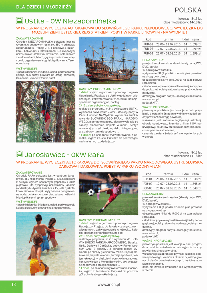 DLA DZIECI I M£ODZIE¯Y POLSKA kolonia: 8-13 lat obóz m³odzie¿owy: 14-18 lat Ustka - OW Niezapominajka W PROGRAMIE: WYCIECZKA AUTOKAROWA DO S£OWIÑSKIEGO PARKU NARODOWEGO, WYCIECZKA DO MUZEUM ZIEMI USTECKIEJ, REJS STATKIEM, POBYT W PARKU LINOWYM - NA WYDMIE ! ZAKWATEROWANIE Oœrodek NIEZAPOMINAJKA po³o¿ony jest na wydmie, w sosnowym lesie, ok. 350 m od morza i centrum Ustki. Pokoje 2, 3, 4-osobowe z ³azienkami, balkonami i telewizorami. Do dyspozycji uczestników: sto³ówka, kawiarnia, sala kinowa z multimediami, bilard, gry zrêcznoœciowe, miejsce do organizowania ognisk i grillowania. Teren ogrodzony. WY¯YWIENIE FB 4 posi³ki dziennie: œniadanie, obiad, podwieczorek, kolacja plus suchy prowiant na drogê powrotn¹. Œniadania i kolacje w formie bufetu. RAMOWY PROGRAM IMPREZY 1 dzieñ: wyjazd w godzinach porannych wg rozk³adu jazdy. Przyjazd do Ustki w godzinach wieczornych, zakwaterowanie w oœrodku, kolacja, spotkanie organizacyjne, nocleg. 2 / 13 dzieñ: pobyt wypoczynkowy, realizacja programu, m.in.: zwiedzanie USTKI, wycieczka do Muzeum Ziemi Usteckiej, pobyt w Parku Linowym Na Wydmie, wycieczka autokarowa do S£OWIÑSKIEGO PARKU NARODOWEGO, a ponadto spacery, piesze wycieczki po okolicy, pla¿owanie, k¹piele w morzu, festyn rekreacyjny, dyskoteki, ognisko integracyjne, gry, zabawy, turnieje sportowe ... 14 dzieñ: po œniadaniu wykwaterowanie z oœrodka, wyjazd z Ustki. Przyjazd do poszczególnych miast wg rozk³adu jazdy. kod termin l.dni cena PUB-01 28.06 - 11.07.2016 14 1.599 z³ PUB-02 12.07 - 25.07.2016 14 1.599 z³ PUB-03 26.07 - 08.08.2016 14 1.599 z³ CENA ZAWIERA: przejazd autokarem klasy lux (klimatyzacja, WC, DVD, barek), 13 noclegów w oœrodku, wy¿ywienie FB (4 posi³ki dziennie plus prowiant na drogê powrotn¹), ubezpieczenie NNW do 5.000 z³ na czas pobytu i przejazdu, ca³odobow¹ opiekê wykwalifikowanej kadry pedagogicznej, opiekê ratownika na pla¿y, opiekê medyczn¹, atrakcyjny program pobytu, szczegó³y na stronie www.arion.pl podatek VAT. WA¯NE INFORMACJE: pierwszym posi³kiem jest kolacja w dniu przyjazdu a ostatnim œniadanie w dniu wyjazdu i suchy prowiant na drogê powrotn¹, wskazane jest zabranie legitymacji szkolnej, obuwia sportowego, kremów z filtrami UV, nakryæ g³owy, okularów przeciws³onecznych, maœci na oparzenia s³oneczne, cena nie zawiera œwiadczeñ nie wymienionych w ofercie. kolonia: 8-13 lat obóz m³odzie¿owy: 14-18 lat Jaros³awiec - OKW Rafa W PROGRAMIE: WYCIECZKI AUTOKAROWE DO: S£OWIÑSKIEGO PARKU NARODOWEGO, USTKI, S£UPSKA, DAR£OWA I DAR£ÓWKA, POBYT W PARKU WODNYM JAN ZAKWATEROWANIE Oœrodek RAFA po³o¿ony jest w centrum Jaros³awca, 150 m od morza. Pokoje 3, 4, 5, 6 osobowe z pe³nym wêz³em sanitarnym (tapczany i ³ó¿ka piêtrowe). Do dyspozycji uczestników jadalnia (oddzielny budynek), œwietlica z TV, sala dyskotekowa, si³ownia, sklepik, kryty basen z podgrzewan¹ wod¹, boiska sportowe, plac zabaw, huœtawki, bilard, pi³karzyki, sprzêt sportowy. kod WY¯YWIENIE FB 4 posi³ki dziennie: œniadanie, obiad, podwieczorek, kolacja plus suchy prowiant na drogê powrotn¹. RAMOWY PROGRAM IMPREZY 1 dzieñ: wyjazd w godzinach porannych wg rozk³adu jazdy. Przyjazd do Jaros³awca w godzinach wieczornych, zakwaterowanie w oœrodku, kolacja, spotkanie organizacyjne, nocleg. 2 / 13 dzieñ: pobyt wypoczynkowy, realizacja programu, m.in.: wycieczki do S£OWIÑSKIEGO PARKU NARODOWEGO, S³upska, Ustki, Dar³owa i Dar³ówka, pobyt w Parku Wodnym JAN (2 godziny), a ponadto piesze wycieczki po okolicy (Jezierzany, Wicie, £¹cko) pla¿owanie, k¹piele w morzu, turnieje sportowe, festyn rekreacyjny, dyskoteki, ognisko integracyjne, konkurs wiedzy o Morzu Ba³tyckim, gry, wieczorne zabawy nad brzegiem morza ... 14 dzieñ: po œniadaniu wykwaterowanie z oœrodka, wyjazd z Jaros³awca. Przyjazd do poszczególnych miast wg rozk³adu jazdy. 18 www.arion.pl termin l.dni cena PJB-01 28.06 - 11.07.2016 14 1.648 z³ PJB-02 12.07 - 25.07.2016 14 1.648 z³ PJB-03 26.07 - 08.08.2016 14 1.648 z³ CENA ZAWIERA: przejazd autokarem klasy lux (klimatyzacja, WC, DVD, barek), 13 noclegów w oœrodku, wy¿ywienie FB (4 posi³ki dziennie plus prowiant na drogê powrotn¹), ubezpieczenie NNW do 5.000 z³ na czas pobytu i przejazdu, ca³odobow¹ opiekê wykwalifikowanej kadry pedagogicznej, opiekê ratownika wodnego, opiekê medyczn¹, atrakcyjny program pobytu, szczegó³y na stronie www.arion.pl, podatek VAT. WA¯NE INFORMACJE: pierwszym posi³kiem jest kolacja w dniu przyjazdu a ostatnim œniadanie w dniu wyjazdu i suchy prowiant na drogê powrotn¹, wskazane jest zabranie legitymacji szkolnej, obuwia sportowego, kremów z filtrami UV, nakryæ g³owy, okularów przeciws³onecznych, maœci na oparzenia s³oneczne, cena nie zawiera œwiadczeñ nie wymienionych w ofercie.