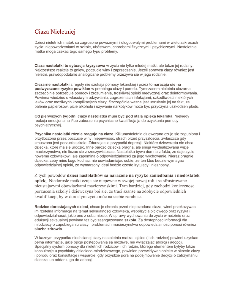 Ciaza Nieletniej Dzieci nieletnich matek sa zagrozone powaznymi i dlugotrwalymi problemami w wielu zakresach zycia: niepowodzeniami w szkole, ubóstwem, chorobami fizycznymi i psychicznymi. Nastoletnia matke moga czekac tego samego typu problemy. Ciaza nastolatki to sytuacja kryzysowa w zyciu nie tylko mlodej matki, ale takze jej rodziny. Najczestsze reakcje to gniew, poczucie winy i zaprzeczanie. Jezeli sprawca ciazy równiez jest nieletni, prawdopodobnie analogiczne problemy przezywa sie w jego rodzinie. Ciezarne nastolatki z reguly nie szukaja pomocy lekarskiej i przez to narazaja sie na podwyzszone ryzyko powiklan w przebiegu ciazy i porodu. Tymczasem nieletnia ciezarna szczególnie potrzebuje pomocy i zrozumienia, troskliwej opieki medycznej oraz doinformowania. Powinna wiedziec o wlasciwym odzywianiu, zagrozeniach infekcjami, szkodliwosci niektórych leków oraz mozliwych komplikacjach ciazy. Szczególnie wazne jest uczulenie jej na fakt, ze palenie papierosów, picie alkoholu i uzywanie narkotyków moze byc przyczyna uszkodzen plodu. Od pierwszych tygodni ciazy nastolatka musi byc pod stala opieka lekarska. Niekiedy reakcja emocjonalna i/lub zaburzenia psychiczne kwalifikuja ja do uzyskania pomocy psychiatrycznej. Psychika nastolatki róznie reaguje na ciaze. Kilkunastoletnia dziewczyna czuje sie zagubiona i przytloczona przez poczucie winy, niepewnosc, strach przed przyszloscia, zwlaszcza gdy zmuszona jest porzucic szkole. Zdarzaja sie przypadki depresji. Niektóre dziewczeta nie chca dziecka, które ma sie urodzic. Inne bardzo dziecka pragna, ale snuja wyidealizowana wizje macierzynstwa, nie liczac sie z rzeczywistoscia. Nastolatka bywa dumna z faktu, ze daje zycie nowemu czlowiekowi, ale zapomina o odpowiedzialnosci za jego wychowanie. Nieraz pragnie dziecka, zeby miec kogo kochac, nie uswiadamiajac sobie, ze ten ktos bedzie wymagac odpowiedzialnej opieki, ze wymarzony ideal bedzie czesto irytujacy i nieznosny. Z tych powodów dzieci nastolatków sa narazone na ryzyko zaniedbania i niedostatek opieki. Niedorosle matki czuja sie niepewne w swojej nowej roli i sa sfrustrowane nieustajacymi obowiazkami macierzynskimi. Tym bardziej, gdy zachodzi koniecznosc porzucenia szkoly i dziewczyna boi sie, ze traci szanse na zdobycie odpowiednich kwalifikacji, by w doroslym zyciu móc na siebie zarabiac. Rodzice dorastajacych dzieci, chcac je chronic przed niepozadana ciaza, winni przekazywac im rzetelna informacje na temat seksualnosci czlowieka, wspólzycia plciowego oraz ryzyka i odpowiedzialnosci, jakie ono z soba niesie. W sprawy wychowania do zycia w rodzinie oraz edukacji seksualnej powinna tez byc zaangazowana szkola. Za dostepnosc informacji dla mlodziezy o zapobieganiu ciazy i problemach macierzynstwa odpowiedzialnosc ponosi równiez sluzba zdrowia. W kazdym przypadku niechcianej ciazy nastoletnia matka i ojciec (i ich rodzice) powinni uzyskac pelna informacje, jakie opcje postepowania sa mozliwe, nie wylaczajac aborcji i adopcji. Specjalny system pomocy dla nieletnich rodziców i ich rodzin, którego elementem bylyby takze konsultacje u psychiatry dziecieco-mlodziezowego, powinien przewidywac opieke w okresie ciazy i porodu oraz konsultacje i wsparcie, gdy przyjdzie pora na podejmowanie decyzji o zatrzymaniu dziecka lub oddaniu go do adopcji.