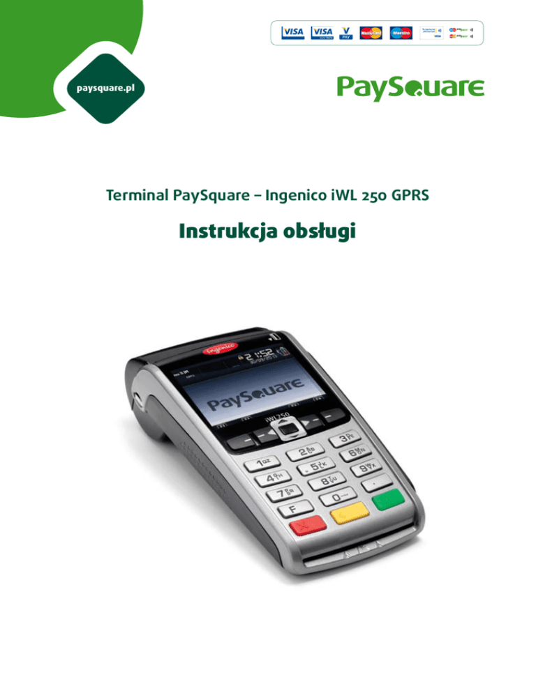 paysquare.pl Terminal PaySquare – Ingenico iWL 250 GPRS Instrukcja obsługi Spis treści 1. Informacje o bezpieczeństwie ....................................................................................... 3 2. Instalacja terminala iWL 250 GPRS ............................................................................... 4 2.1. Instalacja systemu .......................................................................................................... 4 3. Informacje podstawowe ................................................................................................ 6 3.1. Przyciski i ich funkcje ..................................................................................................... 6 3.2. Czytniki terminala ........................................................................................................... 7 3.3. Wymiana rolki papieru ................................................................................................... 7 4. Aplikacje .......................................................................................................................... 8 4.1. Sprzedaż .......................................................................................................................... 8 4.2. Preautoryzacja i dopełnienie preautoryzacji .............................................................. 9 4.3. Sprzedaż z wypłatą gotówki ........................................................................................ 10 4.4. Zwrot ................................................................................................................................ 11 4.5. Unieważnienie ................................................................................................................ 12 4.6. Dopełnienie ..................................................................................................................... 13 4.7. Kopia rachunku ............................................................................................................... 13 5. Menu Administracja ...................................................................................................... 14 5.1. Zamknięcie dnia ............................................................................................................. 14 5.2. Raporty ............................................................................................................................ 15 5.3. Test połączenia ............................................................................................................... 15 5.4. Wizytówka terminala (wydruk informacyjny) ........................................................... 15 5.5. Inicjalizacja ..................................................................................................................... 15 5.6. Menu specjalne ............................................................................................................. 15 6. Komunikaty o błędach .................................................................................................. 16 6.1. Karta nie jest zaakceptowana ...................................................................................... 16 6.2. Karta nie może zostać odczytana ................................................................................ 16 6.3. Problemy z łącznością (sieć) ........................................................................................ 16 6.4. Błąd podczas nawiązywania łączności ....................................................................... 16 6.5. Host – komunikaty o błędach ....................................................................................... 17 1. Informacje o bezpieczeństwie Nigdy nie odłączaj terminala z zasilania w trakcie przeprowadzania transakcji, innych operacji lub jeżeli na wyświetlaczu znajduje się informacja ‘Proszę czekać’. Jeżeli komunikat ten wyświetlany jest przez dłuższy czas, należy zwrócić się do usługodawcy. Zachowaj odpowiednią odległość od innych urządzeń elektrycznych (min. 50 cm), w przeciwnym razie mogą powstać zakłócenia w pracy urządzenia. W warunkach normalnego użytkowania (brak zabrudzeń na kartach, użytkowanie w pomieszczeniu) należy czyścić czytnik kart raz w tygodniu przy pomocy kart czyszczących (czyszczenie na sucho lub na mokro). Przy częstym używaniu w trudnych warunkach (np. zabrudzone karty paliwowe, użytkowanie na zewnątrz) należy czyścić czytnik kart raz dziennie. Przewody łączące nie mogą się znajdować w pobliżu źródeł emitowania wysokich częstotliwości (telefony komórkowe, krótkofalówki, zasilacze impulsowe itp.), w przeciwnym razie mogą wystąpić zakłócenia w przesyłaniu danych. Terminal powinien stać na równym podłożu, z dala od urządzeń wytwarzających wibracje. Należy dopilnować, aby do wnętrza urządzenia i do czytnika kart nie dostawały się płyny lub inne zabrudzenia. W przeciwnym razie mogą wystąpić zakłócenia w funkcjonowaniu lub uszkodzenie terminala. Terminal przeznaczony jest wyłącznie do realizacji płatności bezgotówkowych kartami płatniczymi z paskiem magnetycznym i/lub chipem oraz kartami zbliżeniowymi ważnymi w Polsce. W czytniku terminala należy umieszczać wyłącznie odpowiednie karty. Niewłaściwe, zabrudzone lub uszkodzone karty mogą doprowadzić do uszkodzeń czytnika. Nie można otwierać urządzenia, a wszelkie naprawy mogą być dokonywane wyłącznie przez producenta. W przypadku nieuprawnionego otwarcia terminal zostanie zablokowany. Zamontowana w terminalu bateria litowa może zostać wymieniona tylko przez producenta. Terminal, który nie nadaje się do użytkowania, powinien zostać odesłany do serwisanta. Nie wolno narażać urządzenia na kontakt z wodą, wilgocią, wysoką temperaturą i ogniem. Terminal można czyścić wilgotną ściereczką. Nie należy używać środków czyszczących. Po k