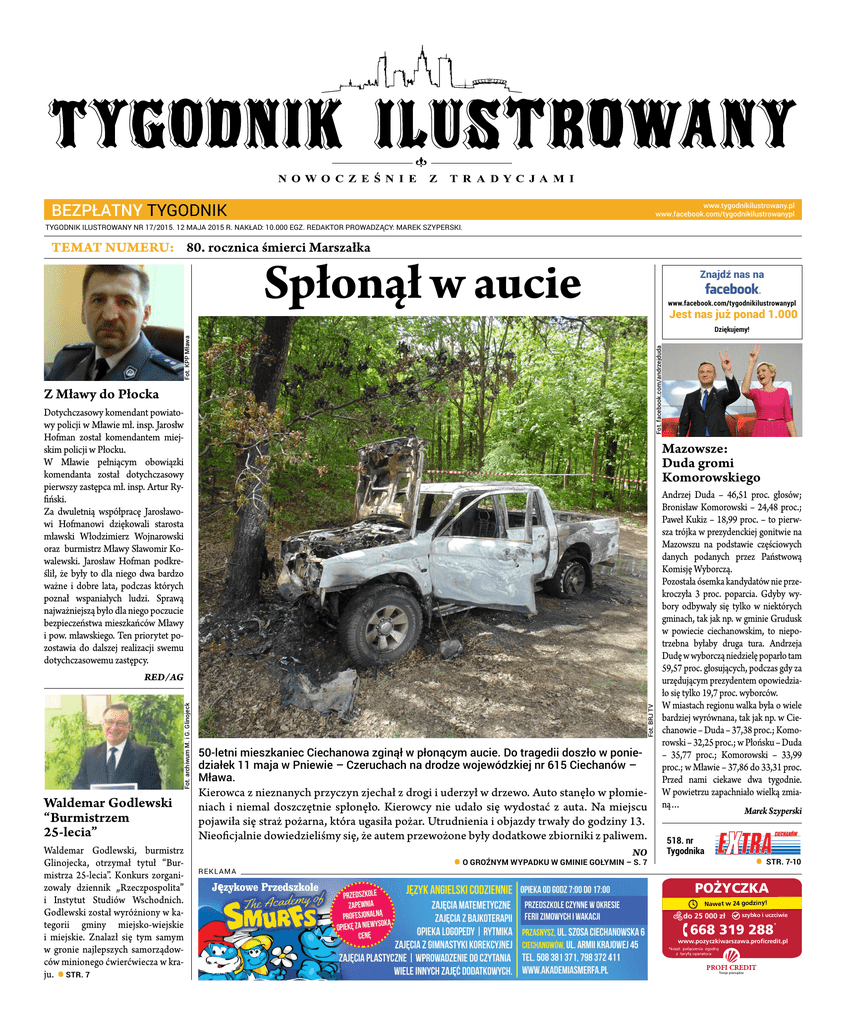 bezpłatny tygodnik www.tygodnikilustrowany.pl www.facebook.com/tygodnikilustrowanypl TYGODNIK ILUSTROWANY NR 17/2015. 12 MAJA 2015 R. NAKŁAD: 10.000 EGZ. REDAKTOR PROWADZĄCY: MAREK SZYPERSKI. TEMAT NUMERU: 80. rocznica śmierci Marszałka Spłonął w aucie Znajdź nas na www.facebook.com/tygodnikilustrowanypl Jest nas już ponad 1.000 Fot. facebook.com/andrzejduda Fot. KPP Mława Dziękujemy! Z Mławy do Płocka Dotychczasowy komendant powiatowy policji w Mławie mł. insp. Jarosłw Hofman został komendantem miejskim policji w Płocku. W Mławie pełniącym obowiązki komendanta został dotychczasowy pierwszy zastępca mł. insp. Artur Ryfiński. Za dwuletnią współpracę Jarosławowi Hofmanowi dziękowali starosta mławski Włodzimierz Wojnarowski oraz burmistrz Mławy Sławomir Kowalewski. Jarosław Hofman podkreślił, że były to dla niego dwa bardzo ważne i dobre lata, podczas których poznał wspaniałych ludzi. Sprawą najważniejszą było dla niego poczucie bezpieczeństwa mieszkańców Mławy i pow. mławskiego. Ten priorytet pozostawia do dalszej realizacji swemu dotychczasowemu zastępcy. Mazowsze: Duda gromi Komorowskiego Waldemar Godlewski “Burmistrzem 25-lecia” Waldemar Godlewski, burmistrz Glinojecka, otrzymał tytuł “Burmistrza 25-lecia”. Konkurs zorganizowały dziennik „Rzeczpospolita” i Instytut Studiów Wschodnich. Godlewski został wyróżniony w kategorii gminy miejsko-wiejskie i miejskie. Znalazł się tym samym w gronie najlepszych samorządowców minionego ćwierćwiecza w kraju. STR. 7 • Fot. BRJ TV Fot. archiwum M. i G. Glinojeck RED/AG 50-letni mieszkaniec Ciechanowa zginął w płonącym aucie. Do tragedii doszło w poniedziałek 11 maja w Pniewie – Czeruchach na drodze wojewódzkiej nr 615 Ciechanów – Mława. Kierowca z nieznanych przyczyn zjechał z drogi i uderzył w drzewo. Auto stanęło w płomieniach i niemal doszczętnie spłonęło. Kierowcy nie udało się wydostać z auta. Na miejscu pojawiła się straż pożarna, która ugasiła pożar. Utrudnienia i objazdy trwały do godziny 13. Nieoficjalnie dowiedzieliśmy się, że autem przewożone były dodatkowe zbiorniki z paliwem. reklama • NO Andrzej Duda – 46,51 proc. głosów; Bronisław Komorowski – 24,48 proc.; Paweł Kukiz – 18,99 proc. – to pierwsza trójka w prezydenckiej gonitwie na Mazowszu na podstawie częściowych danych podanych przez Państwową Komisję Wyborczą. Pozostała ósemka kandydatów nie przekroczyła 3 proc. poparcia. Gdyby wybory odbywały się tylko w niektórych gminach, tak jak np. w gminie Grudusk w powiecie ciechanowskim, to niepotrzebna byłaby druga tura. Andrzeja Dudę w wyborczą niedzielę poparło tam 59,57 proc. głosujących, podczas gdy za urzędującym prezydentem opowiedziało się tylko 19,7 proc. wyborców. W miastach regionu walka była o wiele bardziej wyrównana, tak jak np. w Ciechanowie – Duda – 37,38 proc.; Komorowski – 32,25 proc.; w Płońsku – Duda – 35,77 proc.; Komorowski – 33,99 proc.; w Mławie – 37,86 do 33,31 proc. Przed nami ciekawe dwa tygodnie. W powietrzu zapachniało wielką zmianą… Marek Szyperski 518. nr Tygodnika • str. 7-10 O groźnym wypadku w gminie Gołymin – s. 7 POŻYCZKA Nawet w 24 godziny! do 25 000 zł szybko i uczciwie 668 319 288 * www.pozyczkiwarszawa.proficredit.pl *koszt połączenia zgodny z taryfą operatora Twoje pieniądze 2 | TEMAT NUMERU Jego postać fascynowała mnie od wczesnej młodości. W domu rodzinnym wychowywałem się w kulcie Marszałka. Już jako pięciolatek przeglądałem, a nawet próbowałem czytać „Płomyczek”. W jednym z numerów tego pisemka dla dzieci natknąłem się na zdjęcie przedstawiające chorego Marszałka leżącego na łóżku w otoczeniu gromadki dzieci. Na pierwszym planie widać dwóch małych chłopców w mundurach ułanów trzymających wartę honorową. 19 marca 1927 r. Marszałek odbierał życzenia imieninowe od polskich dzieci. Przez długie powojenne lata nie można było mówić, ani pisać o twórcy polskich Legionów. W swoim zbiorze piłsudczanów, oprócz wielu książek, posiadam materiały z przedwojennego „Płomyczka” z postacią Marszałka i Legionistami, pieśni z nutami sławiące Wodza i piłsudczyków oraz „jego chłopców” – żołnierzy (dodatki muzyczne do numerów „Śpiewu w szkole” z 1935 r., m.in. z marszem żałobnym pt. „Marszałek”, zaczynającym się od słów: „To nieprawda, że Ciebie już nie ma…”), pocztówki z tamtych lat i wiele innych materiałów. To są moje cenne pamiątki po rodzicach. W tym okolicznościowym artykule zamieszczam krótką relację z uroczystości pogrzebowych Piłsudskiego sprzed 80 lat. Wiadomość o Jego śmierci była szokiem. Nie tylko dla najbliższych, czy dla ludzi z elity władzy. Również była wielkim szokiem dla zwykłego, szarego człowieka. Kraj pogrążył się w żałobie. Uroczystości pogrzebowe miały wspaniałą oprawę. Przez trzy dni trumna ze zwłokami Marszałka wystawiona była w Belwederze. Przeszły przez nią w milczeniu tłumy ludzi. Hołd Marszałkowi składała także zagranica. W Niemczech, Francji, a nawet w ZSSR zarządzono oficjalną żałobę. Tłumy „zastygłe wraz z całą Polską, w chwili ciszy składały hołd człowiekowi, który za życia stał się symbolem” – napisał W. Suleja. 15 maja wieczorem trumnę przewieziono z Belwederu na lawecie armatniej do warszawskiej katedry św. Jana. Tłumy posuwały się przed nią przez dwa dni. W Warszawie zapalone latarnie uliczne okryte były kirem, biły dzwony, warczał werbel wojskowy. Po mszy orszak udał się na Pole Mokotowskie, gdzie przed trumną zmarłego Wodza odbyła się ostat- W 80. rocznicę śmierci J. Piłsudskiego „Tak żyć jak żyłem – warto było, Warto było ten ból przezwyciężać, Jak przezwyciężałem.” - J. Piłsudski Ostatnia Droga Pierwszego Marszałka Polski Fot. archiwum Autora 12 maja 1935 r. zmarł w Belwederze